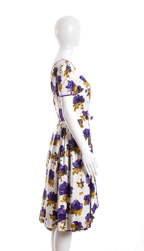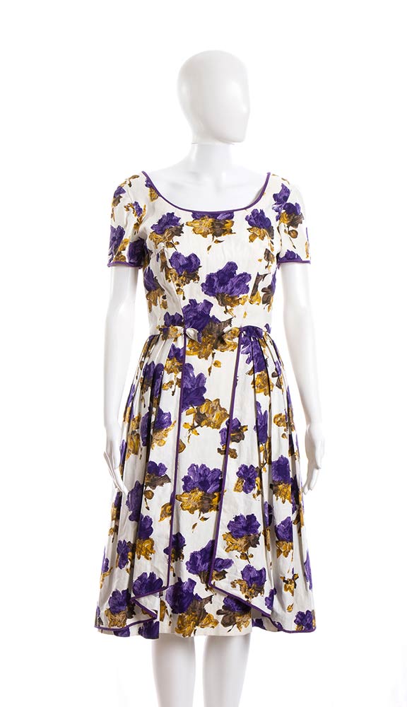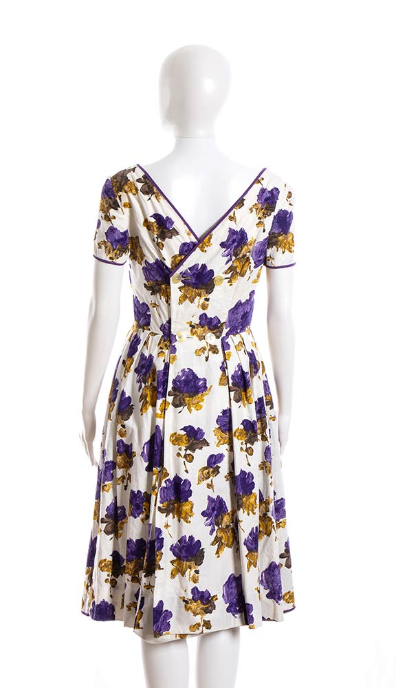 AbitoAbito anni 50 in cotone, motivo floreale in viola e marrone, grado di condizione generale B