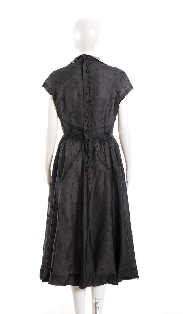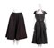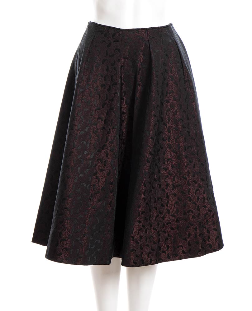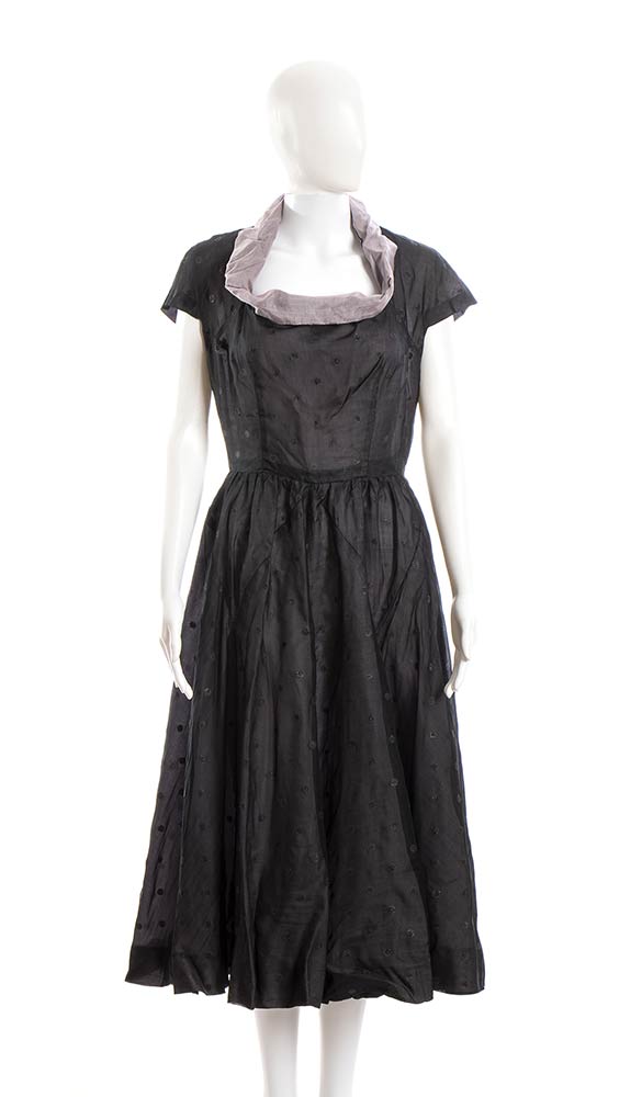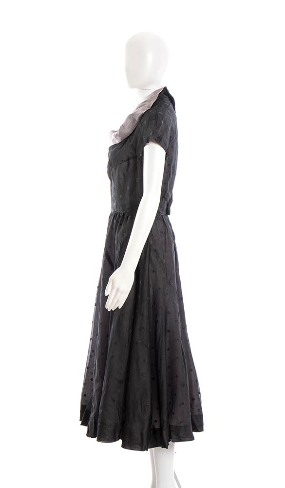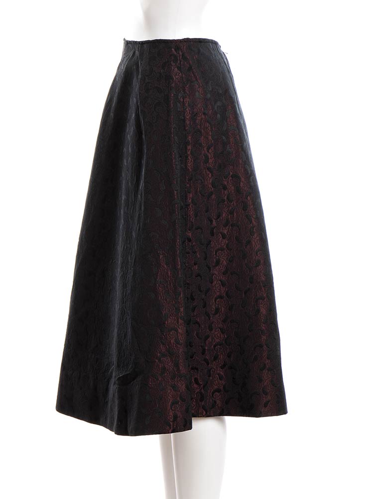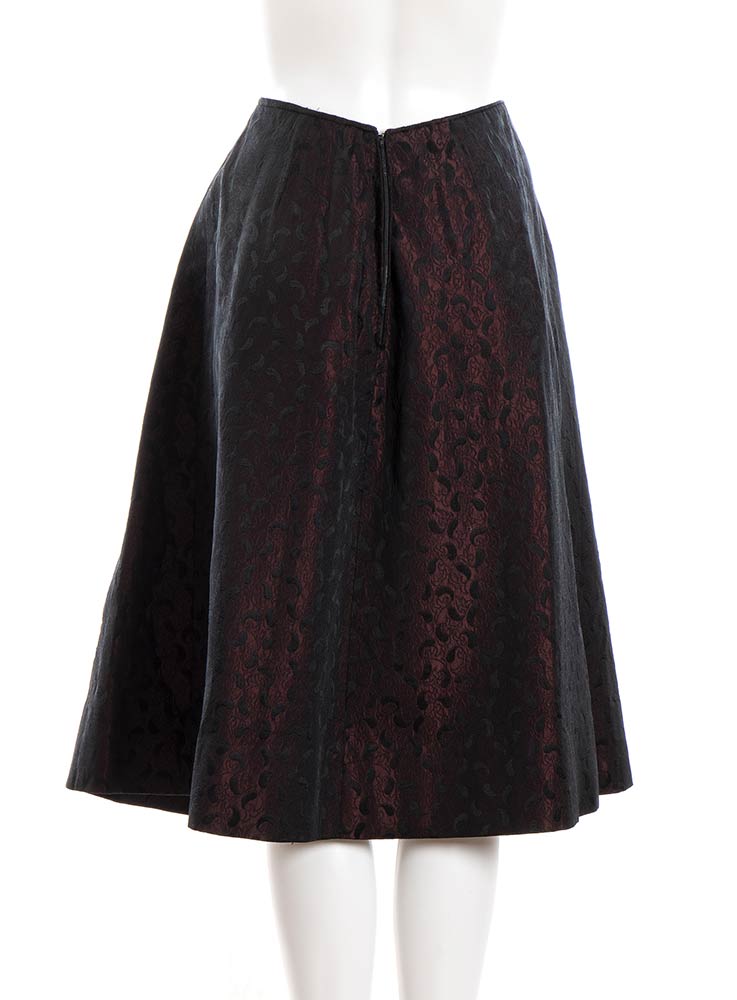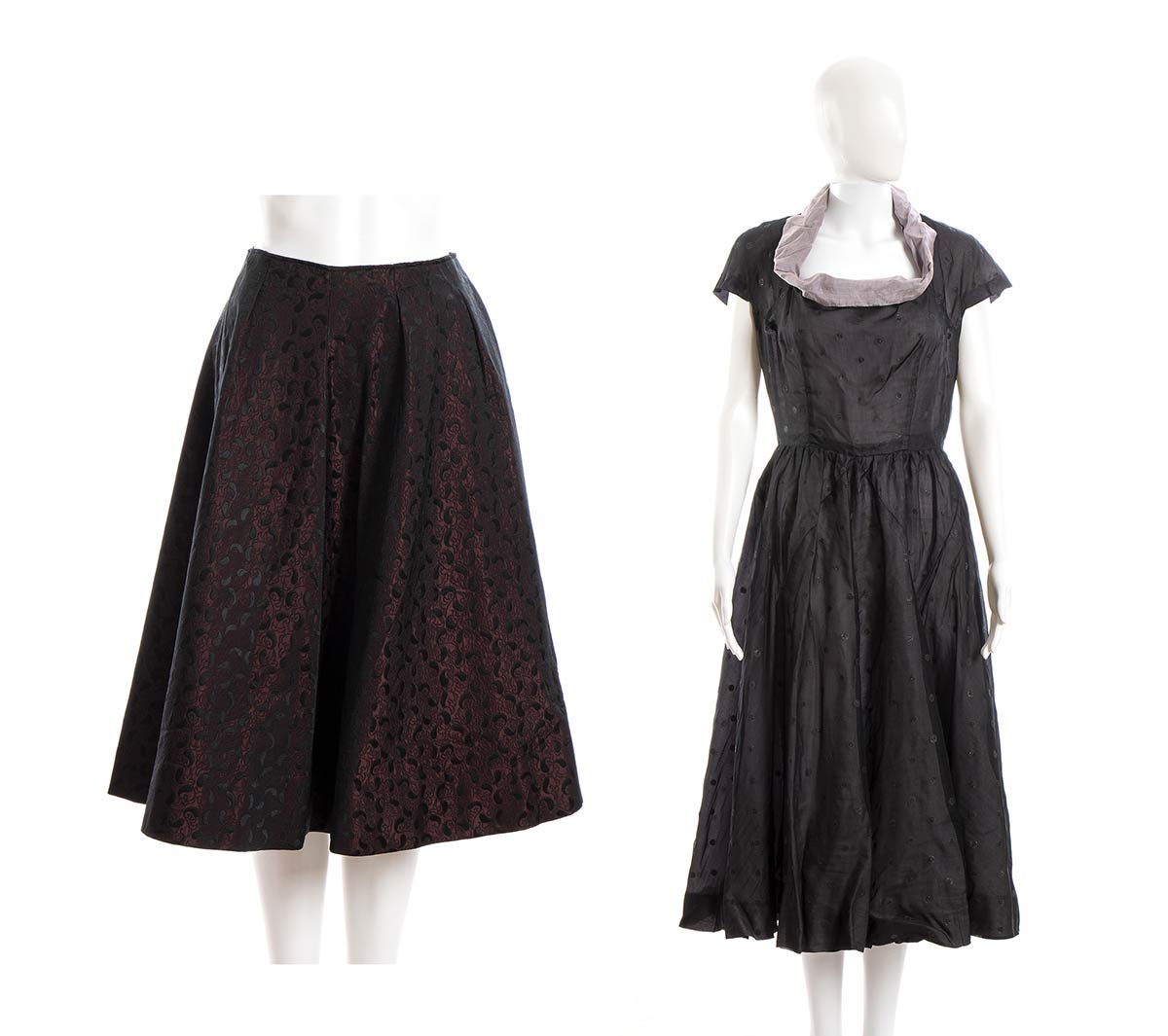 gonna e abito Lotto di 2 articoli anni 50: gonna in seta rosso amaranto lavorazione jacquard, abito in organza nera lavorazione jacquard a pois doppiato rosa, grado di condizione generale B