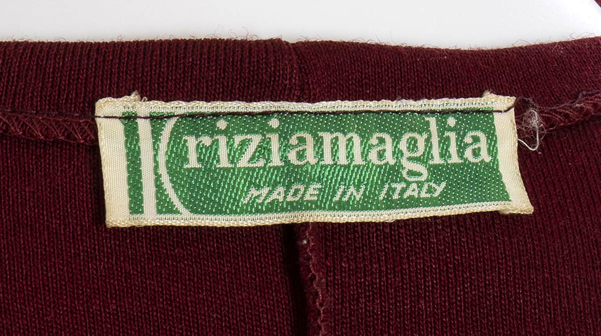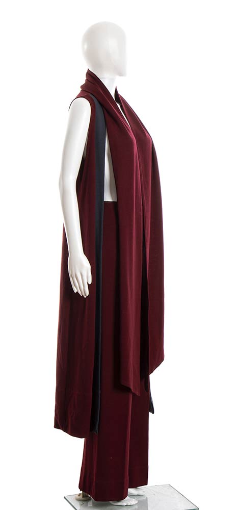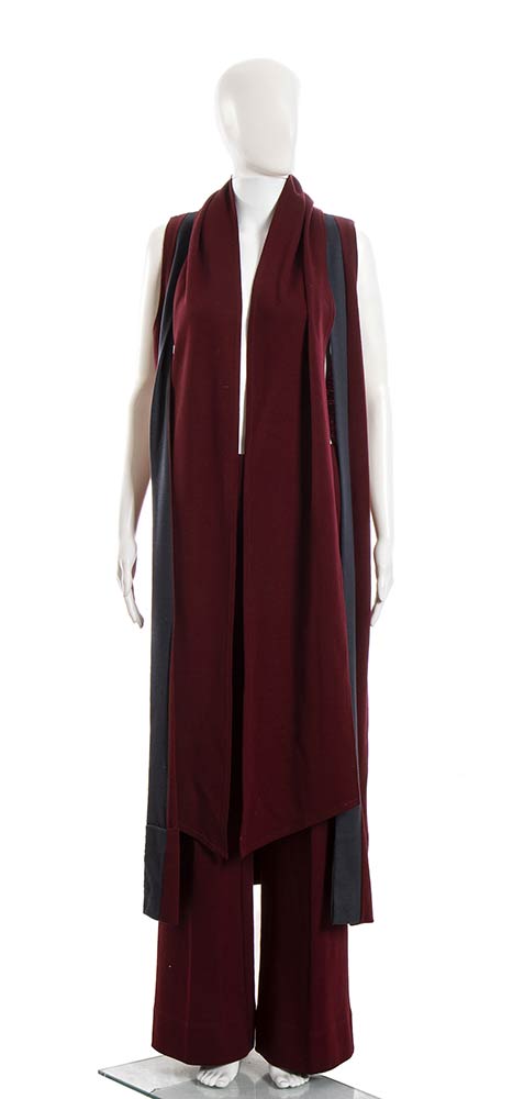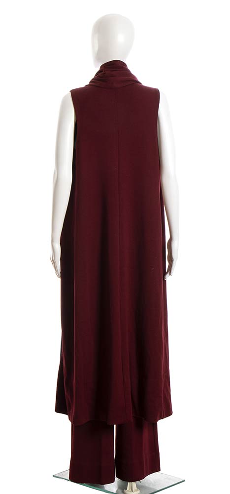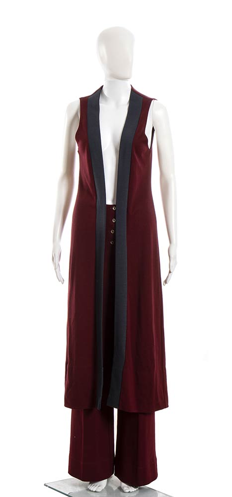 Kriziacompleto Krizia anni 70 Completo (maxi cardigan smanicato, pantalone e fusciacca/sciarpa) in maglia di lana vinaccia con dettagli in grigio, grado di condizione generale B.