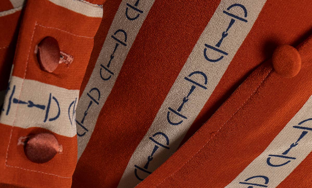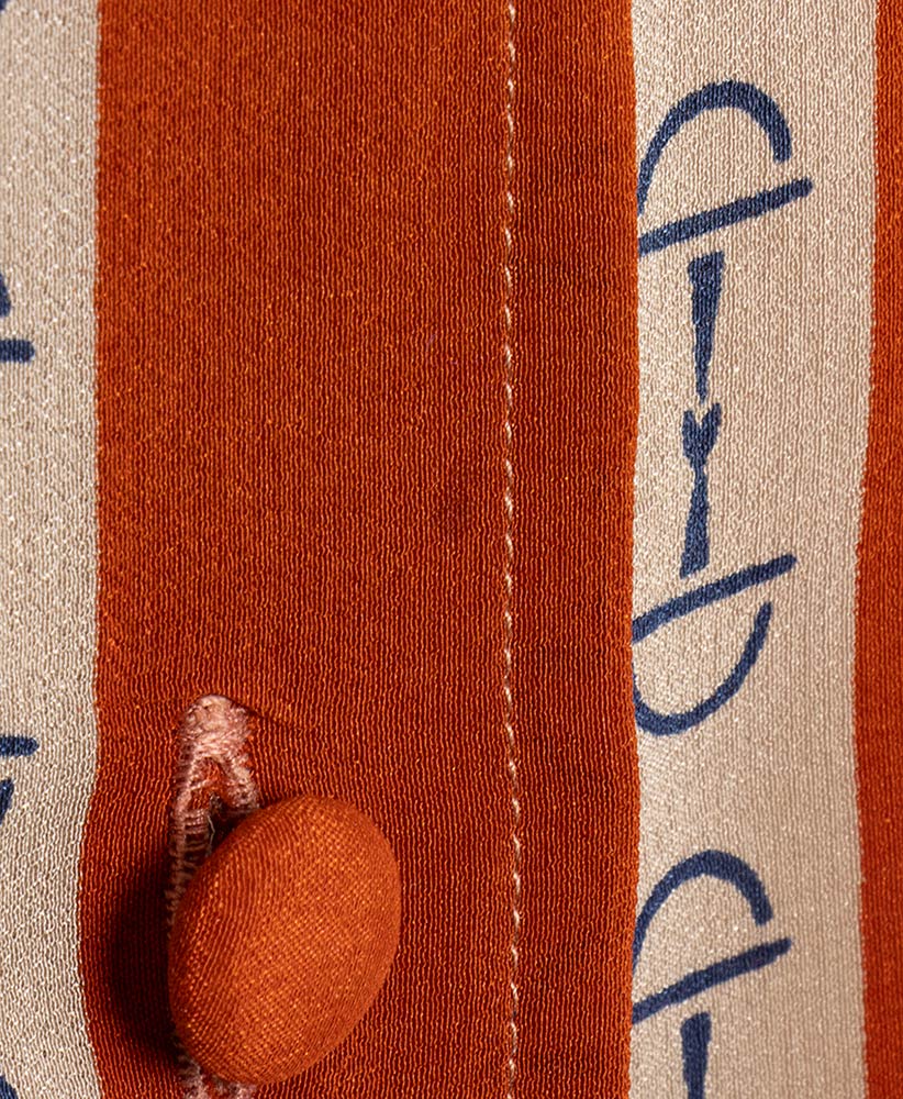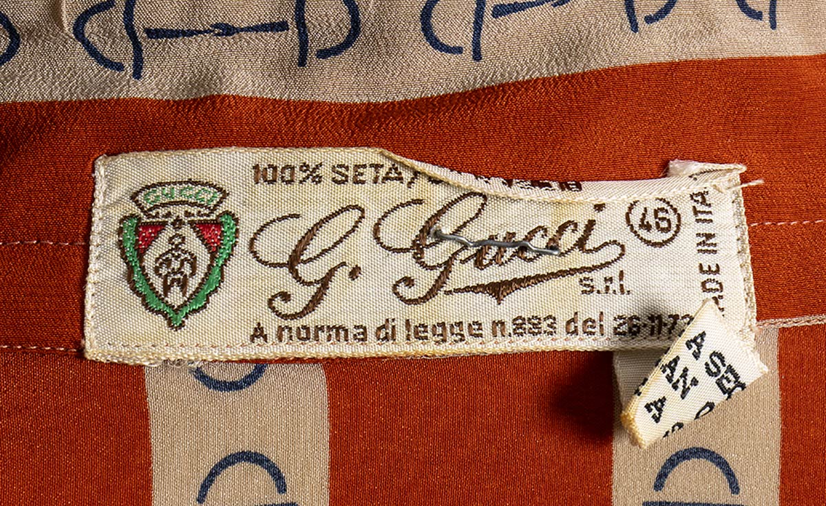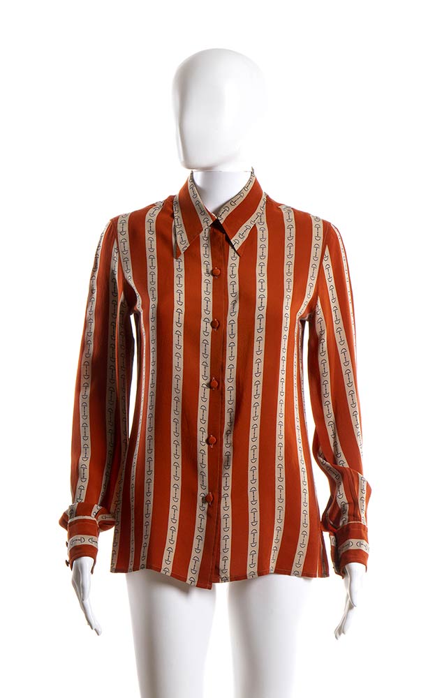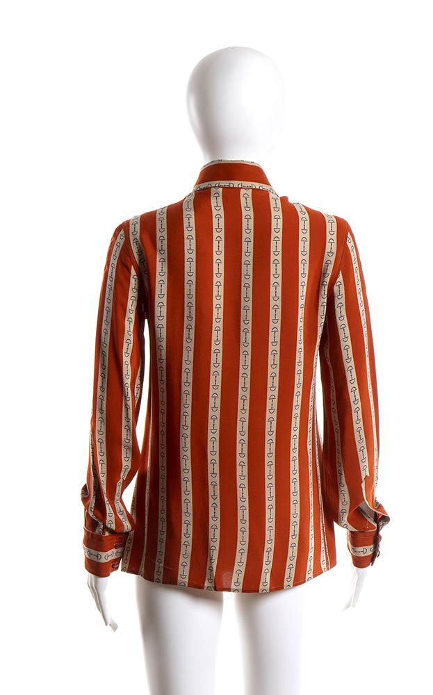 CamiciaGucci camicia anni 70 in seta a righe rosse e bianche, motivo decorativo con morsetto, grado di condizione generale B/C (bottoni sostituiti ai polsi).