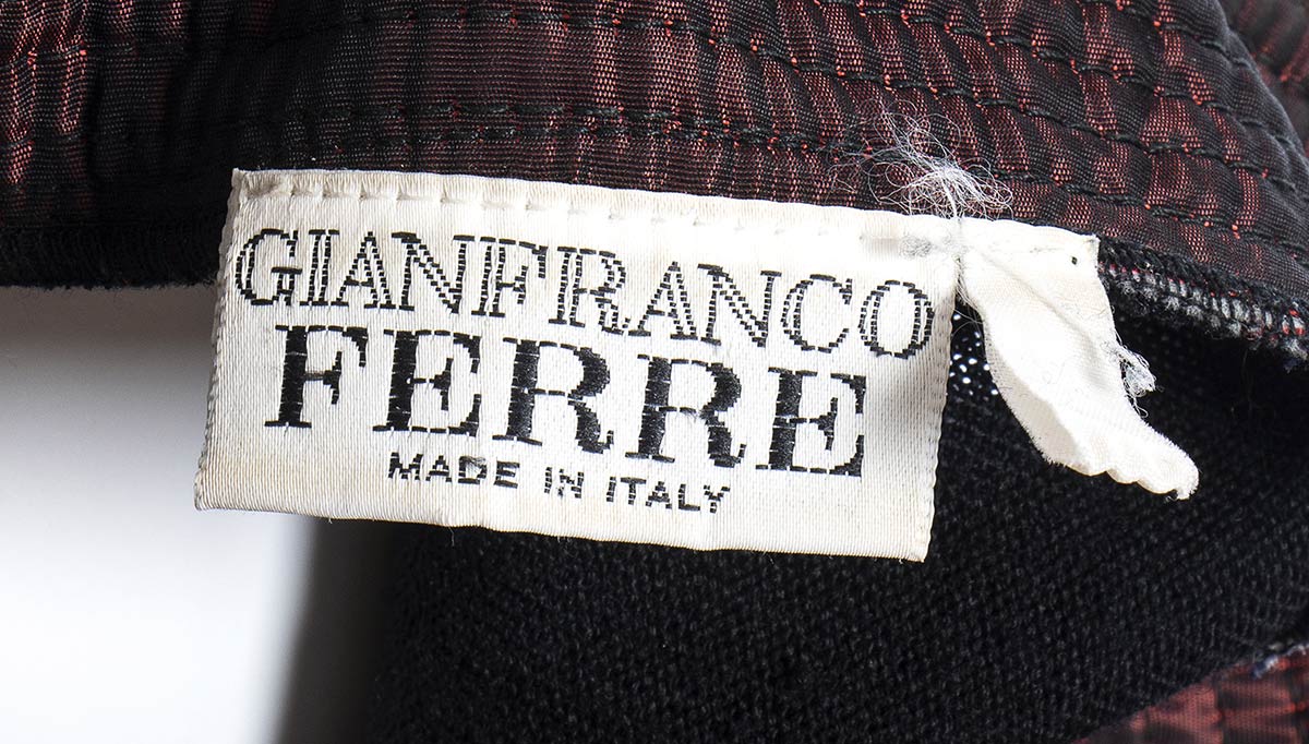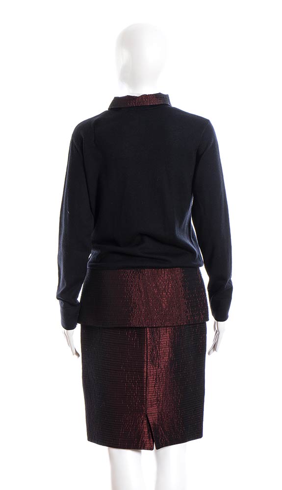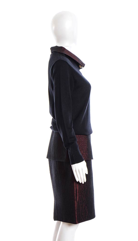 FerrècompletoCompleto Ferrè (maglia e gonna) anni 80: lana nera e seta impunturata rosso amaranto, grado di condizione generale B