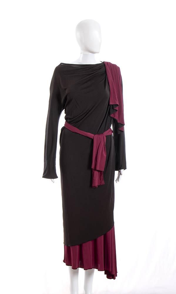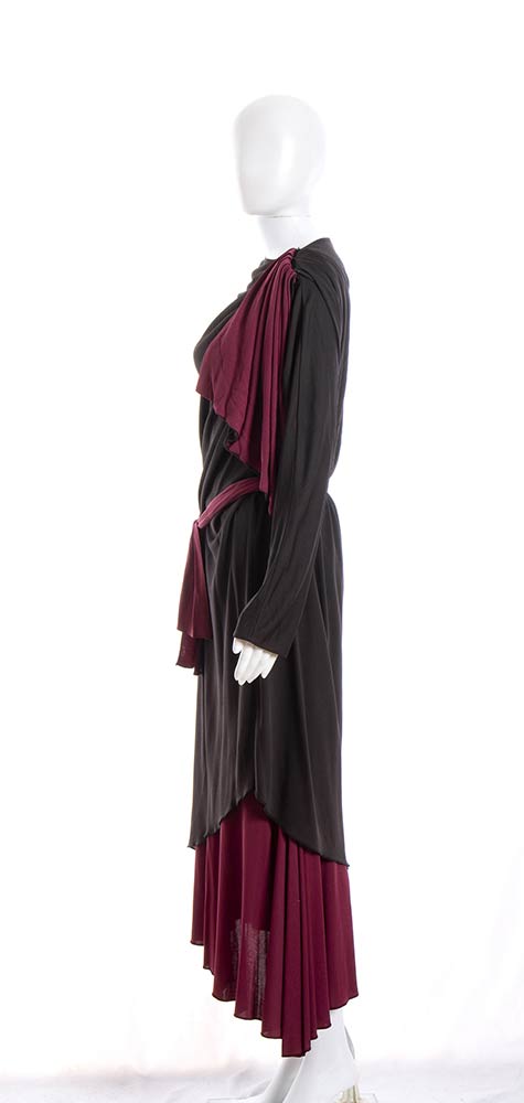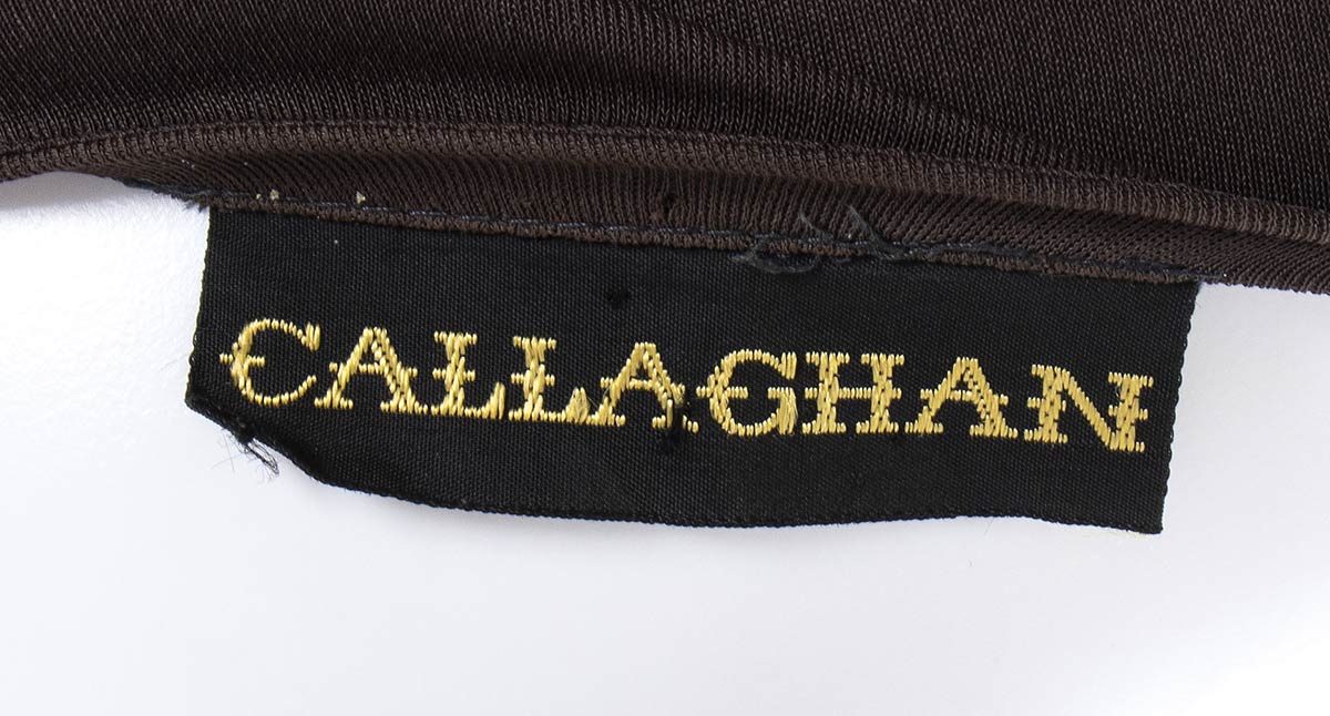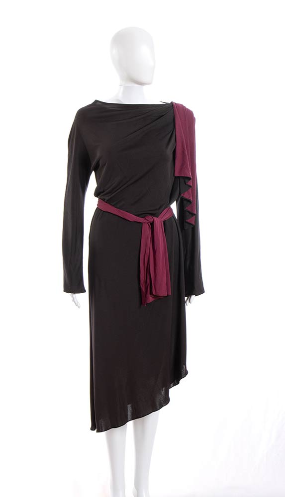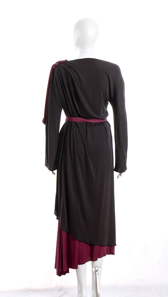 Callaghancompleto Completo (gonna, tunica, cintura) Callaghan 1980 ca in jersey rosa ciclamino e tortora scuro, grado di condizione generale B
