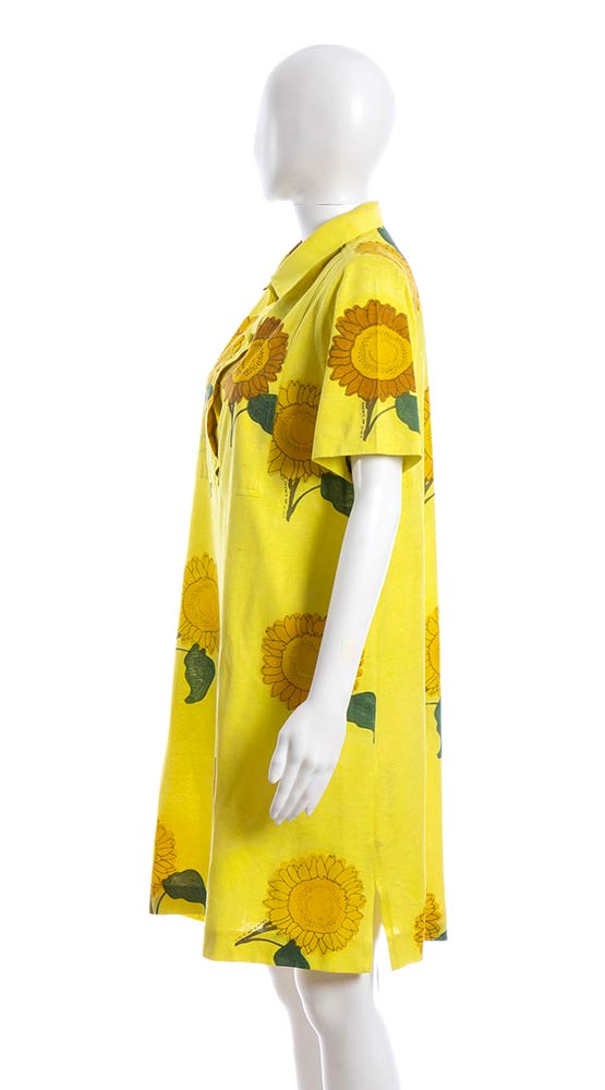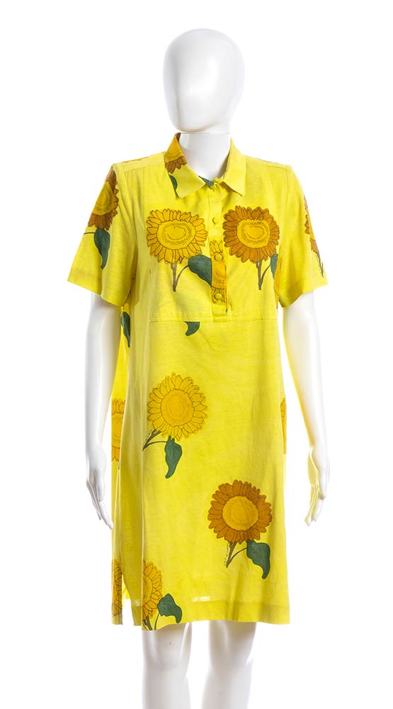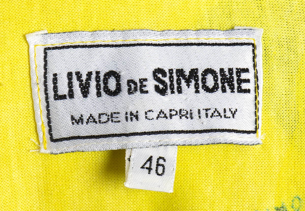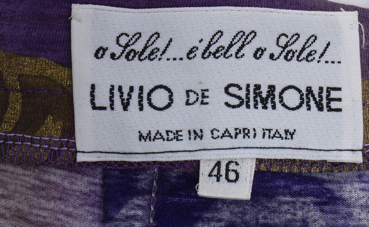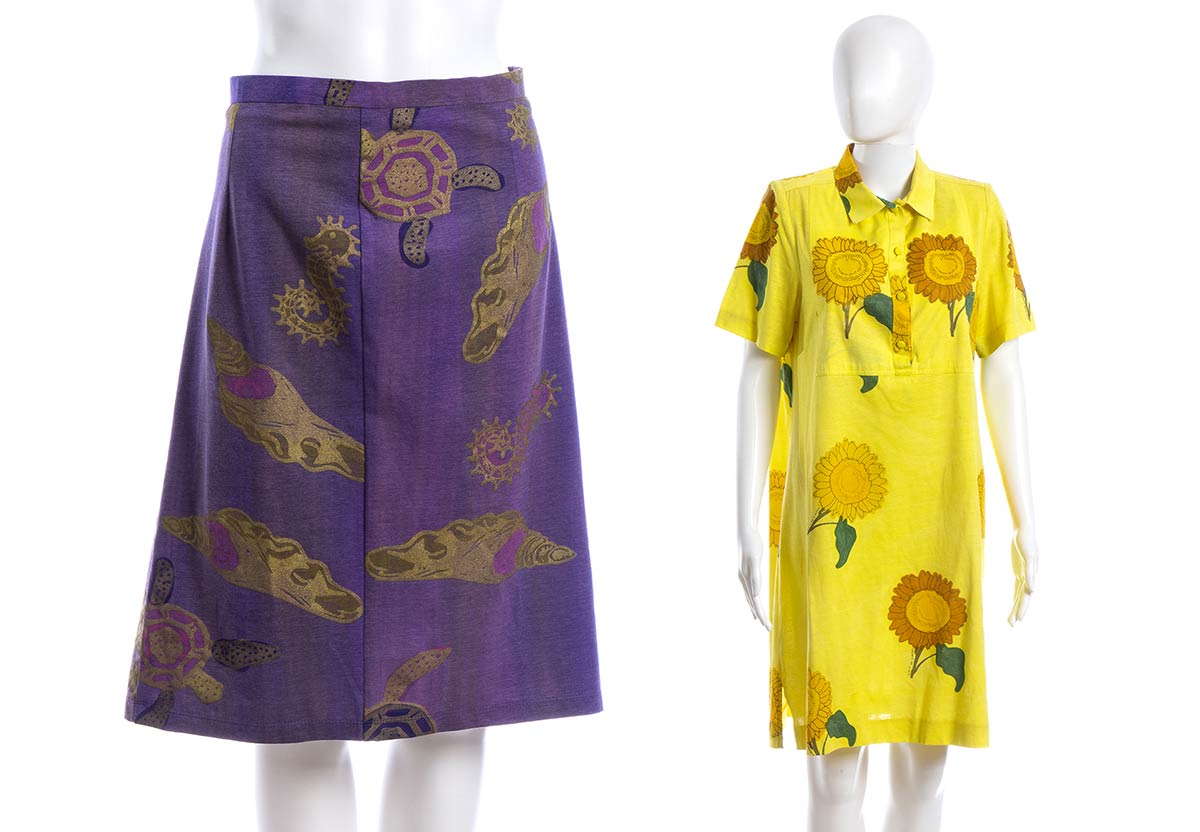 Livio De Simoneabito e gonna Lotto di 2 articoli Livio De Simone fine anni 80/inizio 90: abito in cotone giallo con stampa di girasoli, e gonna in cotone viola chiaro, stampa dorata con vita marina, grado di condizione generale B