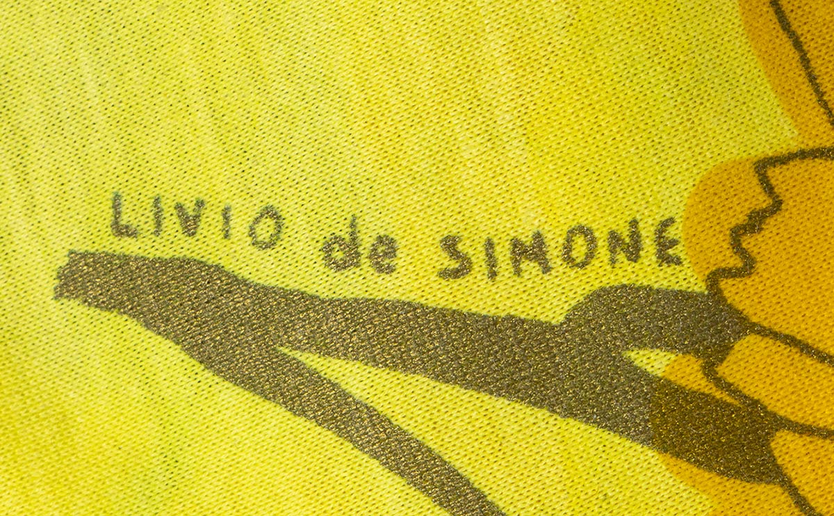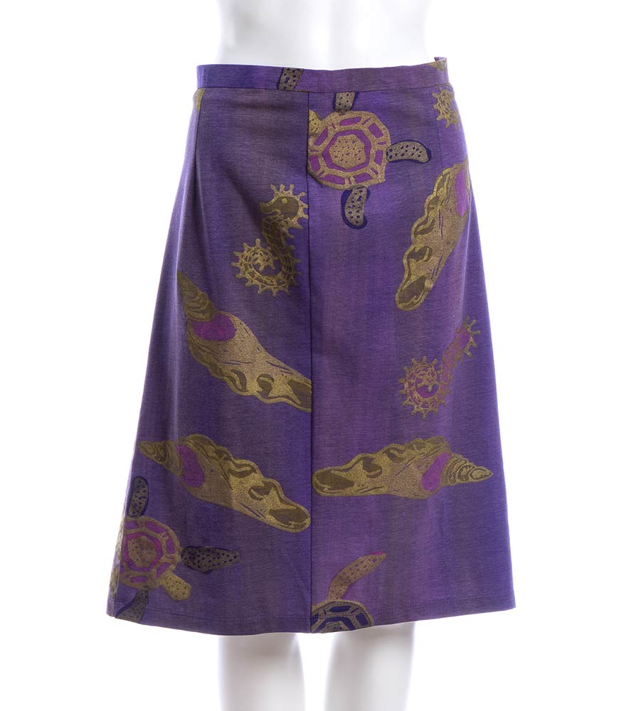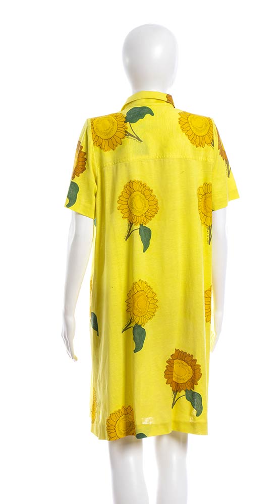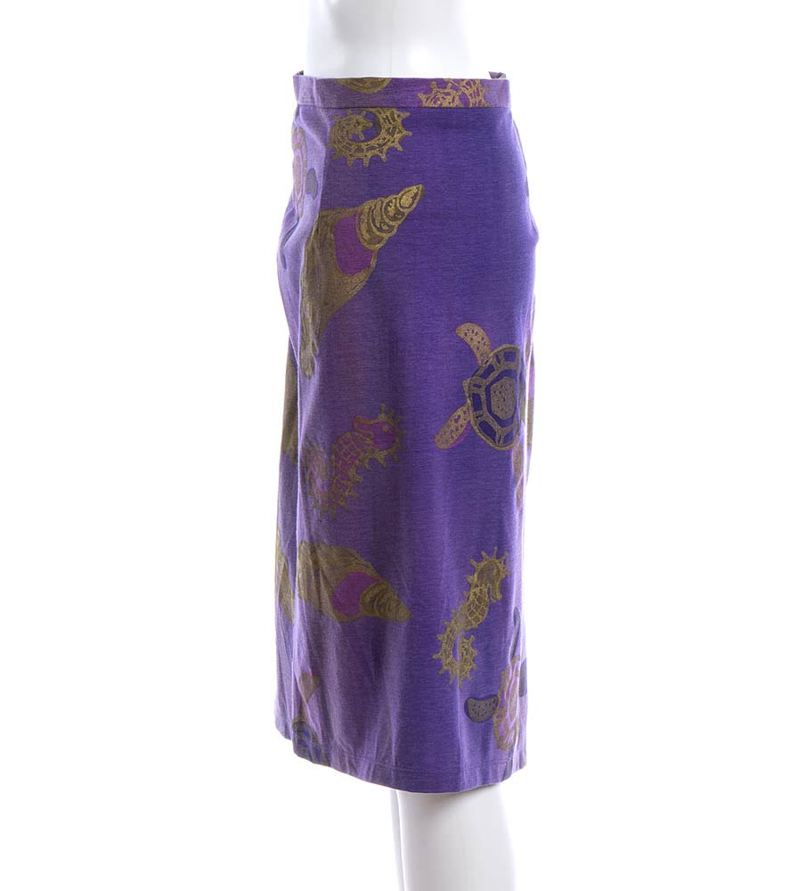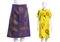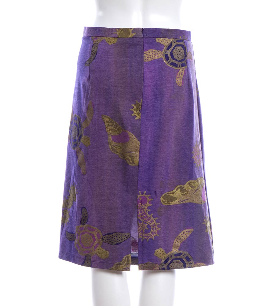 Livio De Simoneabito e gonna Lotto di 2 articoli Livio De Simone fine anni 80/inizio 90: abito in cotone giallo con stampa di girasoli, e gonna in cotone viola chiaro, stampa dorata con vita marina, grado di condizione generale B