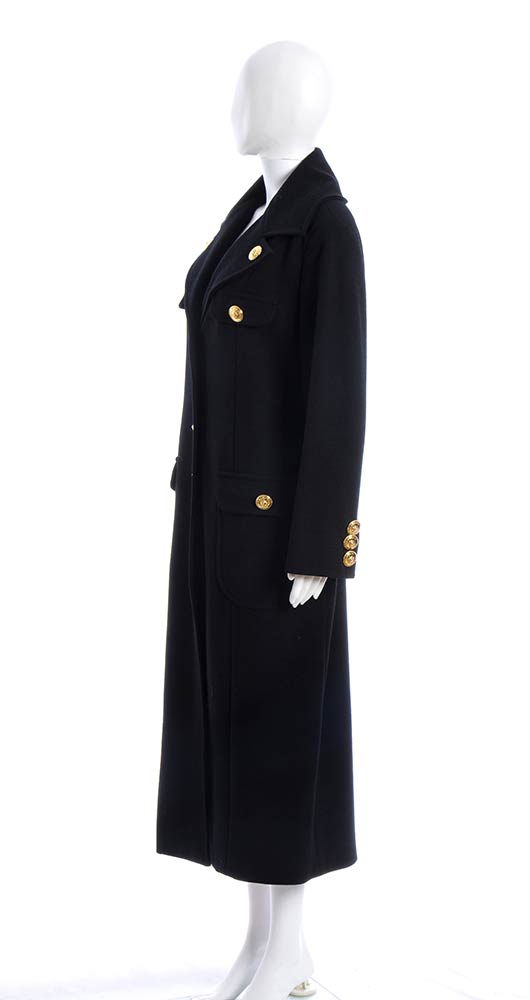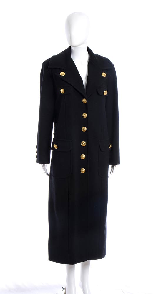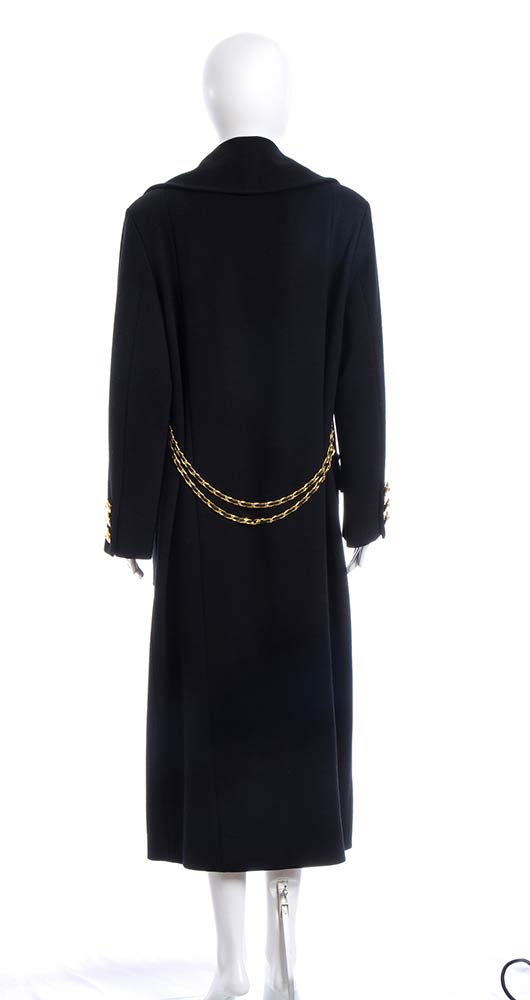 Rocco BaroccoCappottoCappotto in maglia di lana nera Rocco Barocco anni 90, bottoni e martingala in metallo dorato, grado di condizione generale B