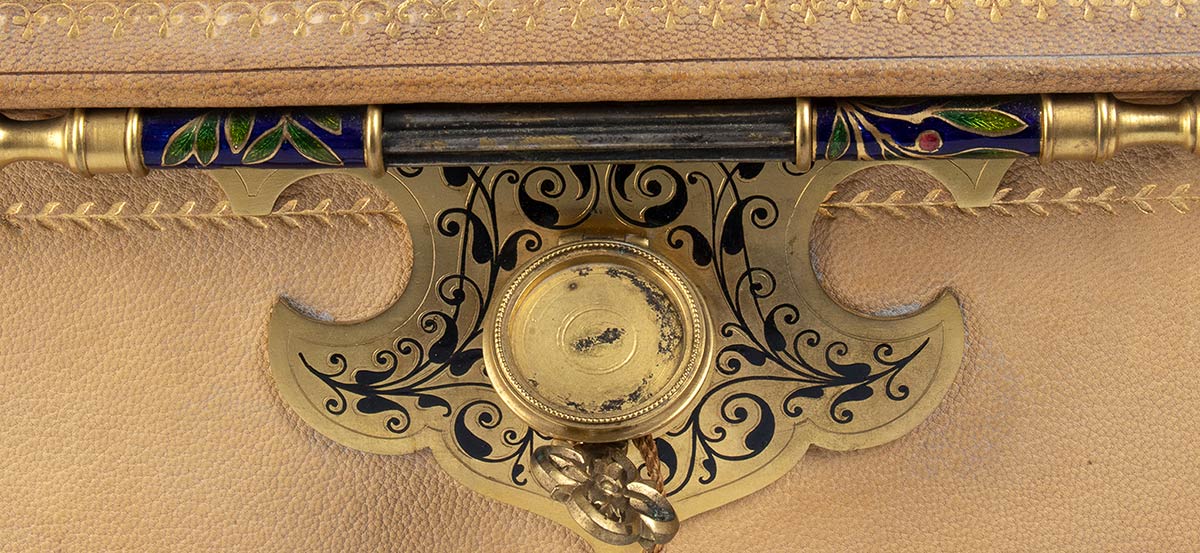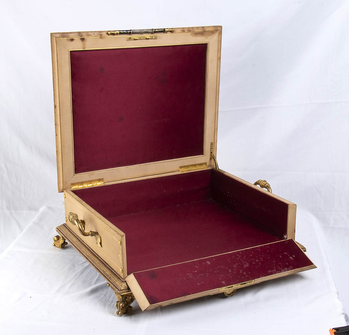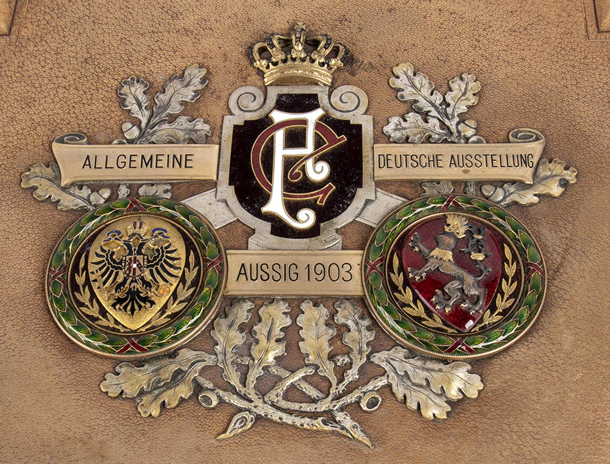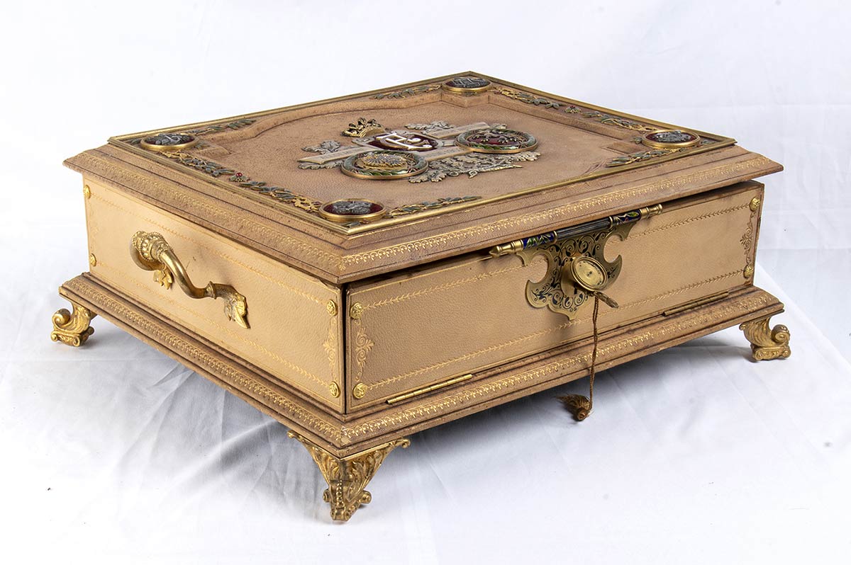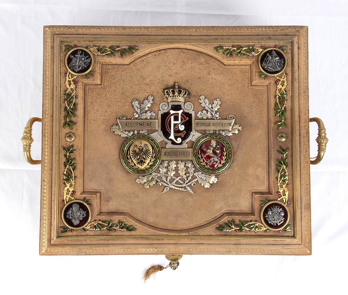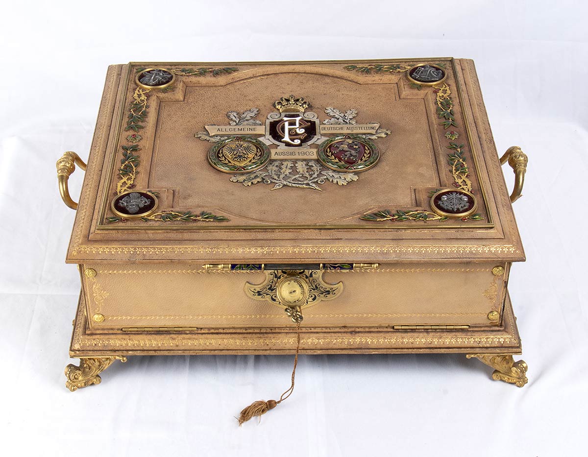 Austria / CecoslovacchiaScatola in legno e smaltiScatola porta documenti in legno, rivestita in pelle, con due manici laterali, quattro piedi di appoggio e ferramenta in bronzo dorato, smalti colorati con dettagli guilloche, particolari in lamina d'argento o metallo argentato. Usata per contenere un premio o dei documenti di riconoscimento per un alto funzionario dello stato austriaco, o persona di merito, in occasione della "ESPOSIZIONE INTERNAZIONALE TEDESCA del 1903", come evidente dall'incisione "ALLGEMEINE DUTSCHE AUSSTELLUNG AUSSIG 1903". Iniziali "C A" con corona dorata applicata, smalti bianco e rosso in stemma centrale; il fregio di sinistra (smalti colorati con aquila bicefala dall'impero Asburgico) ed il fregio di destra (smalti colorati con leone elmato) a rappresentare il simbolo della città di Ústí nad Labem - Aussig, all'epoca Austria, ora città cecoslovacca; serti di alloro e quercia; medaglioni con applicazioni in probabile argento dei simboli delle arti e mestieri ai quattro angoli del coperchio; serti di alloro e quercia in lamierino argentato, a smalti dorato, verde e rosso; cerniere con dettagli smaltati; pelle color rosato con ricami dorati. La scatola si apre da una serratura a scomparsa, con un grande vano portaoggetti rivestito in velluto rosso. In eccellente stato di conservazione, smalti integri, dettagli integri, lievi segni del tempo alla pelle. Misura cm. 45x39x20