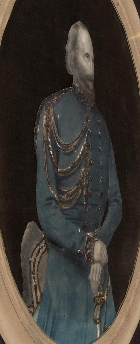 Non identificatoGiuseppe GaribaldiQuadro a composizione ottica, raffigurante Giuseppe Garibaldi in uniforme da Generale Sabaudo, Regno d'Italia. In tunica azzurra, doppia fila di bottoni, cordelle e feluca. Elaborazione su supporto di carta, sagomato e piegato, in maniera da rendere la fruizione del ritratto quasi tridimensionale. In cornice. Interessante cimelioMisure circa cm.54x47 , buone condizioni