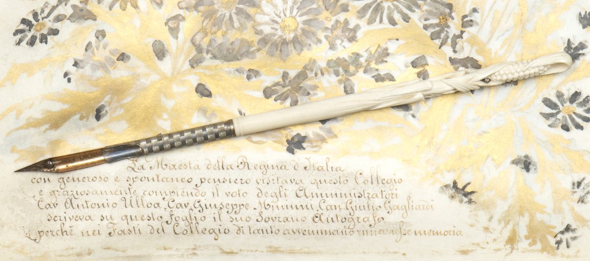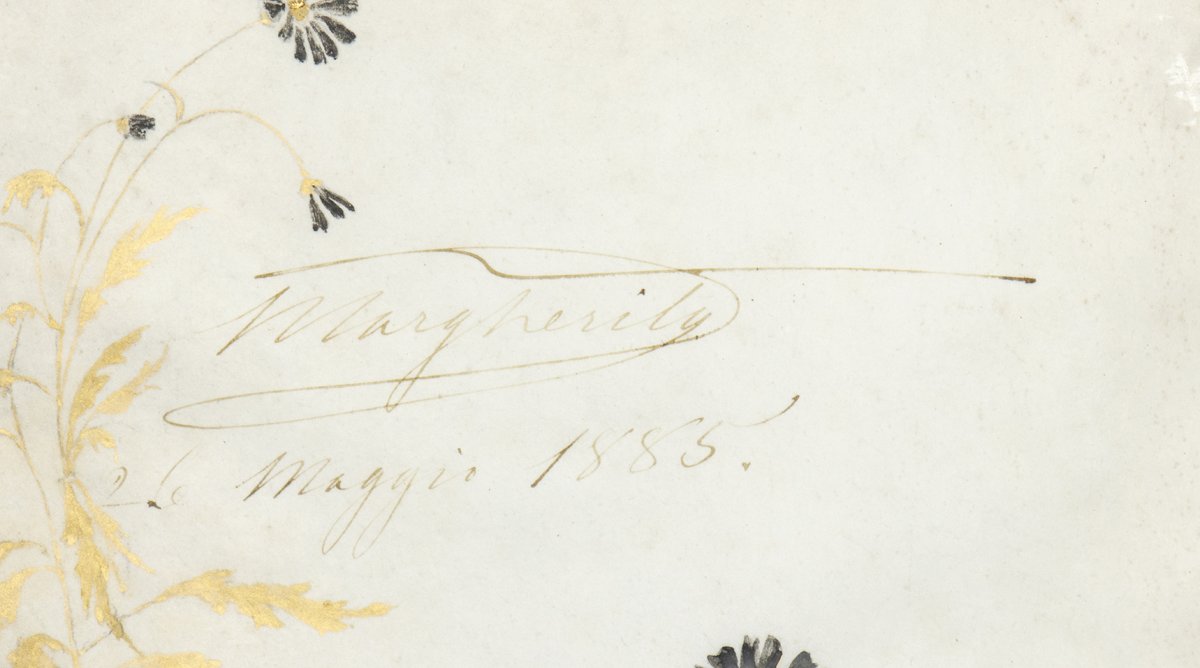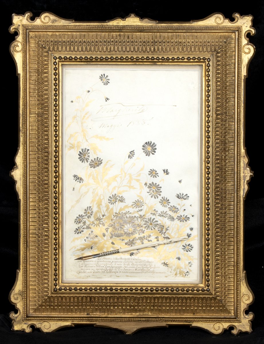 Regina Margherita di Savoia (Margherita Maria Teresa Giovanna di Savoia-Genova; Torino, 20 novembre 1851 - Bordighera, 4 gennaio 1926)AutografoBel cimelio con autografo della Regina Margherita. Foglio dipinto ad acquarello, con piante di margherite, recante in basso la descrizione dell'evento della visita ad un collegio, il giorno 26 Maggio 1885. La firma e la data sono autografe della Regina d'Italia , SAR Margherita. Nel cimelio troviamo la penna ad inchiostro originale usata per la firma dalla Regina.In ottime condizioni, cornice coeva. Misure circa cm.37x24 del foglio autografo, e cm.56x43 la cornice