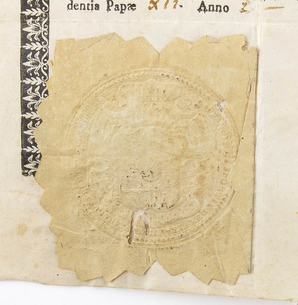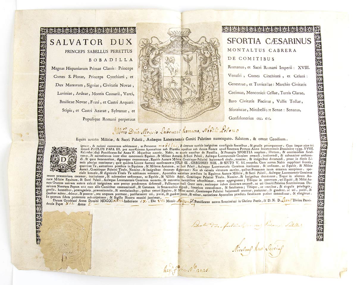 Duca Cesarini SforzaSperon d'OroAttestato di conferimento del Cavalierato dello Speron d'Oro (Equiti Aurate Militiae) assegnato dal Duca Cesarini Sforza (dal privilegio ereditario) ad Aloisio Labruzzi, su carta pergamena, stampato e scritto a mano, datato 1823Buone condizioni, pieghe e segni d'uso