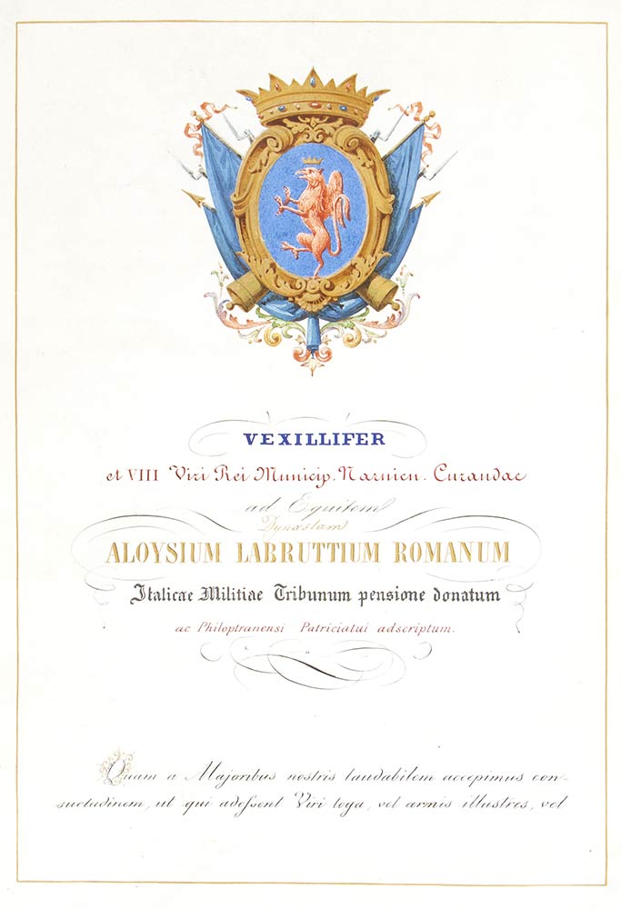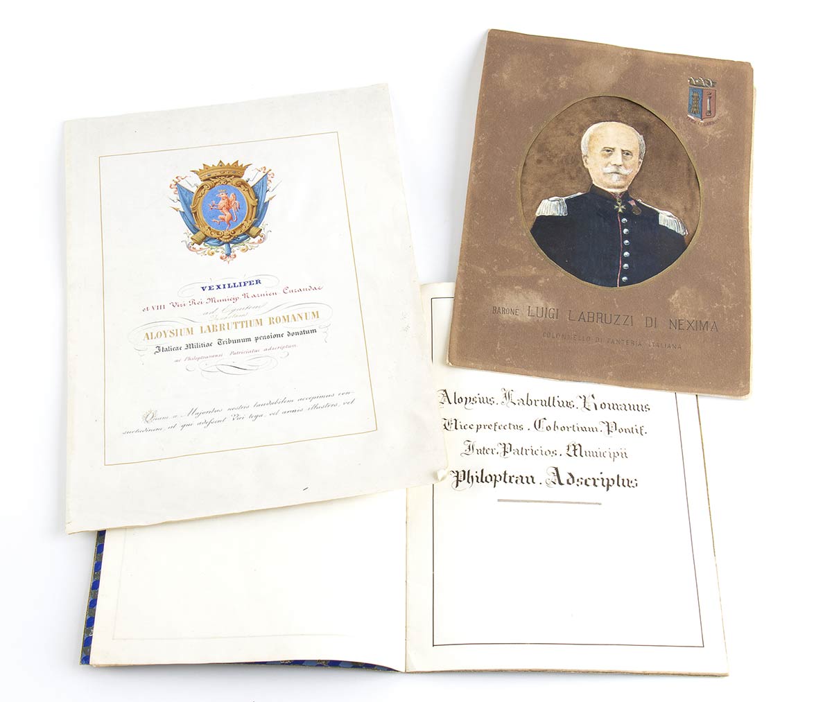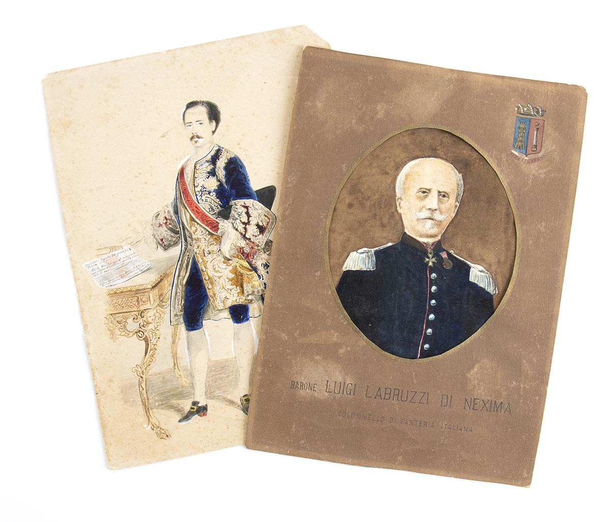 Non identificatoDocumenti Lotto di documenti della famiglia Labruzzi di Nexima. Cartella dipinta a mano con il ritratto del Barone Luigi Labruzzi di Nexima, ritratto acquarellato di nobile, cartella del comune di Filottrano con patente di titoli onorifici dell'Aloisio Labruzzi, sotto PIO IX, anno 1858Buone condizioni, segni d'uso e del tempo