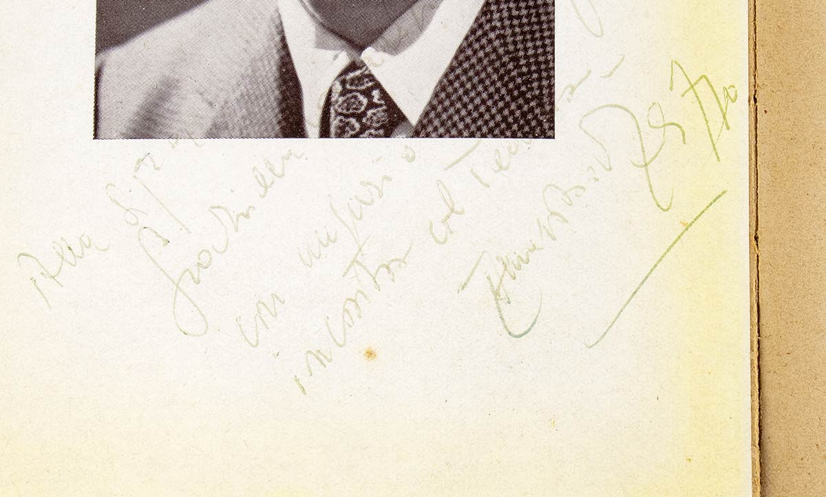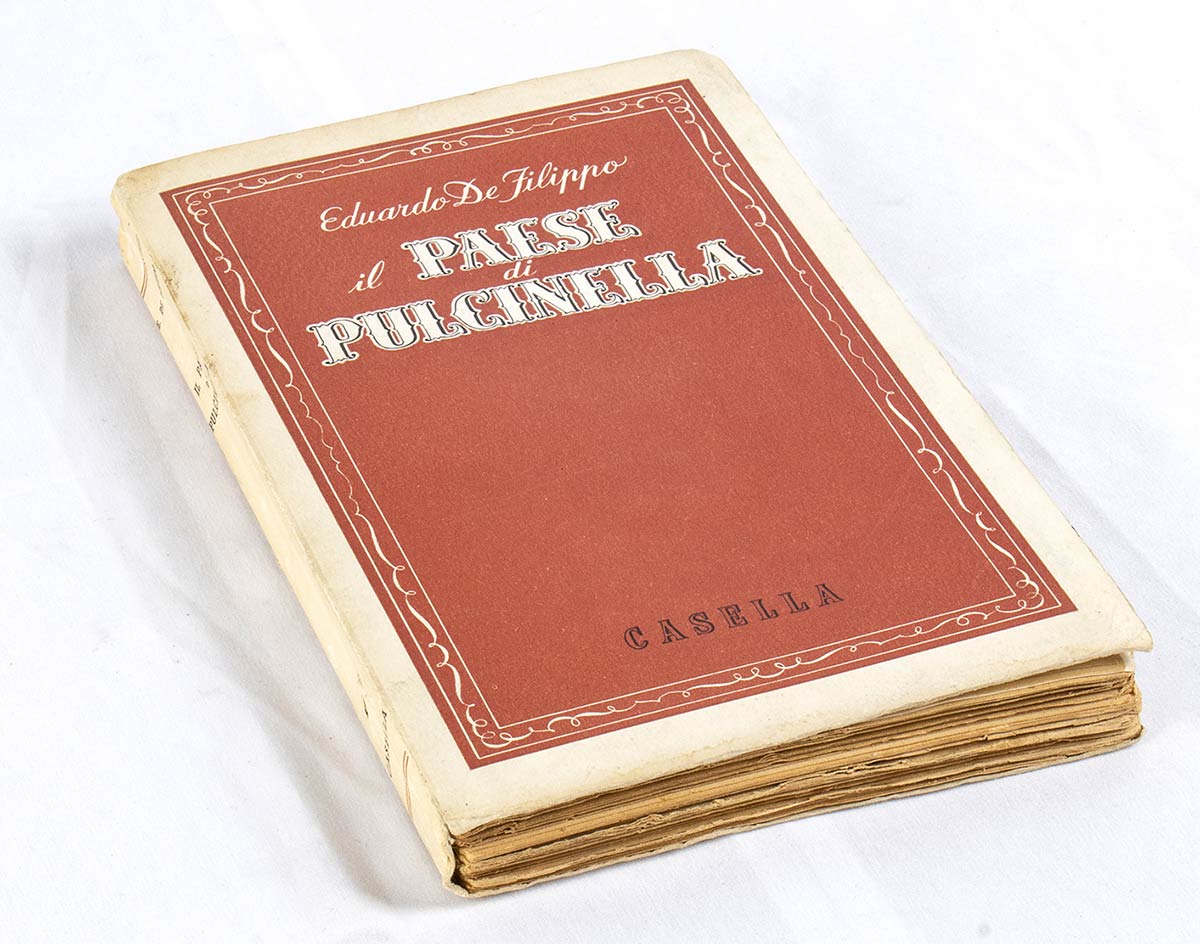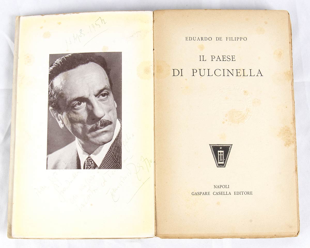 De Filippo, Eduardo (Napoli, 24 maggio 1900 - Roma, 31 ottobre 1984)Libro con dedica autografaVolume dal titolo IL PAESE DI PULCINELLA, edito Casella, in brossura, scritto da Eduardo De Filippo nel 1951. In seconda pagina bel ritratto fotografico a stampa dell'attore, con dedica ed autografo originale, scritti di pugno ad inchiostro nero, da Eduardo De Filippo. La dedica e la firma risultano purtroppo sbiaditi, ma comunque leggibili.Discreto stato