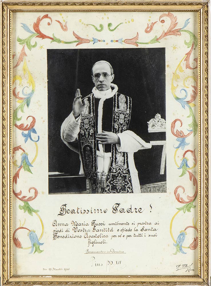 Papa PIO XII (Pius PP. XII, nato Eugenio Maria Giuseppe Giovanni Pacelli; Roma, 2 marzo 1876 - Castel Gandolfo, 9 ottobre 1958)Foto con autografoFoto ufficiale di Papa Pio XII benedicente, applicata su benedizione apostolica del 29 Marzo 1945 rilasciata ad una fedele. Timbro a secco FOTO FELICI riproduzione interdetta. Benedizione autografatata di pugno dal pontefice ad inchiostro neroOriginale, in cornice coeva, insieme in buone condizioni. Misure della cornice circa cm. 31x44