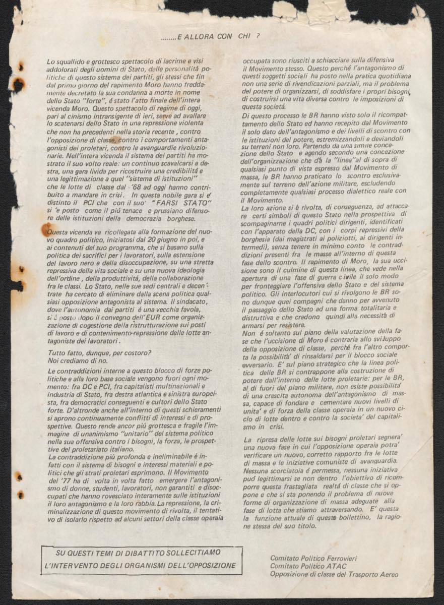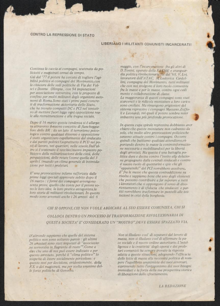 Brigate RosseManifestinoManifestino in foglio, stampato, "Contro la repressione di Stato - Liberiamo i militanti comunisti incarcerati" testo su due colonne, slogan centrale CHI SI OPPONE, CHI NON VUOLE ABDICARE AL SUO ESSERE COMUNISTA, CHI SI COLLOCA DENTRO UN PROCESSO DI TRASFORMAZIONE RIVOLUZIONARIA DI QUESTA SOCIETA' E' CONSIDERATO UN MOSTRO, DEVE ESSERE SPAZZATO VIACondizioni mediocri, macchie, strappi e fori lungo il bordo