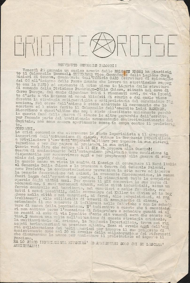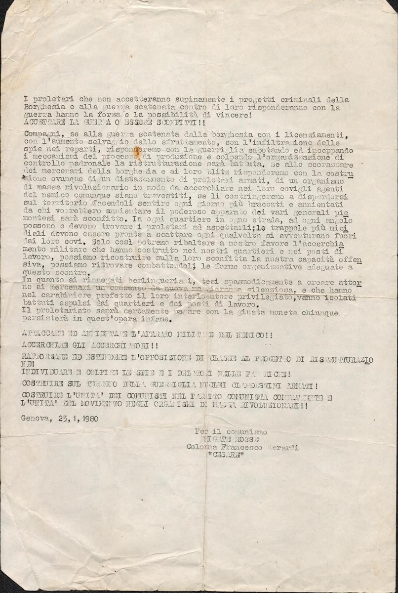 Brigate RosseVolantino omicidio TuttobeneVolantino delle Brigate Rosse, colonna genovese Francesco Berardi "CESARE" , che rivendicano l'esecuzione avvenuta il 25 Gennaio 1980 del Colonnello Emanuele Tuttobene, vice comandante della Legione Carabinieri di Genova, e comandante dell'Ufficio OAIO struttura di spionaggio. Il volantino esordisce con il saluto BENVENUTO GENERALE PALOMBI! L'attentato venne rivendicato dalle Brigate Rosse a mezzo stampa e con la distribuzione di volantini in ciclostile, presso fabbriche, scuole, luoghi di ritrovo pubblici. Il volantino in vendita è una delle copie in ciclostile, quindi originale dell'epoca, di quelle distribuite dalle BR all'epoca dei fatti. Stampato su di un foglio, fronte retro, misura cm. 33x22 ed è in buono stato di conservazione, con segni di piegaturaMisura cm. 33x22 , buono stato di conservazione, con segni di piegatura