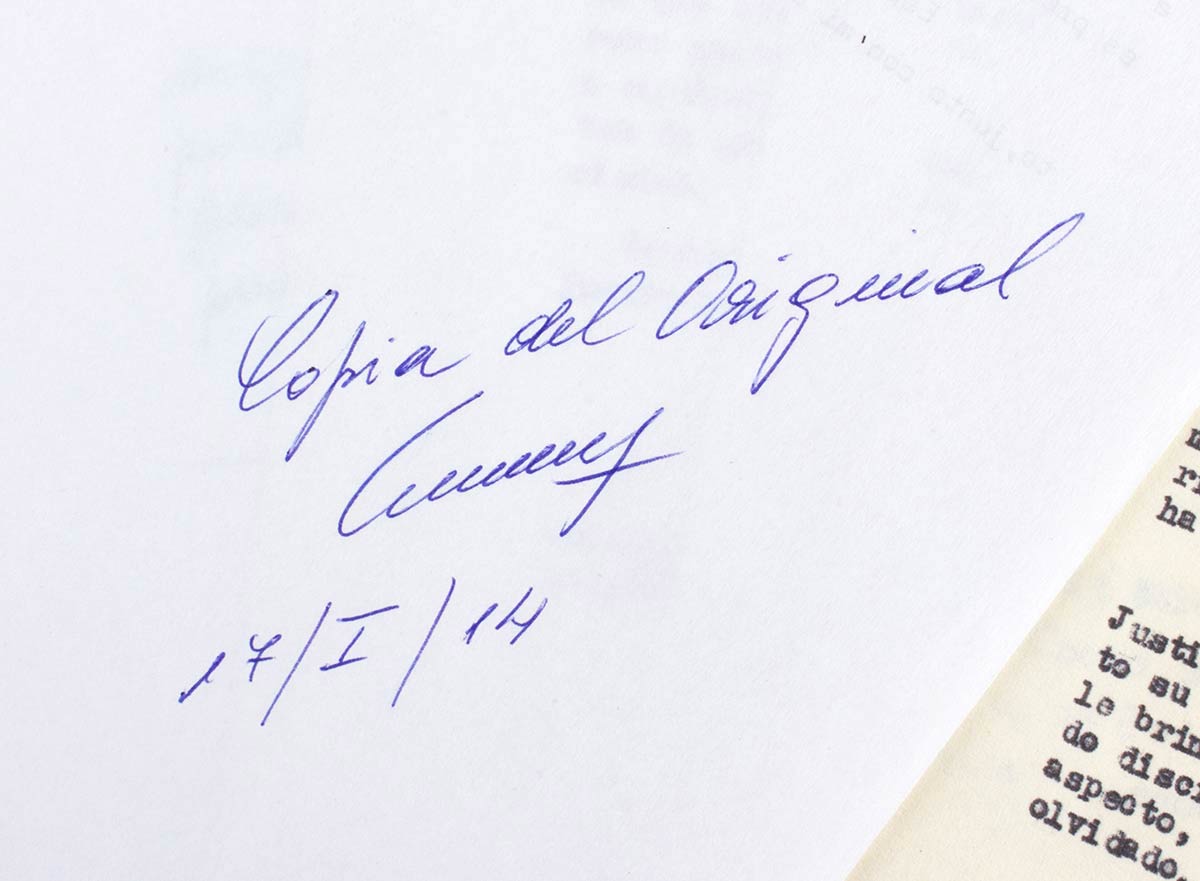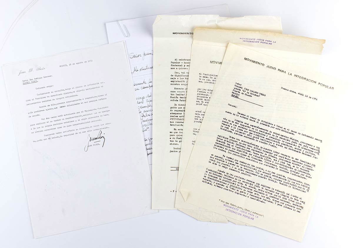 Peron, Evita (nata María Eva Duarte Los Toldos, 7 maggio 1919 - Buenos Aires, 26 luglio 1952)Documenti Documentazione inerente i rapporti intercorsi tra gli esponenti della comunità ebraica argentina e il Generale Perón tra il 1972 e il 1974Correspondencia del Movimiento Hebreo (1972-1974) y otros.a/b) Dos Cartas originales con firmas ológrafas y sellos, del Representante del Movimiento Hebreo, dirigidas al Gral. Juan Domingo Perón, con importante contenido, de fechas 12 y 18 de abril de 1972c/d) Otras dos cartas originales con sello, sin firma, mismo destinatario en tres folios.e) Copia de carta de fecha 22.03.1972, del Movimiento Hebreo, dirigida al Movimiento Árabe en Argentina.f) Copia artículo revista Panorama, publicada en Argentina, por Editorial Abril, agosto 1972. Nota de la visita al Gral Juan D. Perón, en Puerta de Hierro, Madrid, España, de Don Américo Grossmann y el Dr. Alberto Rocamora. Motivó dicho viaje y ecuentro, las inquietudes que tenía la Dirigencia de la Colectividad Judia de Argentina, respecto al pensamiento del Gral Perón, estando próximo su retorno al país, siendo designados para transmitirlas, los dos Dirigentes. Además de lo conversado en Madrid, Américo Grossman y Alberto Rocamora con el Gral Perón, éste le entregó una carta, en la que, a través de Grossmann, expresa su pensamiento a lo planteado.g) Copia de la carta referida en punto f), que le entregó el Gral Perón a Don Américo Grossmann, fechada el 19.08.1972.Tanto Don Américo Grossmann como su Familia, fueron amigos de los miembros de Funpaz durante décadas. Américo, mantuvo siempre una excelente relación con Dirigentes del Justicialismo y del Radicalismo, habiendo propiciado con sus buenos oficios, numerosos diálogos y encuentros.Su Esposa, Doña Susana Szego de Grossman, presidió Funpaz en los períodos 1993 y 1994 y durante años, formó parte del Consejo de Administración.(Ver correspondencia direccionada a Ella, en www.fundacionfunpaz.orgApéndice Daia-Amia.h) Tarjeta personal original de Doña Susana Szego de Grossmann, escrita y firmada al dorso ológrafamente, con el siguiente texto" Mario, te deseo muchas felicidades. A Américo le trajo mucha suerte, ahora quiero que sea tuyo. Con todo mi amor, Susy Grossman, 07.10.88"La tarjeta, acompañaba el objeto que había pertenecido a su Esposo fallecido, y fue un gesto, en la fecha de cumpleaños de Mario Rotundo.Otras referencias de Américo Grossmann y Alberto Rocamora: (éste último, fue Legislador y Ministro del Interior)Américo Grossmann y Alberto Rocamora, fueron los Fundadores, creadores, en la Prov. de Córdoba, de la tan conocida Empresa OCA. Años después de su creación, pasó a administrarla un yerno de Américo, para transformarse luego, en el Emporio que condujo Alfredo Yabrán. A su muerte, pasó a manos de Héctor Colella, y más tarde, su supuesta titularidad, a los actuales presuntos propietarios.i) Copia Carta del Embajador Alejandro Orfila, desde la O.E.A., dirigida a Don Américo Grossmann, en la que expresa sus Condolencias, por el Fallecimiento del Tte. Gral, Don Juan Domingo Perón, del 23.07.74j) Copia carta del Sr. Burraco Benítez al Gral. Juan D. Perón, del 3.10.1972 (dos folios)Buone condizioni, varie, usure normali