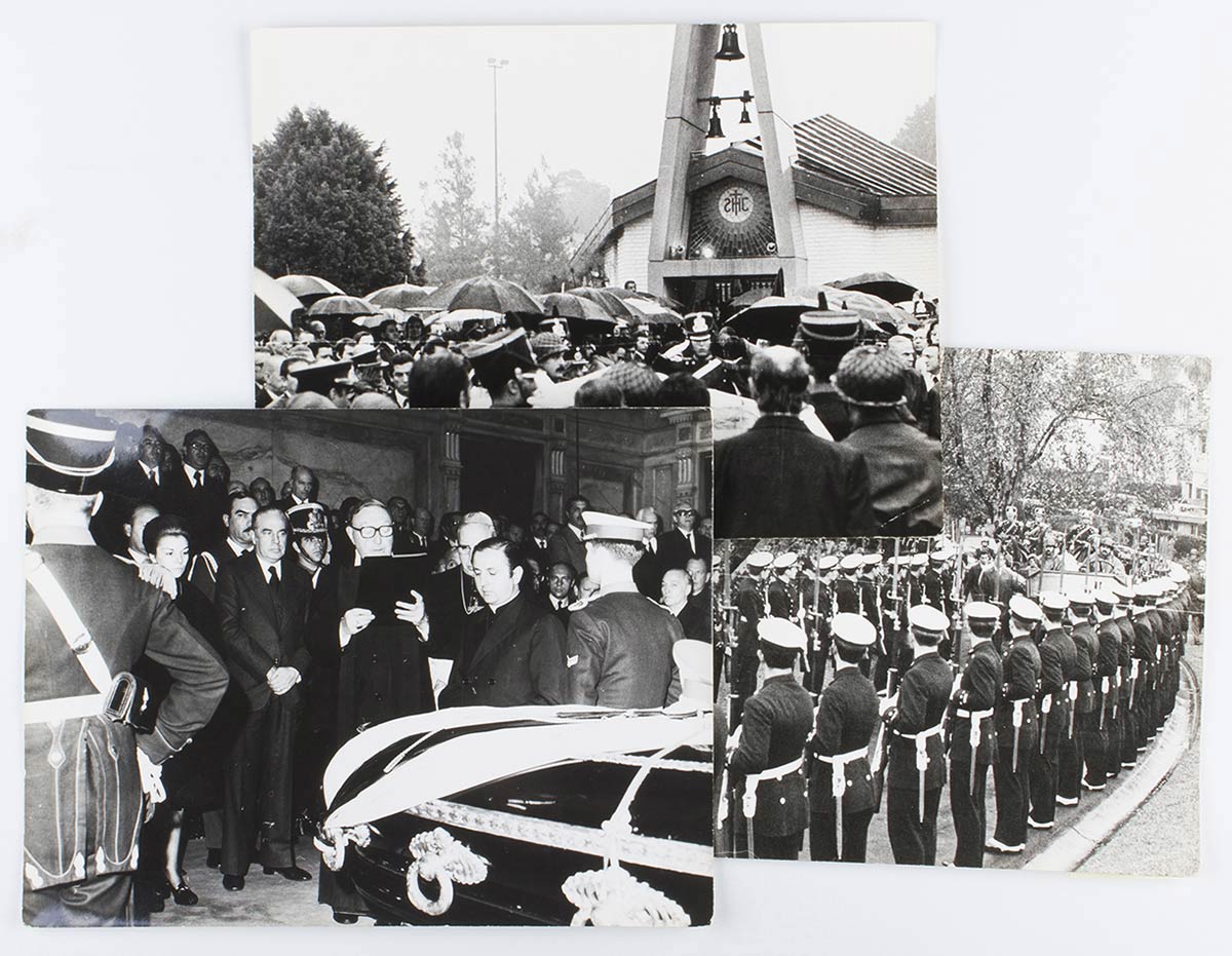 Peron, Evita (nata María Eva Duarte Los Toldos, 7 maggio 1919 - Buenos Aires, 26 luglio 1952)Lotto di fotografieUna serie di quattro fotografie in bianco e nero che sintetizza con emblematica efficacia l’ultima stagione politica di Perón, quella troncata dalla morte a solo un anno dal ritorno in patria.La sequenza si apre con lo scatto dell’abdicazione: Perón, malato, firma un atto di delega delle funzioni presidenziali al vice presidente, la Signora Isabel Martinez, sua terza moglie. La morte sopraggiunge dopo pochi mesi, l’1 luglio 1974. Negli scatti successivi: il funerale di Stato, il corteo funebre e la tumulazione della salma in una cappella del Cimitero della Chacarita a Buenos Aires.Cuatro Fotografías blanco y negro.24 cm x 18 cma) 06.06.74Acto en que, El Jefe de Estado, Tte. Gral. Juan Domingo Perón, Delega su Mando Presidencial, en la Vice Presidente, Doña María Estela Martínez de Perón.b) 02.07.1974Funeral del Jefe de Estado, Tte. Gral. Don Juan Domingo Perón, en Casa de Gobierno de la República Argentina.(Fallecido el 01.07.74)c) 04.07.1974Cortejo Fúnebre del Jefe de Estado, Tte. Gral. Juan Domingo Perón.d) 04.07.74Responso del Jefe de Estado, Tte. Gral. Don Juan Domingo Perón, en la Capilla del Cementerio de la Chacarita, Ciudad de Buenos Aires. R.A.Buone condizioni