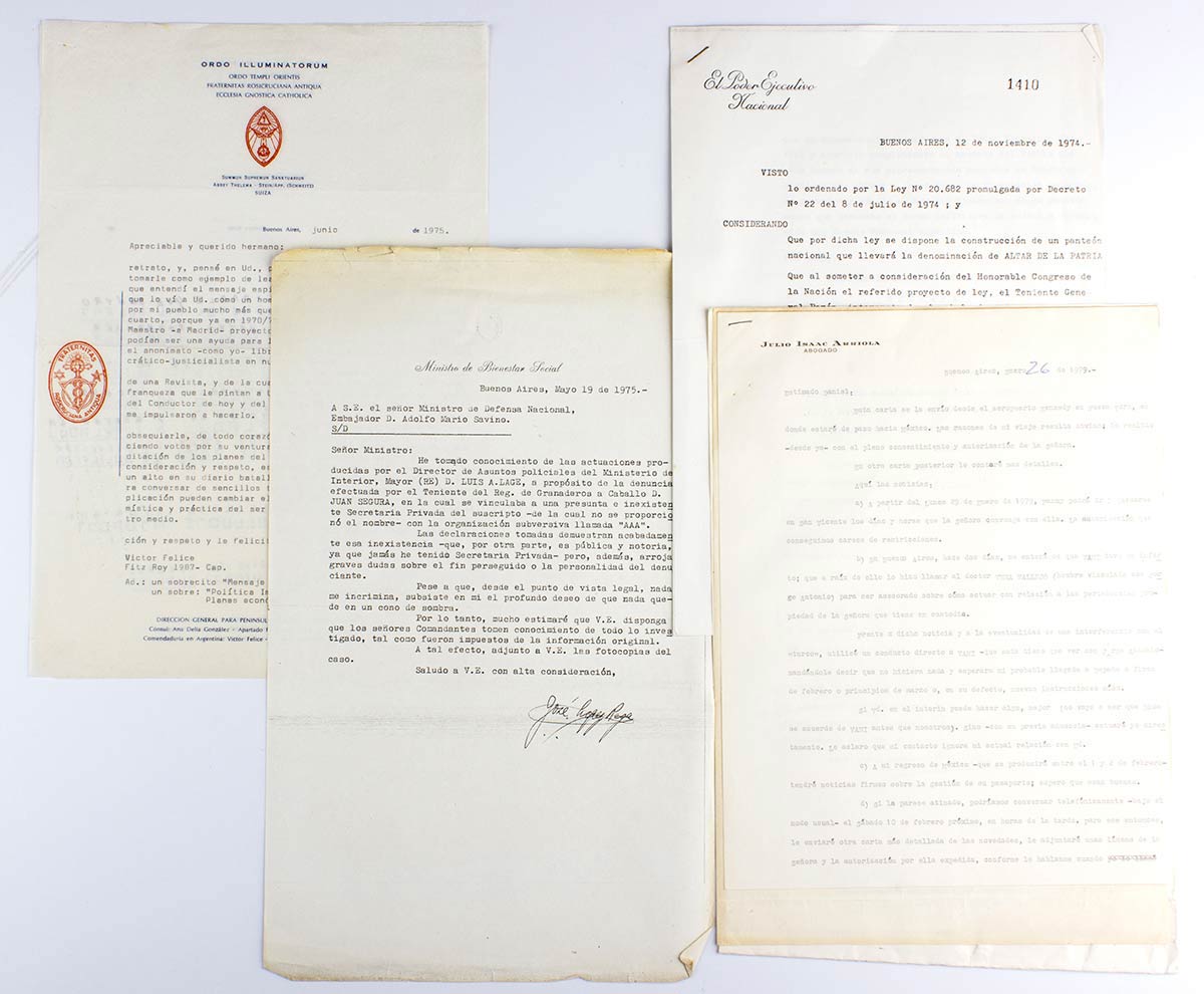 Peron, Evita (nata María Eva Duarte Los Toldos, 7 maggio 1919 - Buenos Aires, 26 luglio 1952)Isabelita - Lotto di documentiUna selezione di documenti nell’ambito della quale si segnalano quelli relativi a Josè Lopez Rega, figura di spicco dell’ultima stagione politica di Juan Domingo Perón, accusato di aver esercitato un’influenza nefasta sul Generale e, soprattutto, sulla moglie IsabelitaLa documentazione inerente Lopez Rega è per larga parte inedita (di particolare interesse venticinque registrazioni su audiocassetta) e risulterà utile per un approfondimento critico della controversa figura dello Stregone, il sulfureo nomignolo che si era guadagnato per via della sua passione per le scienze esoteriche e l’adesione alla Massoneria (fu anche membro della P2 di Licio Gelli). Documentación inédita del Secretario del Matrimonio Perón, que fuera luego Ministro de Bienestar Social, Don José López Rega. Parte de sus archivos: correspondencia, fotos, grabaciones, etc.a) 25 cassettes originales. Como Ministro. Diversas Reuniones, Entrega de Subsidios, Actos. También del período posterior, hasta el final de sus días.b) Carta al Ministro de Defensa, Adolfo Mario Savino, en la que solicita se investigue y eleve a los Comandantes, lo relacionado con cuanto se lo viene queriendo involucrar, de lo que es ajeno. 19.05.1975c) Carta original con firma ológrafa, del Dr Pedro Ángel Vailati, 2 folios.17.02.1977d) Tres articulos en publicaciones de Revistas Las Bases, "Anatomía del Tercer Mundo" de su autoría.e) Carta original con firma ológrafa, que le envía el Movimiento Judio para la Integración Popular, en relación al diferendo que ocasionaron manifestaciones suyas. 10.08.1972f) Telegrama al Dr Juan Carlos Ortíz, en que le revoca poderes, por imposibilidad de hacer frente a los honorarios.g) Télex original de la agencia France Presse enviado al de Puerta de Hierro, consultando, ante llamados de pretendidos Montoneros, que aseguraban haber abatido a Lopez Rega...h) Foto en reunión junto a Triaca, Lorenzo Miguel, José I. Rucci, José Rodríguez, Isabel Perón, y otros Sindicalistas.i) Foto con Grupo de Políticos.j) Foto suya tomada en el exterior.k) informa el Ing. Juan Carlos Basile, Secretario de Vivienda, memo sobre lo actuado en su area.l) Cinco cartas originales con firmas ológrafas, que le dirige el Dr. Julio Isaac Arriola. Distintas fechas. Contenido importante.