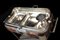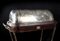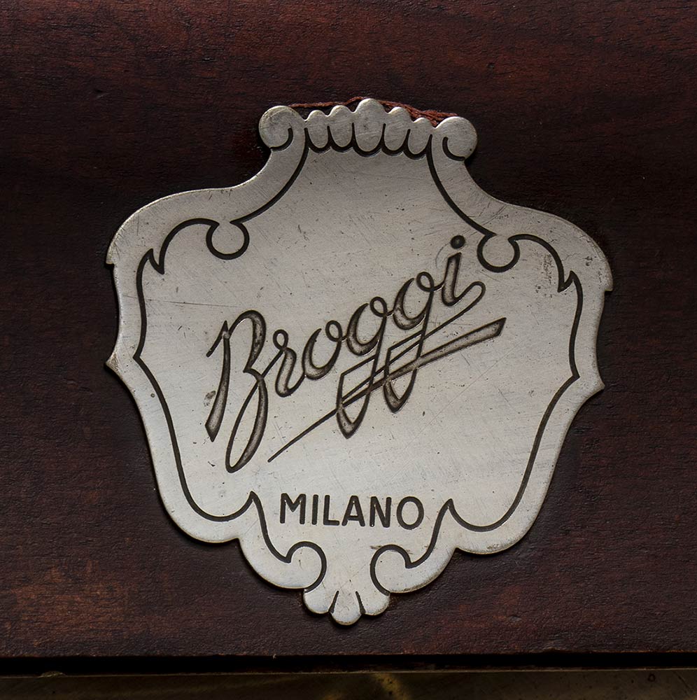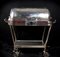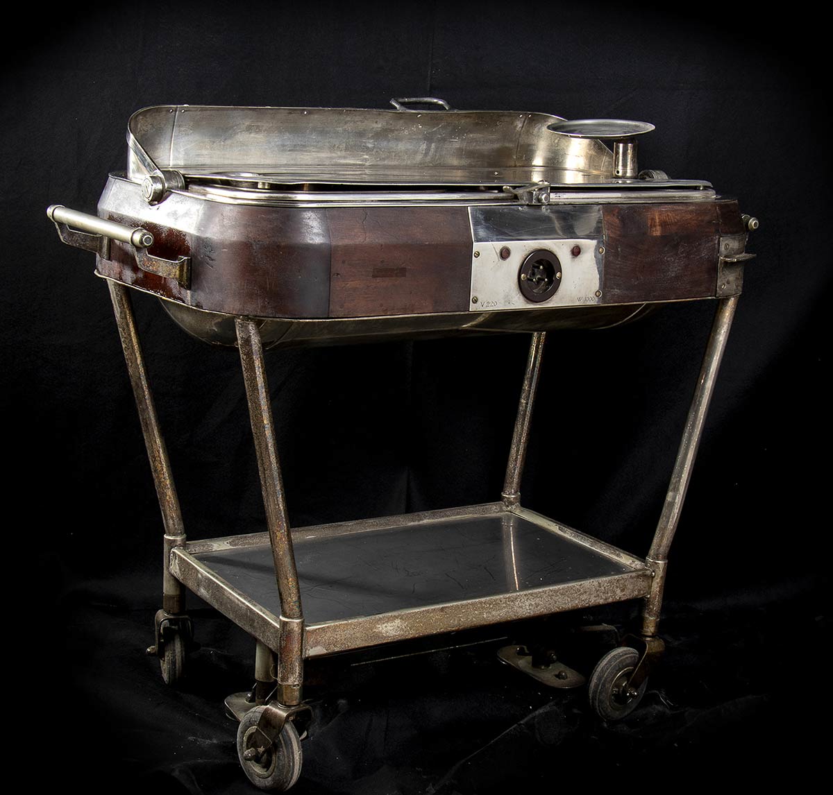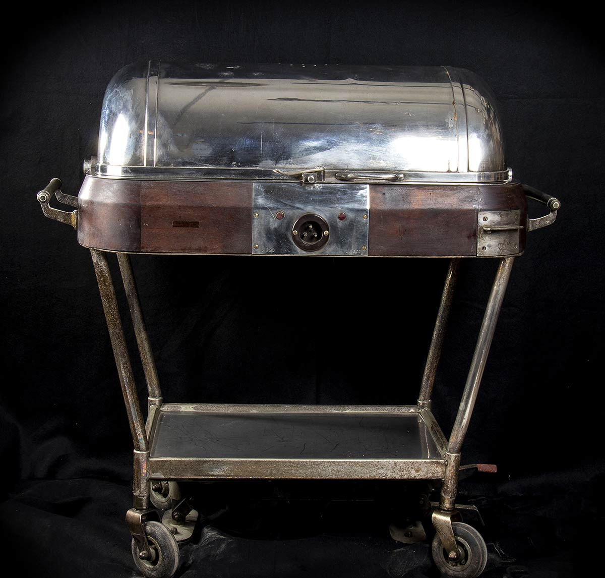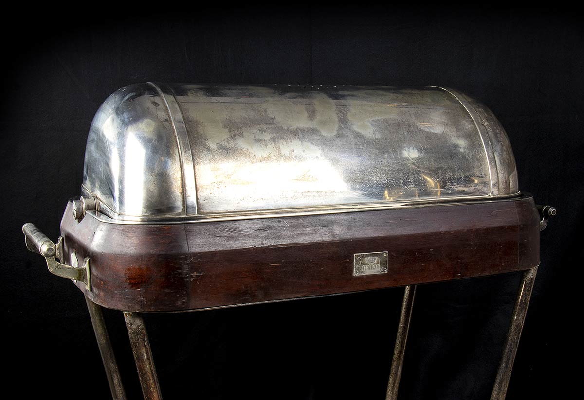 BROGGI - MilanoCarrello portavivandeGrande carrello portavivande in lega PLAFOND marcato BROGGI - Milano. Usato a bordo del Transatlantico REX , splendido cimelio realizzato da maestri argentieri e architetti / designer nell'industria italiana. Sportello apribile a scomparsa, a rivelare gli scomparti porta vivande con coperchio. Adagiato ad incasso in un corpo sagomato perimetrale in legno. Struttura in metallo con zampe tubolari fornite di ruote e freni, piano inferiore per piatti o vasellame vario. Placchetta con marchio BROGGI MILANO , altra placchetta con simbolo di Italia Navigazione, applicate al corpo in legno. Due consistenti maniglie adatte al traporto del carrelloIn buono stato, evidentemente usato e con segni del tempo. Non testato elettricamente. Misure circa cm.110x105x60 di ingombro totale. Misure del vano scaldavivande cm. 85x25
