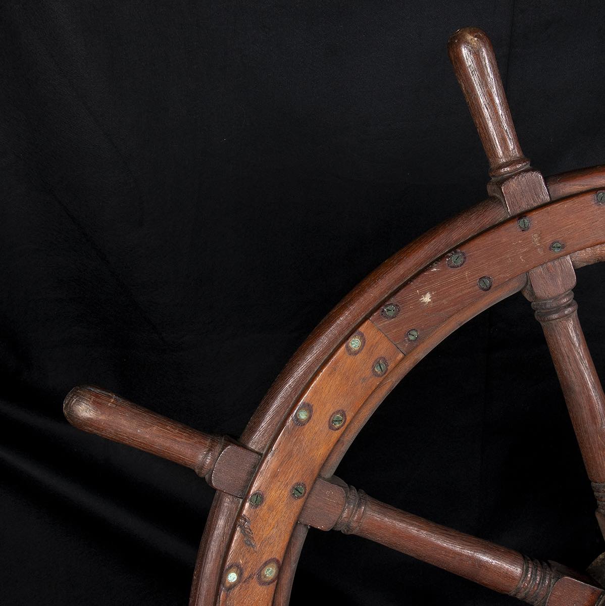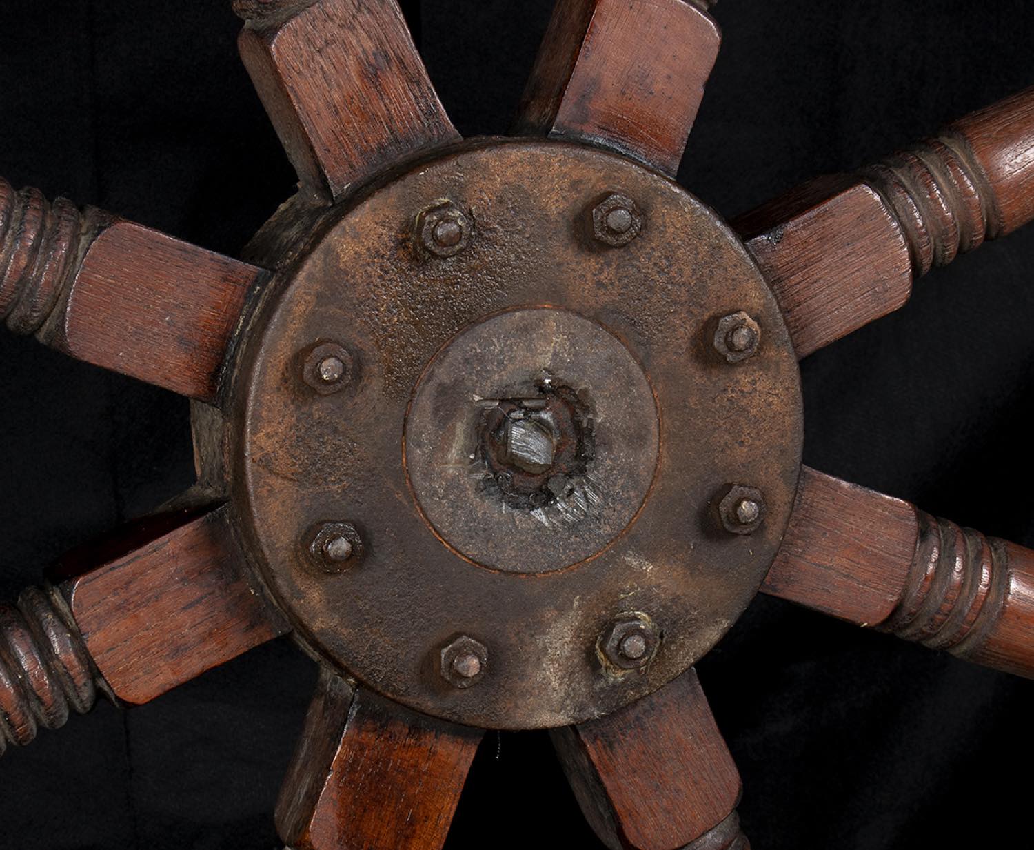 SconosciutoTimone di naveIn legno di mogano, timone ad 8 sezioni, parte centrale in ferro con alloggio per piantoneBuone condizioni, misure cm.109 diametro interno, cm.140 estensione esterna