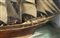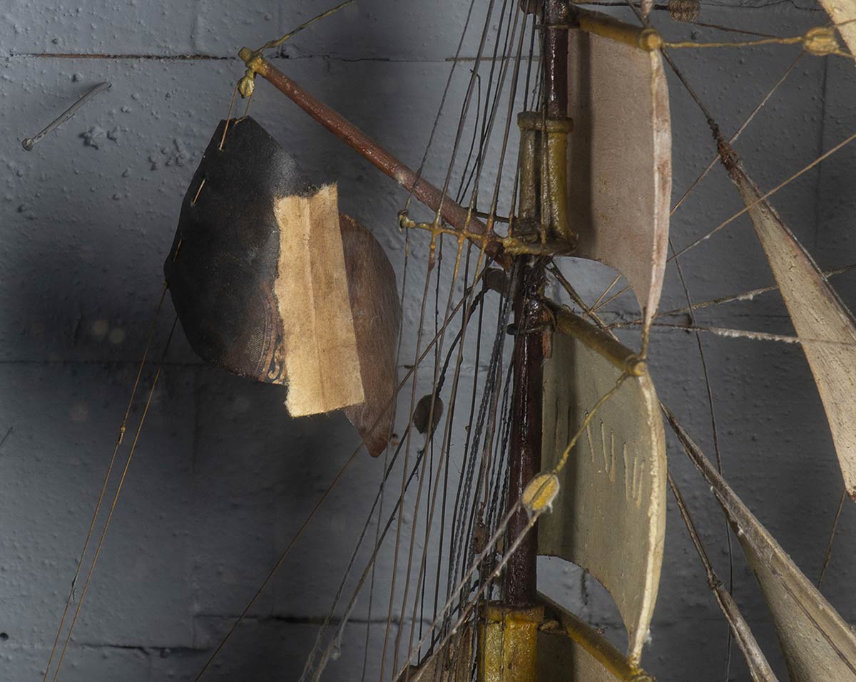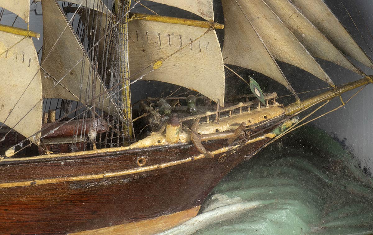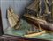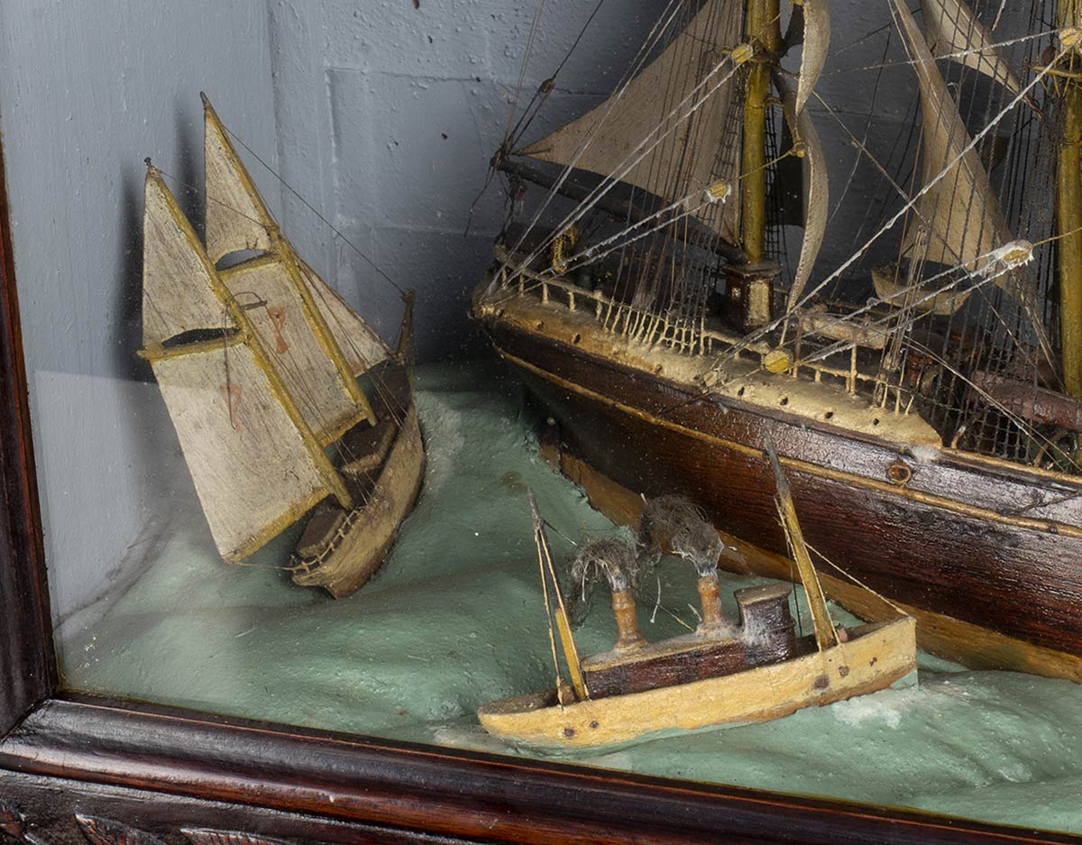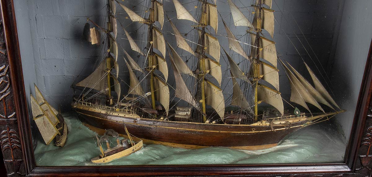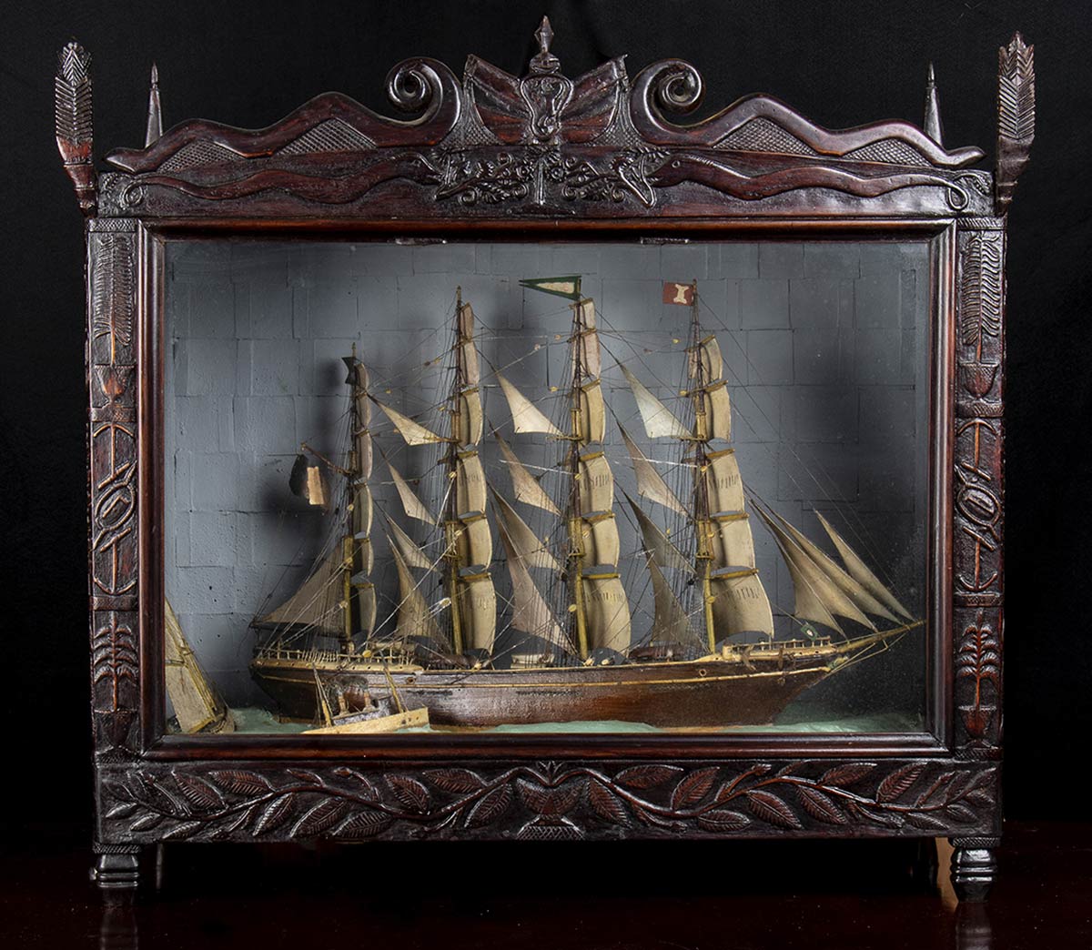 SconosciutoDiorama navaleMagnifico diorama con veliero a 4 alberi in navigazione, seguito da una piccola imbarcazione a vapore da appoggio, ed altra piccola barca a vela. In legno, gesso, carta e dettagli velieri in metallo, dipinto a mano. Veliero a tutto volume, non nel classico "demi-coque", quindi pi√π complesso e prezioso. Fine '800 inizi '900, in splendida cassetta di legno, con vetrina frontale, avente intagli lungo la cornice, con cimasa superiore, poggiante su quattro zampe tornite ed intagliate. Buone condizioni, misure della vetrina circa cm.71x70x31