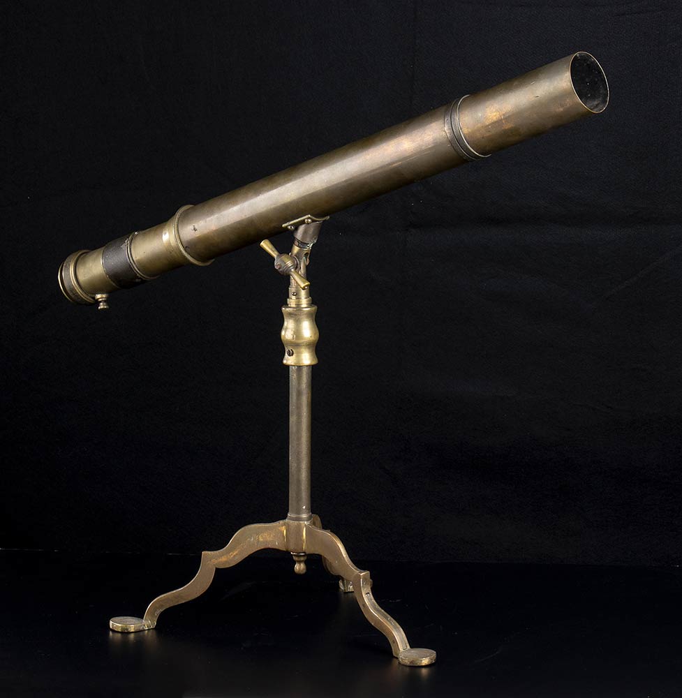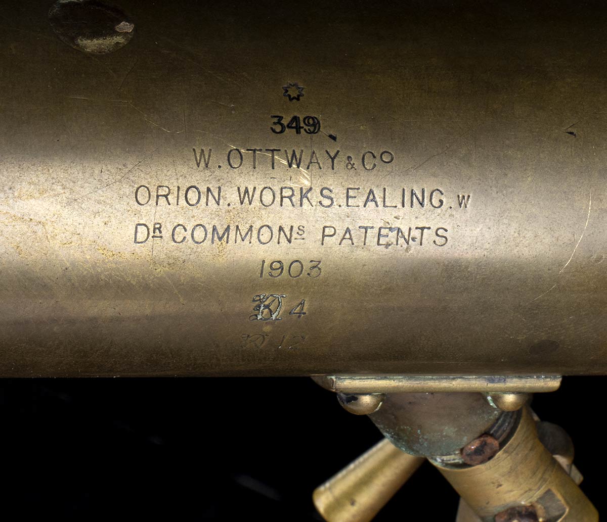 W.Ottway & Co.Cannocchiale di marinaMarina inglese, marcato OTTWAY & Co. - ORION WORKS EALING - D.Common PATENTS 1903 , seguito da un numero di serie. Snodo centrale per piedistallo stile liberty, da tavolo.Buone condizioni. Misure circa cm.59 di lunghezza, cm.30 il treppiede