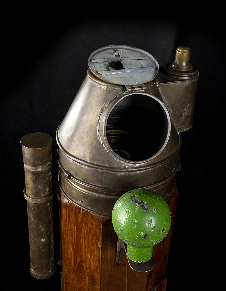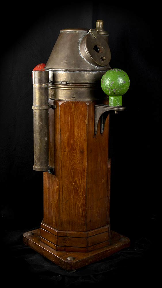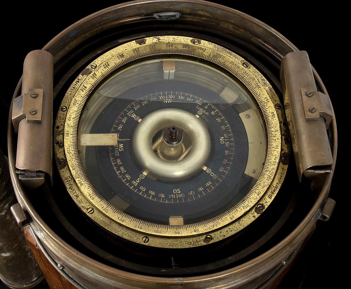 Bremerhaven Hamburg - Salmavi GenovaChiesuola con bussolaChiesuola con corpo in legno e calotta in ottone, braccia laterali in ottone amagnetico con sfere di compensazione magnetica dello scafo, completa di bussola interna. Marcata Bremerhaven Hamburg 39411/59 W.Ludolph "Salmani-Genova". Inizio del XX secolo Buone condizioni, completa. Misure circa cm. 134x80 con diametro del corpo cm.40