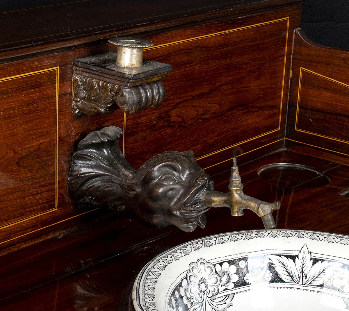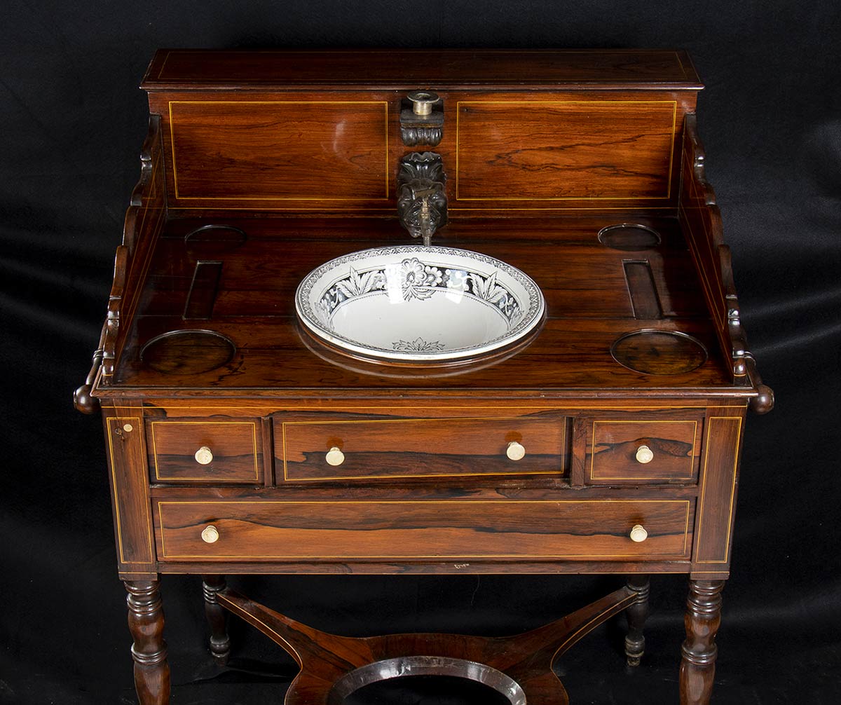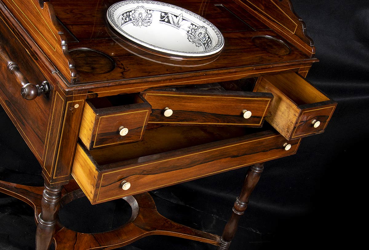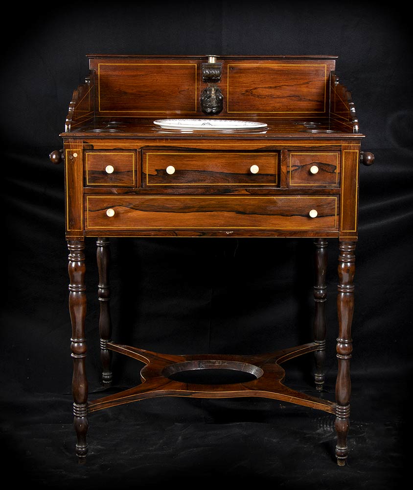 Non identificatoLavabo di bordoMobile lavandino in legno di coromandel, originale inizio XX secolo. Acquamanile in terraglia decorata, rubinetto a forma di delfino, provvisto di portacandela. Serbatoio per l'acqua rivestito in zinco, sulla facciata tre cassetti ed una antina, gambe tornite unite da traverse, porta salviette lateraliOttime condizioni, misure circa cm.110x78x65