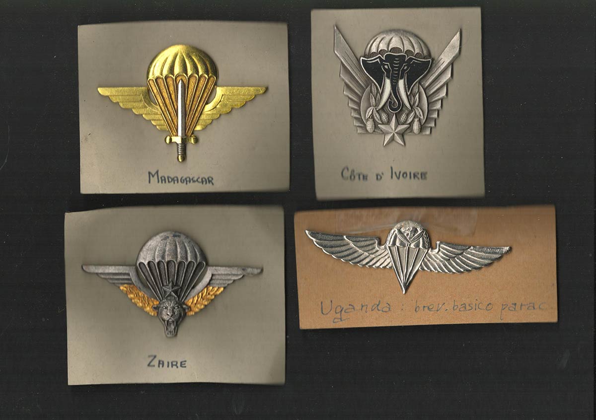 Lotto di 4 brevetti da paracadutistain metallo cognato e smalti, appartenenti agli eserciti della Costa d'Avorio, Uganda, Zaire e MadagascarOttimo stato