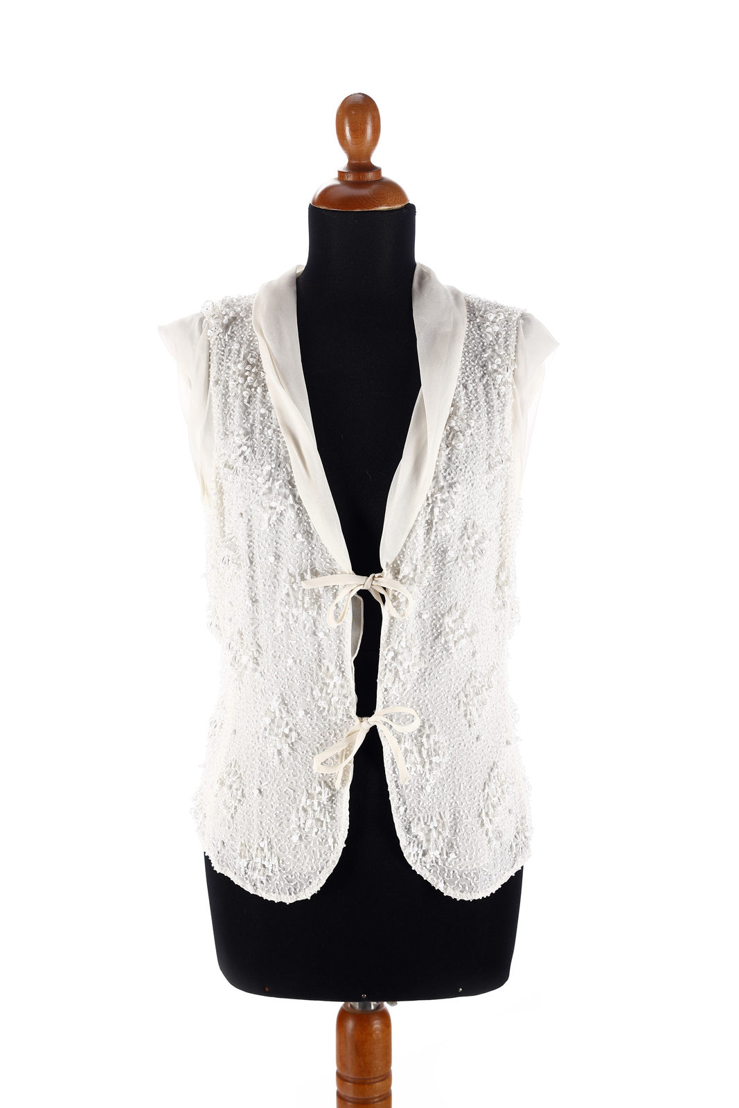 ARMANI EMPORIO Gilet in seta con perline color bianco avorio. 2000. Seta ricamata. Cm 43,00 x 50,00. Etichetta Emporio Armani presente. Chiusura a duplice fiocco in tessile bianco.