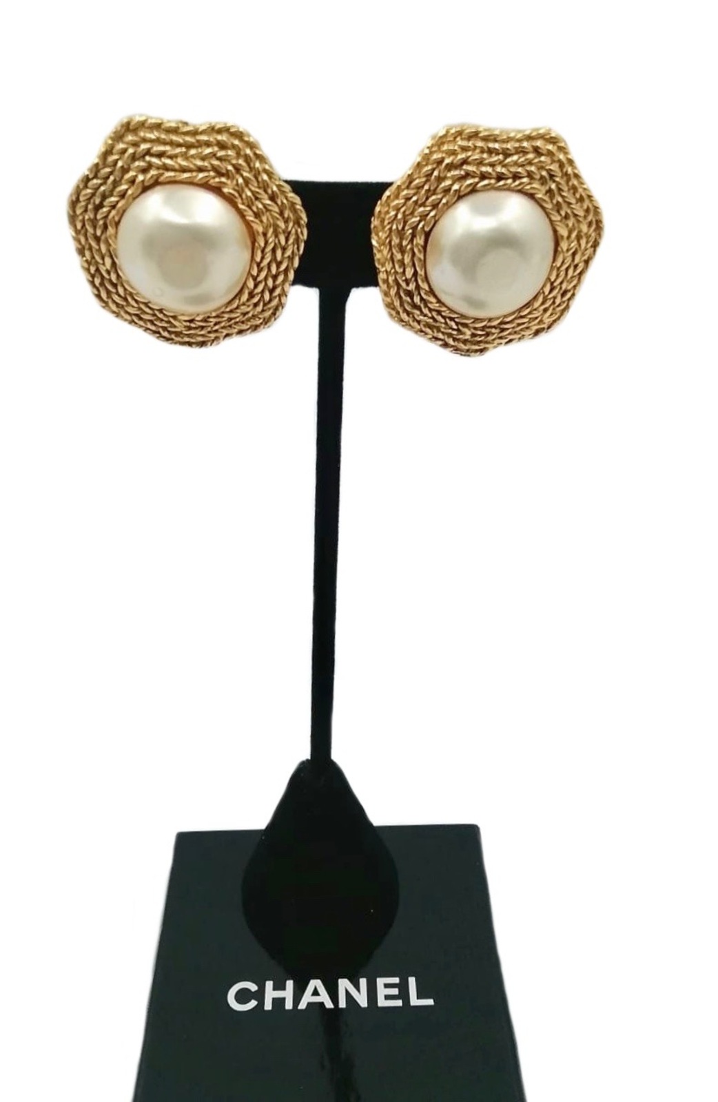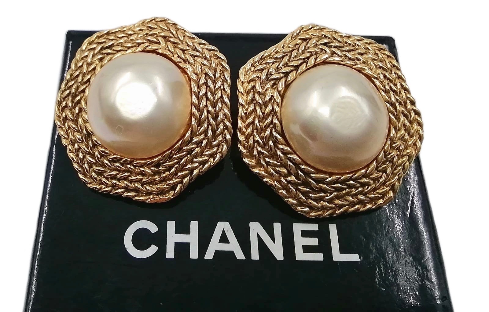 CHANEL Orecchini. . 1990. Metallo dorato e perla.. Cm 3,30 x 3,30. Orecchini a lobo con clips a forma esagonale a treccia dorata, finta perla mabé al centro. Inizio anni '90.
