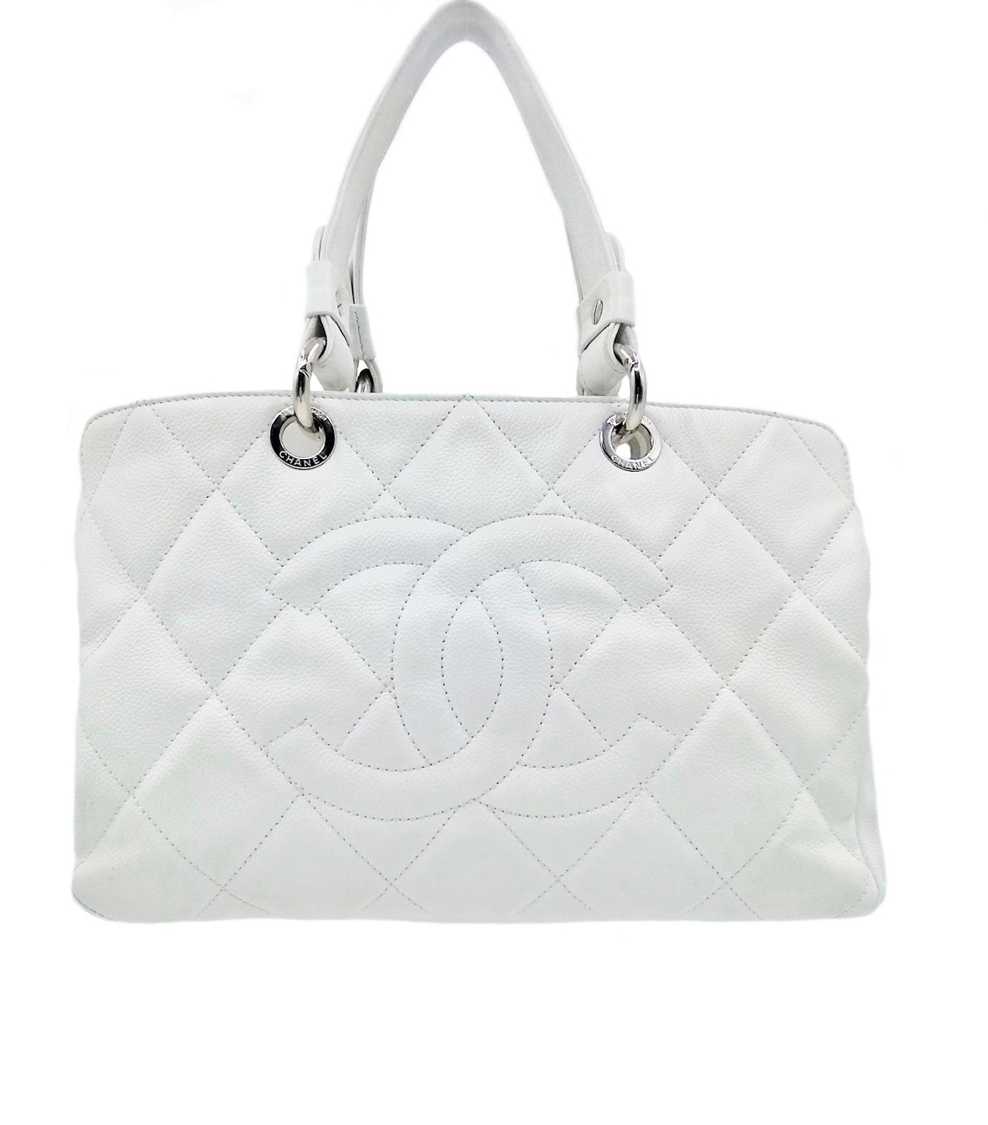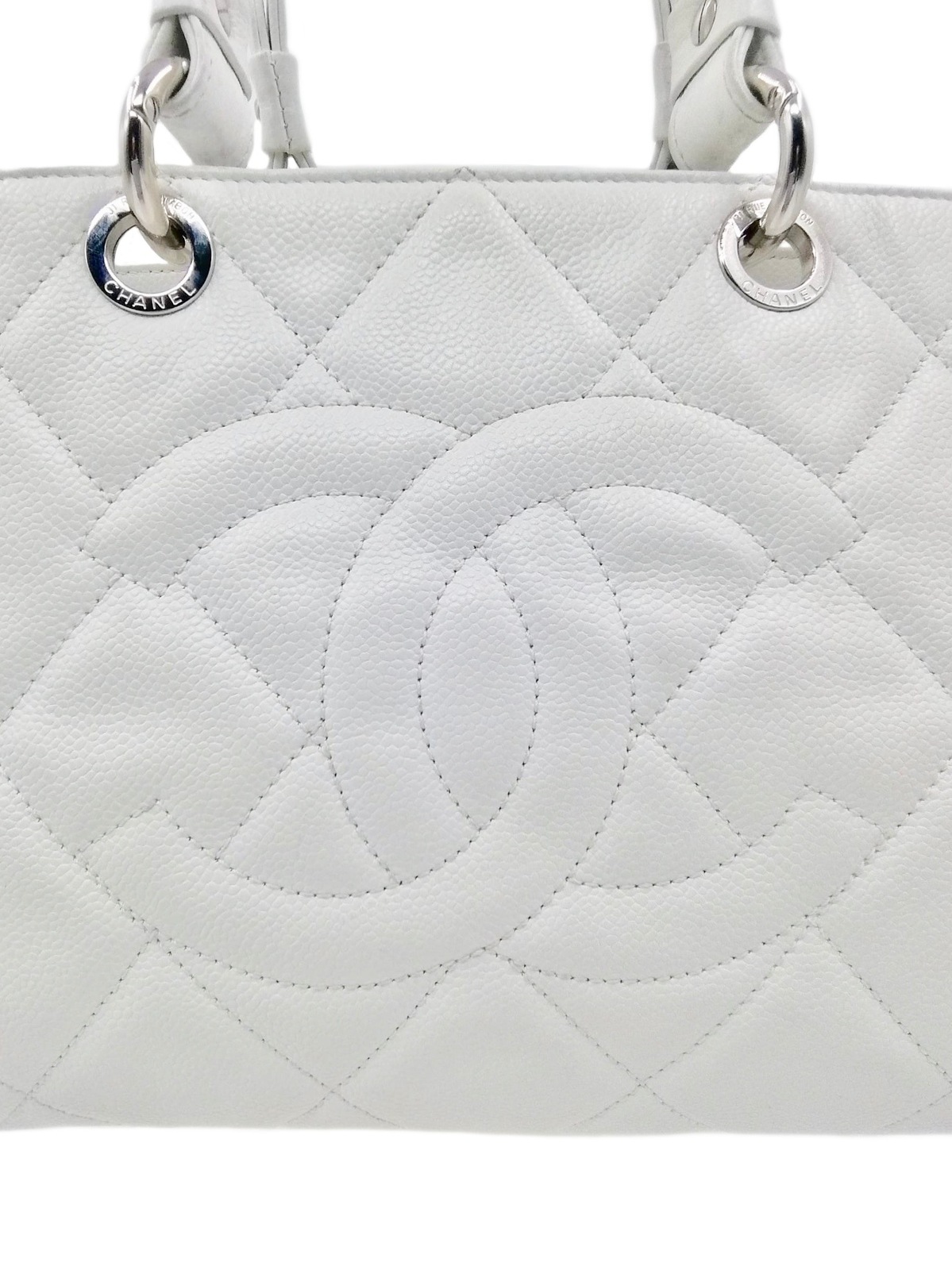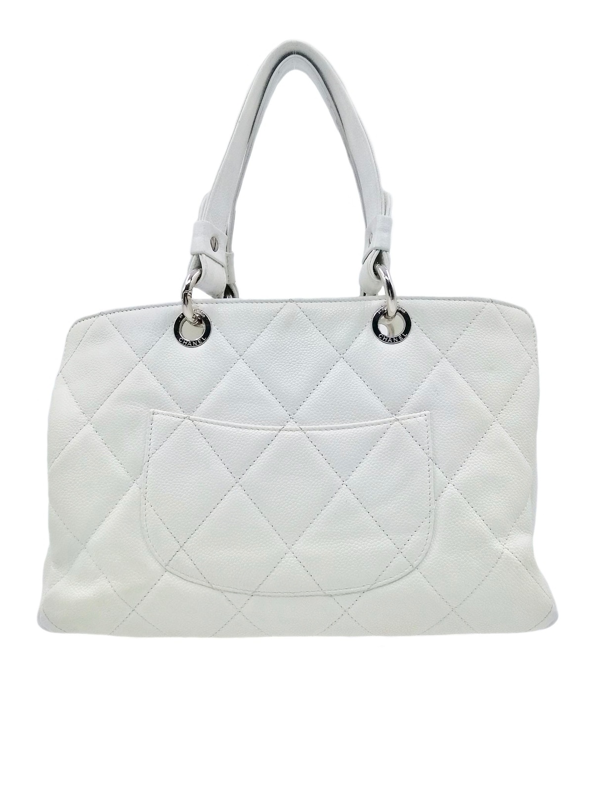 CHANEL Borsa in pelle bianca caviar. 2008. Pelle. Cm 30,00 x 20,00 x 12,00. Borsa a mano in pelle caviar bianca. Caratteristica trapuntatura, logo CC sul fronte, manico in pelle bianca. Made in Italy 2008/2009. Buone condizioni. Etichetta Chanel Made in Italy all'interno, codice all'interno 12786525.