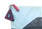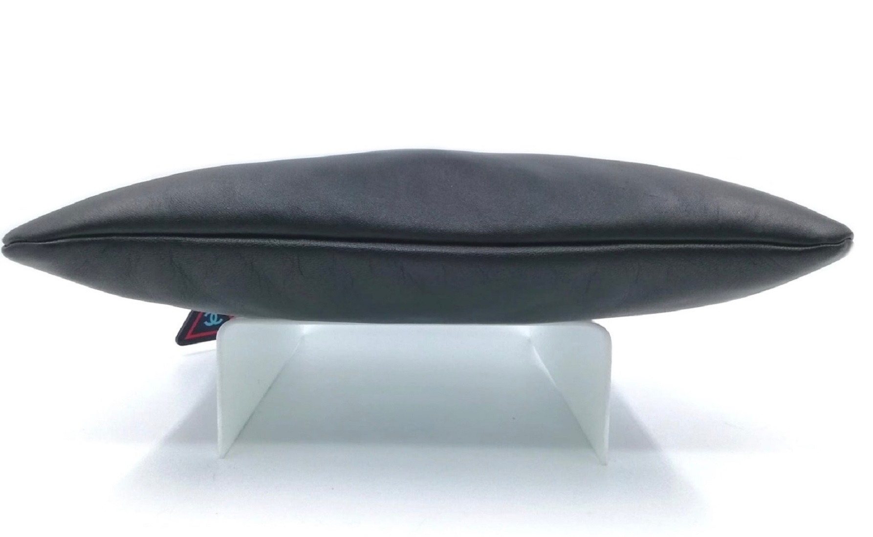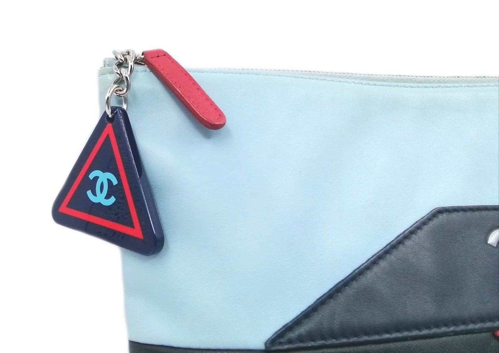 CHANEL Pochette Airport. 2016. Pelle. Cm 33,00 x 23,00 x 2,00. Grande pochette in pelle di agnello blu scurissimo, bianco, accenti rossi. Chiusura a zip, logo CC sull'estremità, triplice logo sul fronte, codice all'interno 22550981, carta di autenticità presente. Made in Italy 2016. Collezione Primavera/ Esttate 2016. Buone condizioni. Lievi segni d'uso.