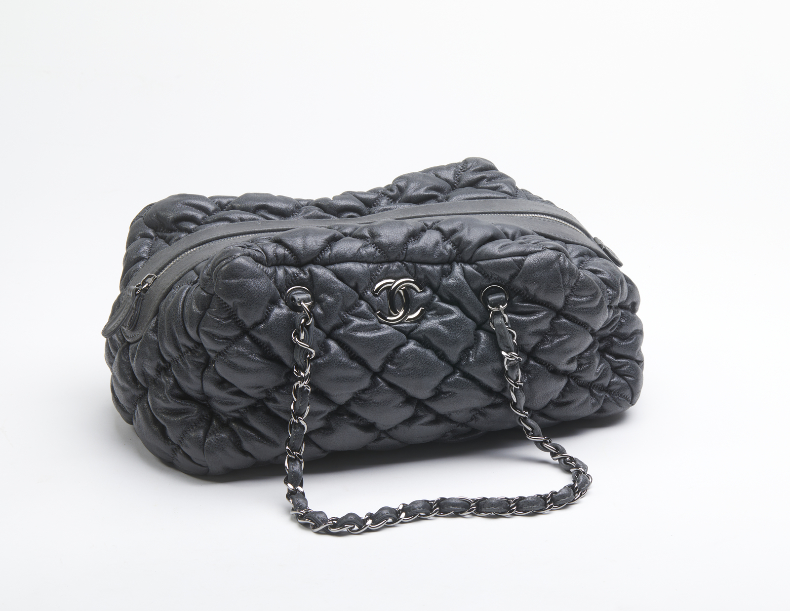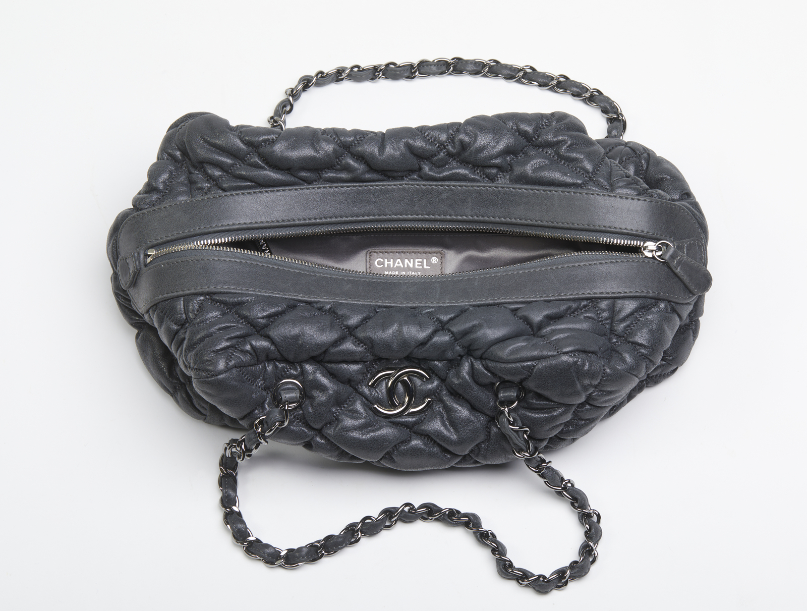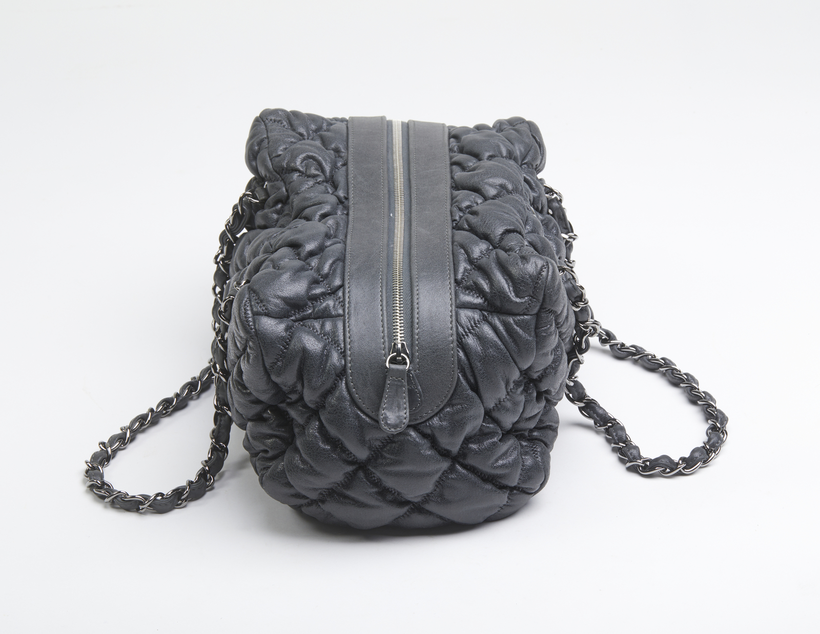 CHANEL Chanel Paris-Moscou Bubble Quilted Bowler bag. 2009. Pelle. Cm 32,00 x 17,00 x 19,00. Borsa Chanel vintage, pre-fall 2009, direzione artistica Karl Lagerfeld, in pelle grigia scura/nera trapuntata e dettagli logo CC e catena in metallo argentato. Modello Paris-Moscou Bubble Quilted Bowler bag. Dustbag.