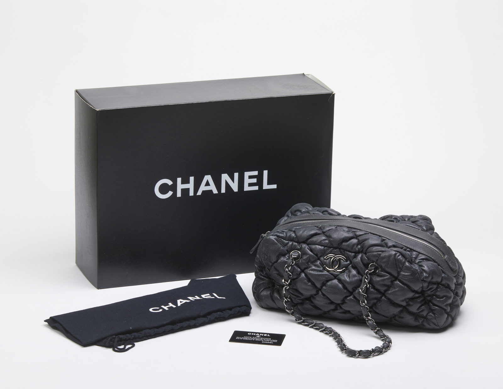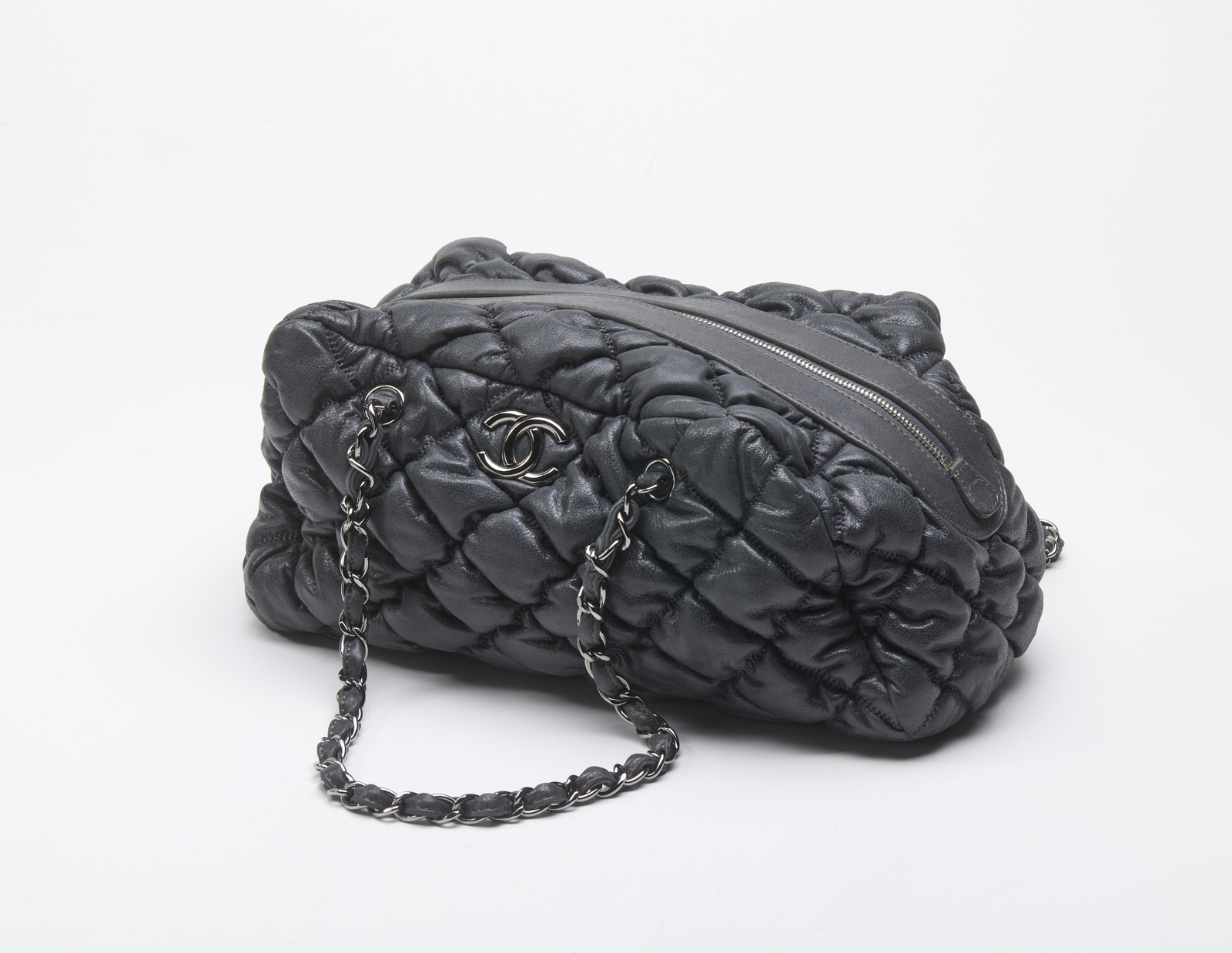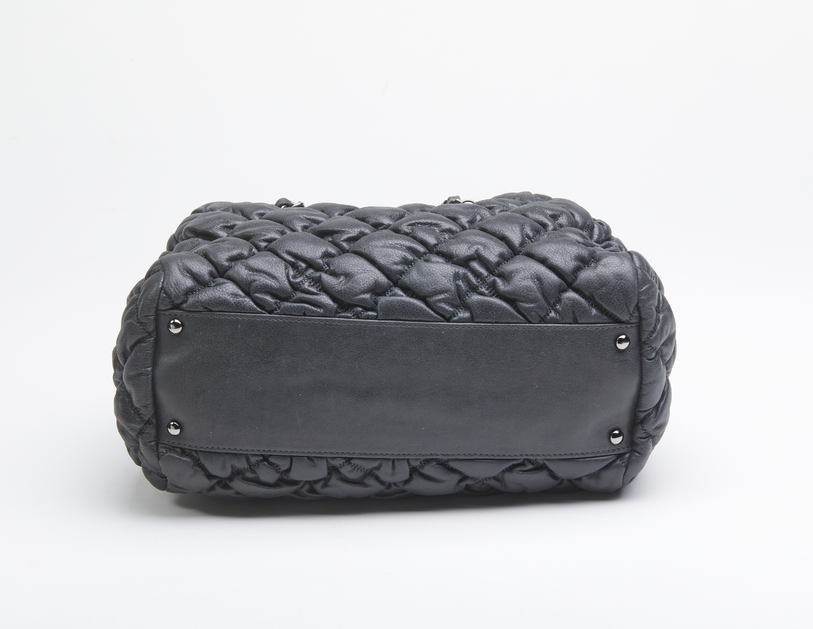 CHANEL Chanel Paris-Moscou Bubble Quilted Bowler bag. 2009. Pelle. Cm 32,00 x 17,00 x 19,00. Borsa Chanel vintage, pre-fall 2009, direzione artistica Karl Lagerfeld, in pelle grigia scura/nera trapuntata e dettagli logo CC e catena in metallo argentato. Modello Paris-Moscou Bubble Quilted Bowler bag. Dustbag.