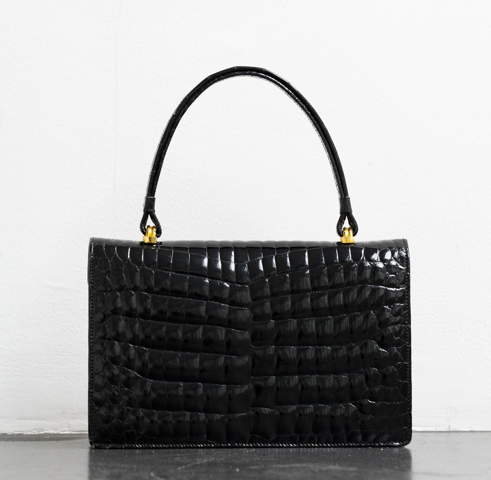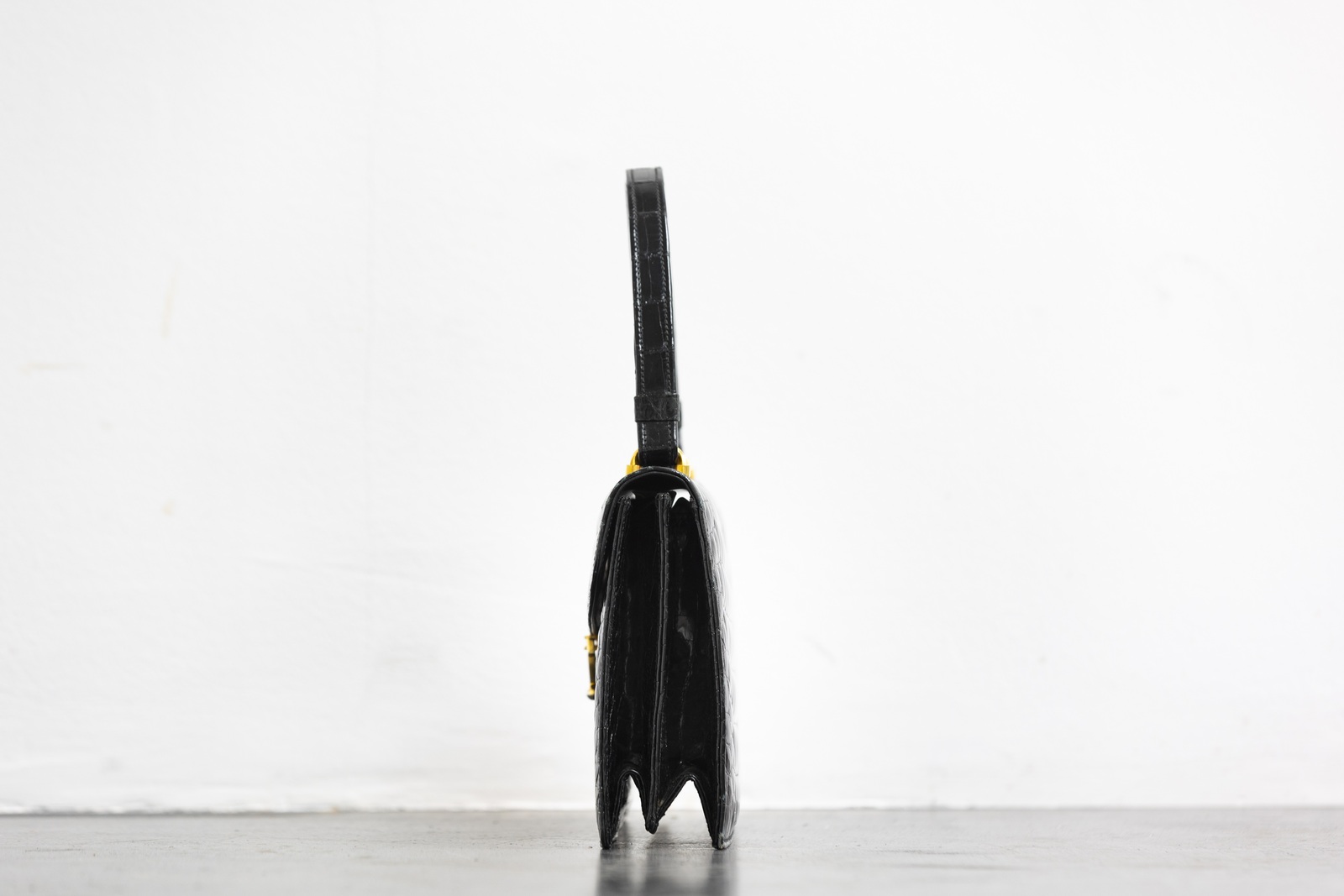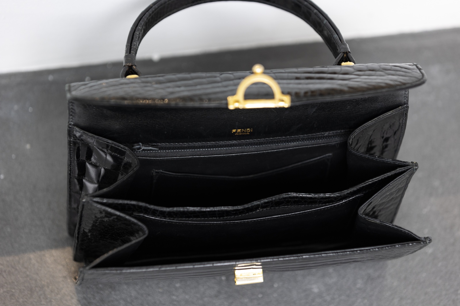 FENDI Borsa in pelle nera lucida. Pelle di coccodrillo. Cm 26,00 x 16,00 x 5,00. Elegante borsetta a mano Fendi vintage, modello rigido, in pelle stampa cocco nero lucida, manico rigido, firma Fendi stampata all'interno. Presente custodia originale.
