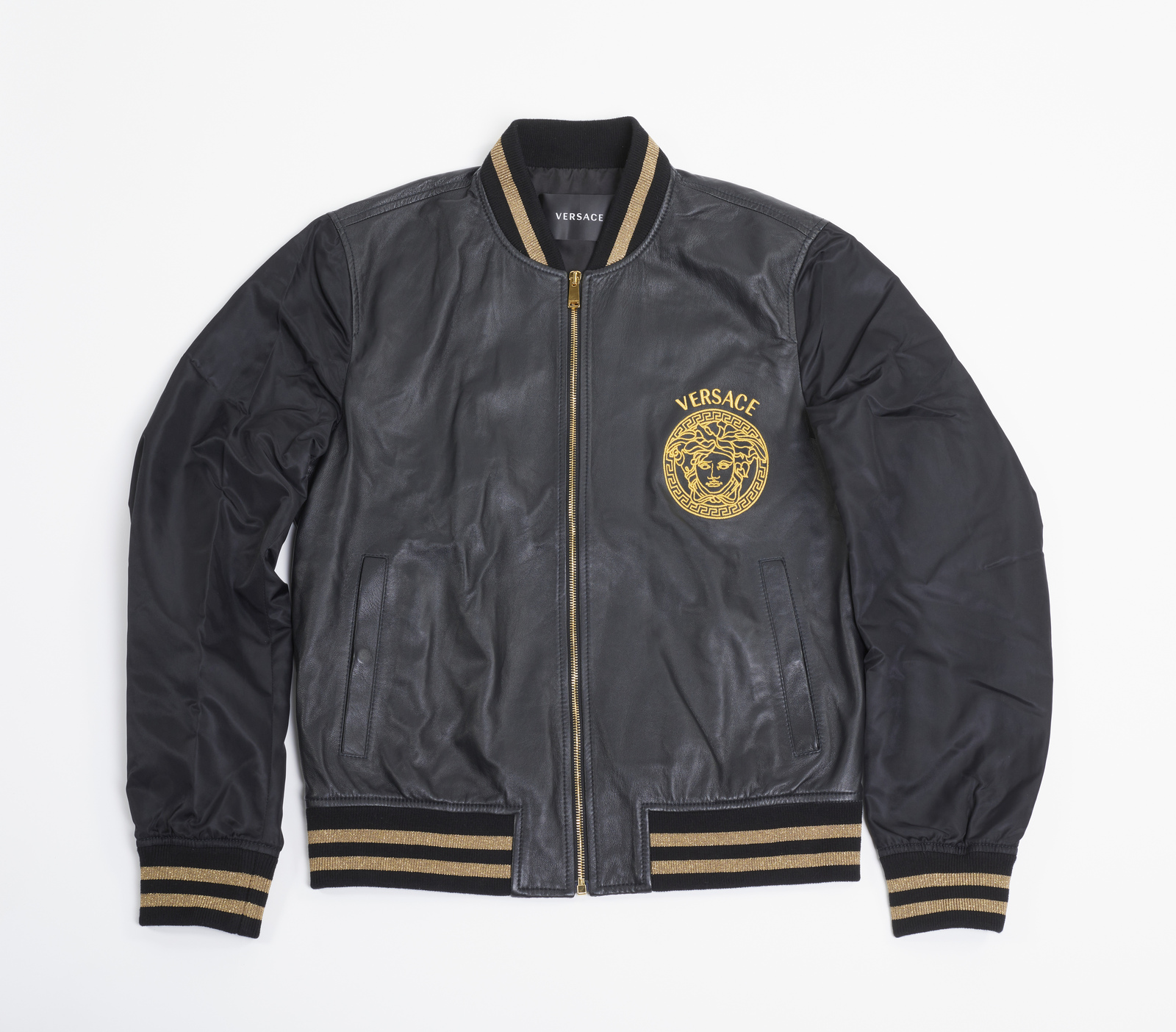 VERSACE GIANNI (1946 - 1997) Bomber in nappa e tessuto tecnico nero. Pelle Nera. Cm 48,00 x 60,00. Bomber Versace in pelle (nappa) morbida nera, con maniche in tessuto tecnico nero, collo, polsi e vita bordato di tessuto stretch nero e oro, zip in hardware oro con logo Versace, splendido ricamo a punto pieno giallo oro con Medusa, greca e Versace a sinistra all'altezza del cuore, due taschine interne. Taglia 52 IT, etichetta Versace, etichetta qrcode, etichetta tessile presente.