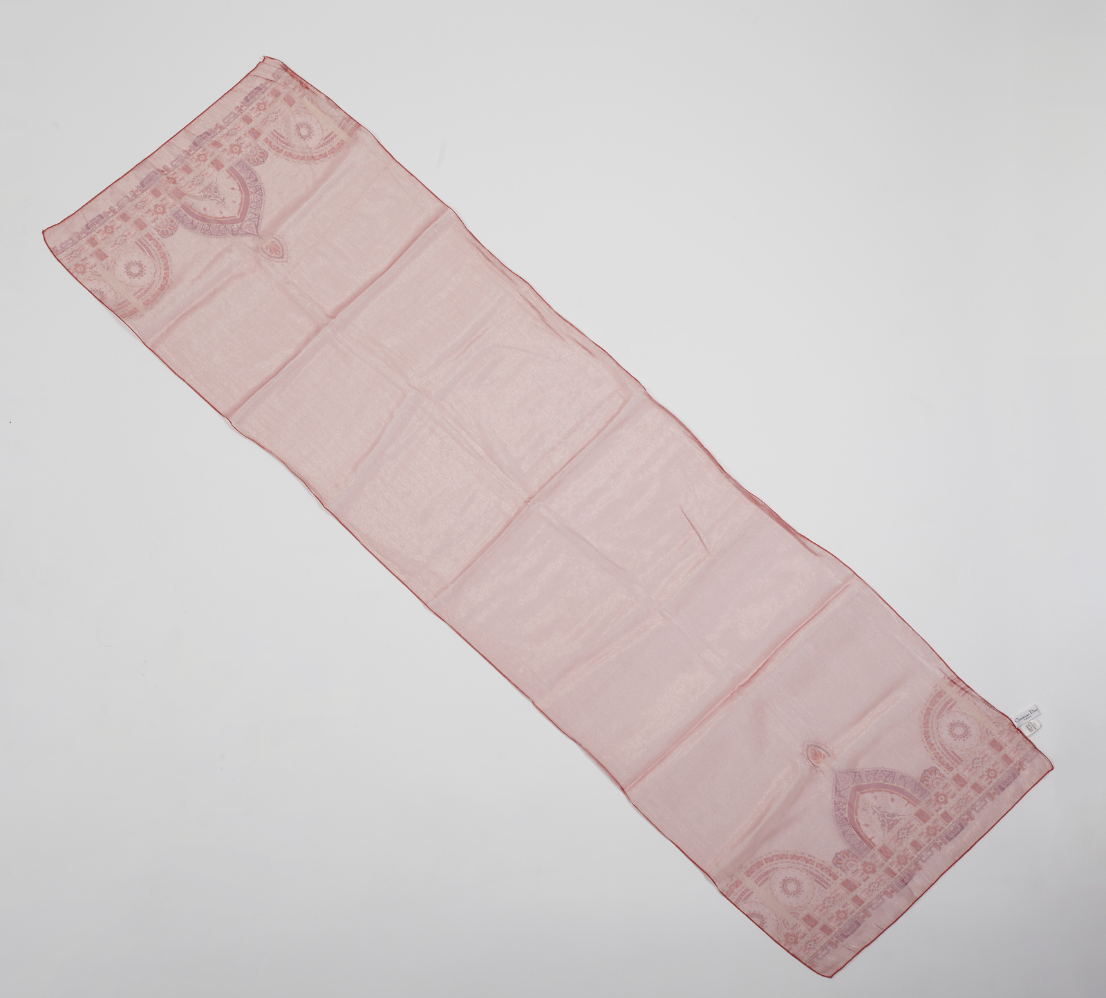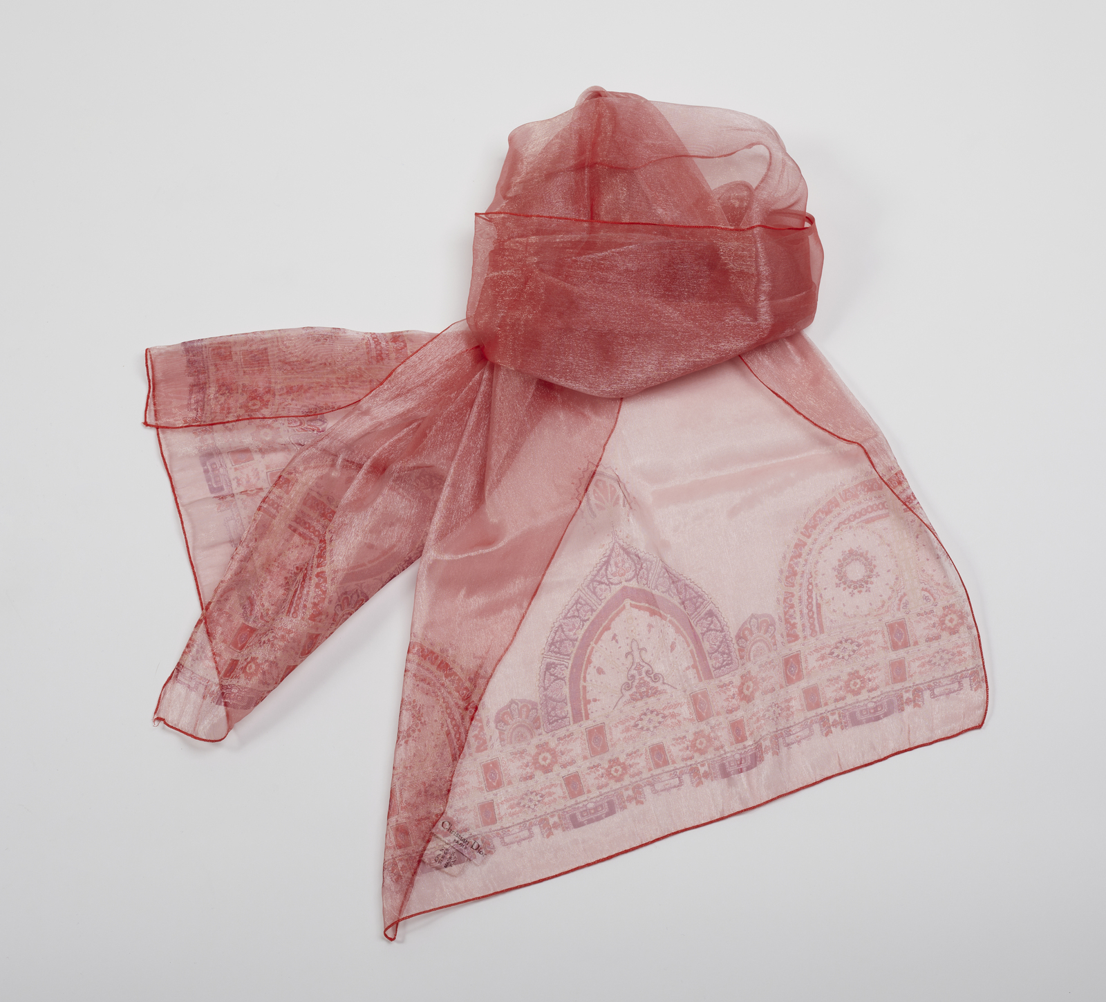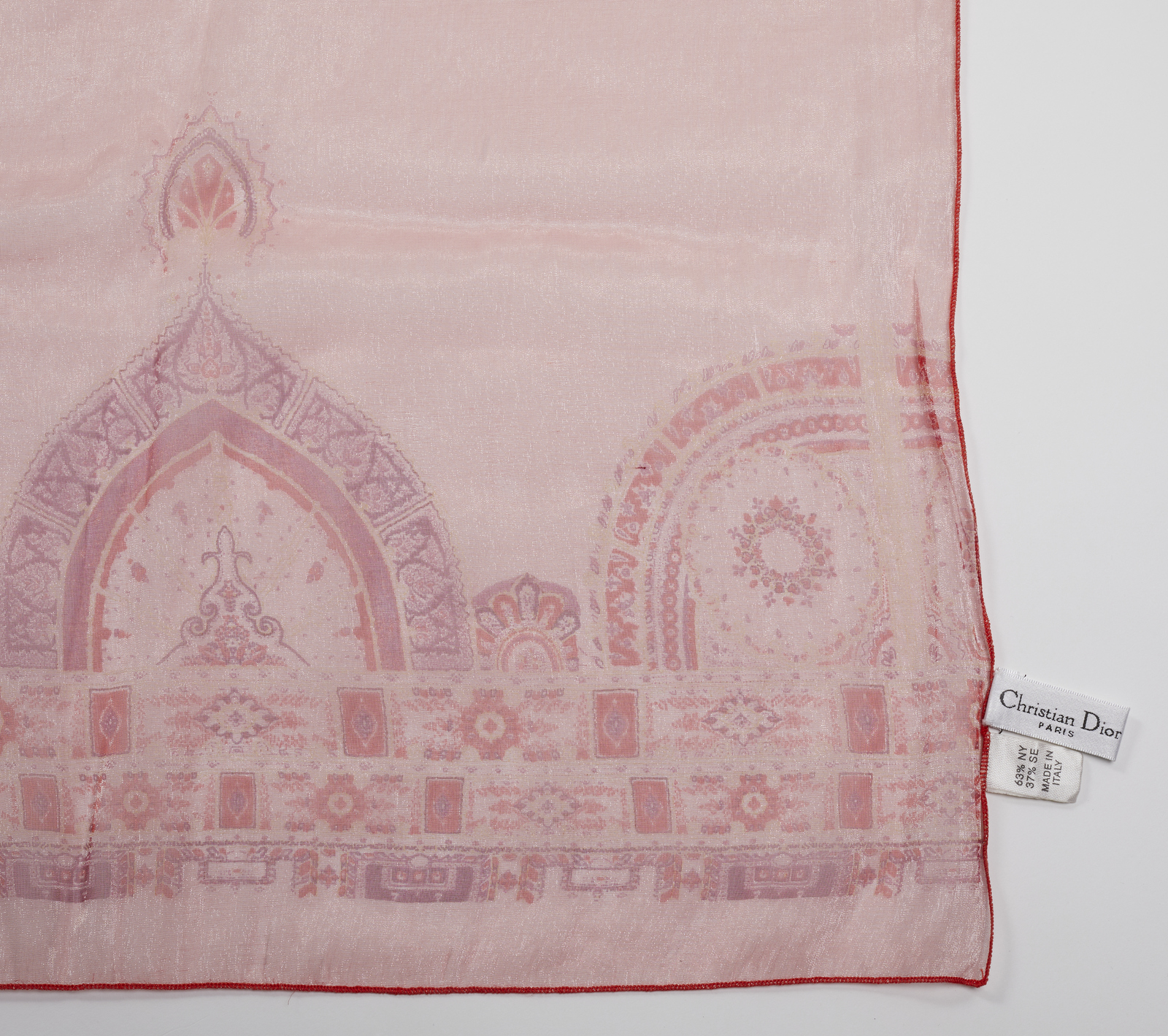 DIOR CHRISTIAN Foulard rosso. Seta. Cm 33,00 x 70,00. In faille trasparente con decoro di gusto moresco. Etichetta tessile ed etichetta Christian Dior presente.