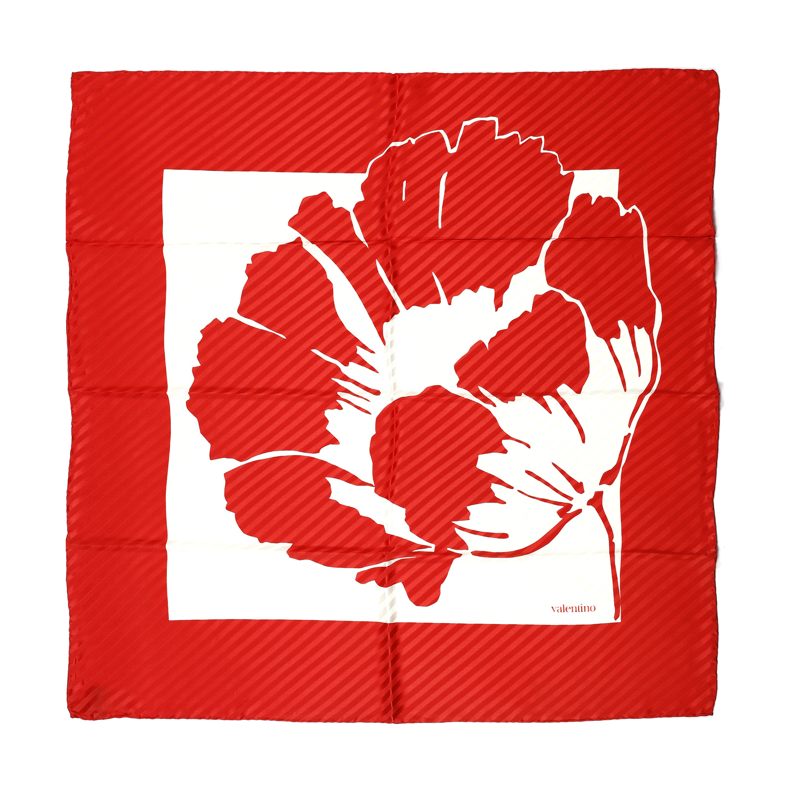 VALENTINO Foulard damascato rosso e bianco. Seta. Cm 84,00 x 84,00. Foulard in seta damascata, nel classico rosso Valentino e bianco, decoro floreale.