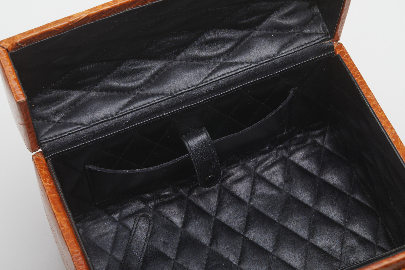 AUTORE NON IDENTIFICATO Bauletto stampa coccodrillo nei toni dell'arancione. Pelle. Cm 26,00 x 18,00 x 19,00. Interni in pelle trapuntata verde scuro.