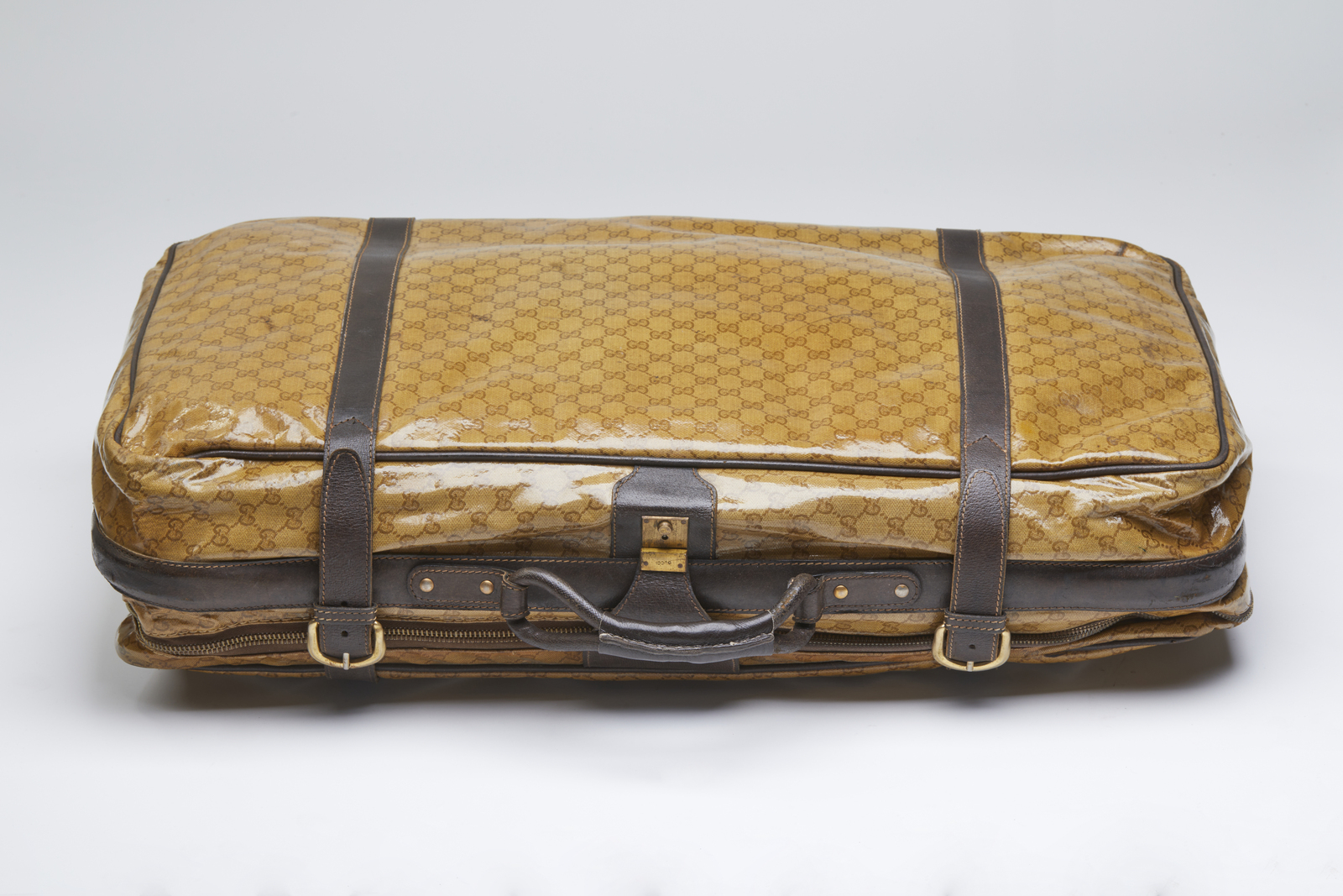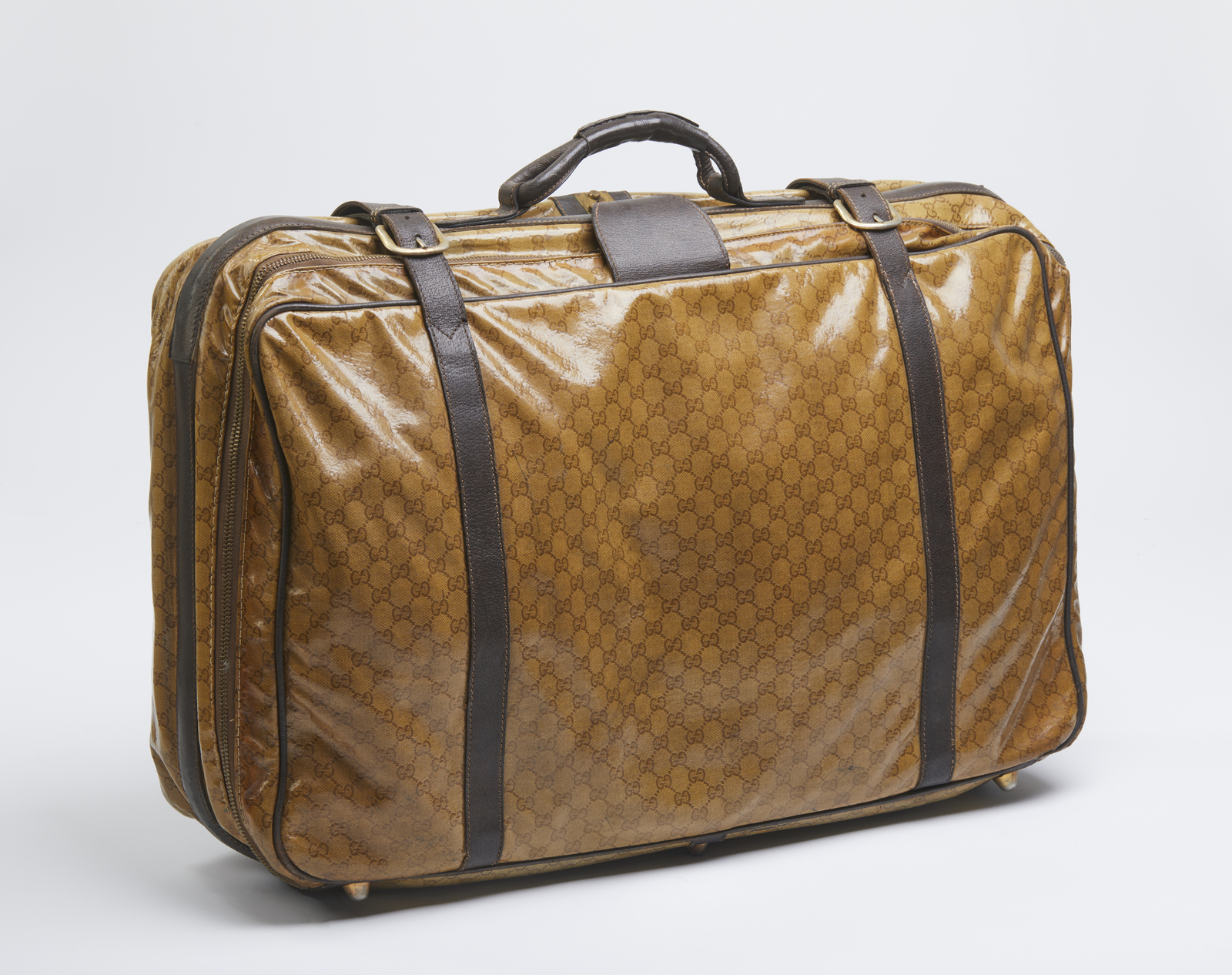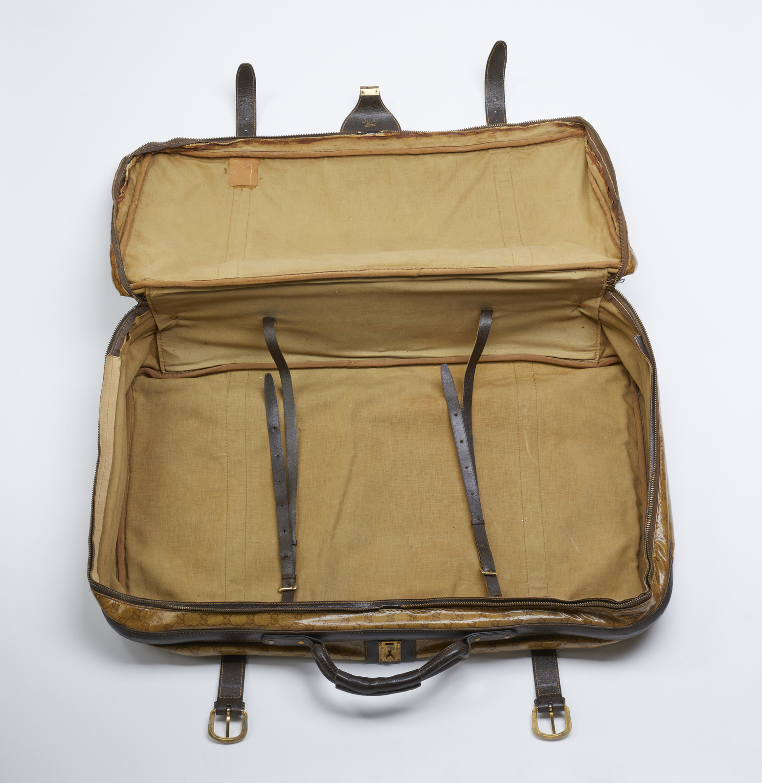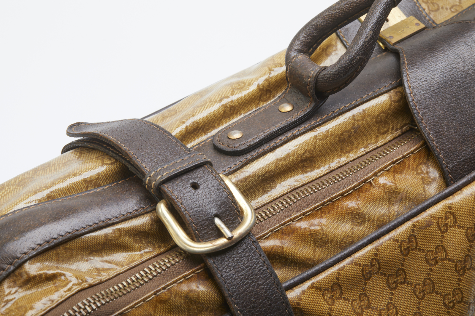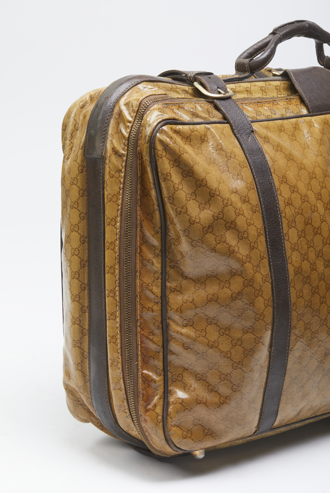 GUCCI Valigia. Tessuto e pelle. Cm 76,00 x 54,00 x 20,00. Valigia Gucci vintage in tessuto monogram GG Guccissima lucido con finiture, manico e doppia cinghia in pelle marrone scuro. Chiusura con zip, funzionante. Firma Made in Italy by Gucci all'interno, stampato Gucci sulla chiusura, interni in tessuto ocra. Sei piedini alla base. Lievi segni del tempo.