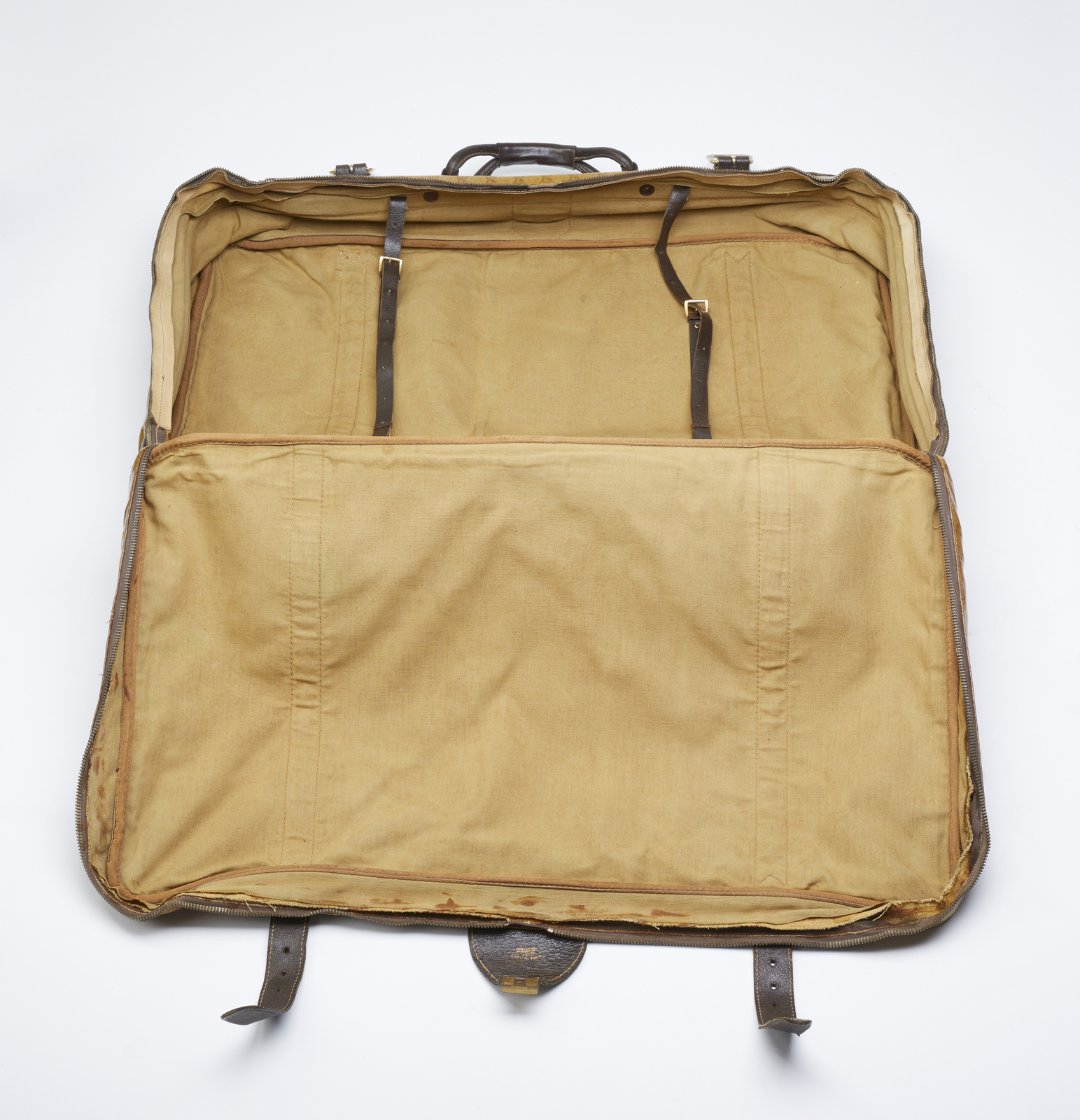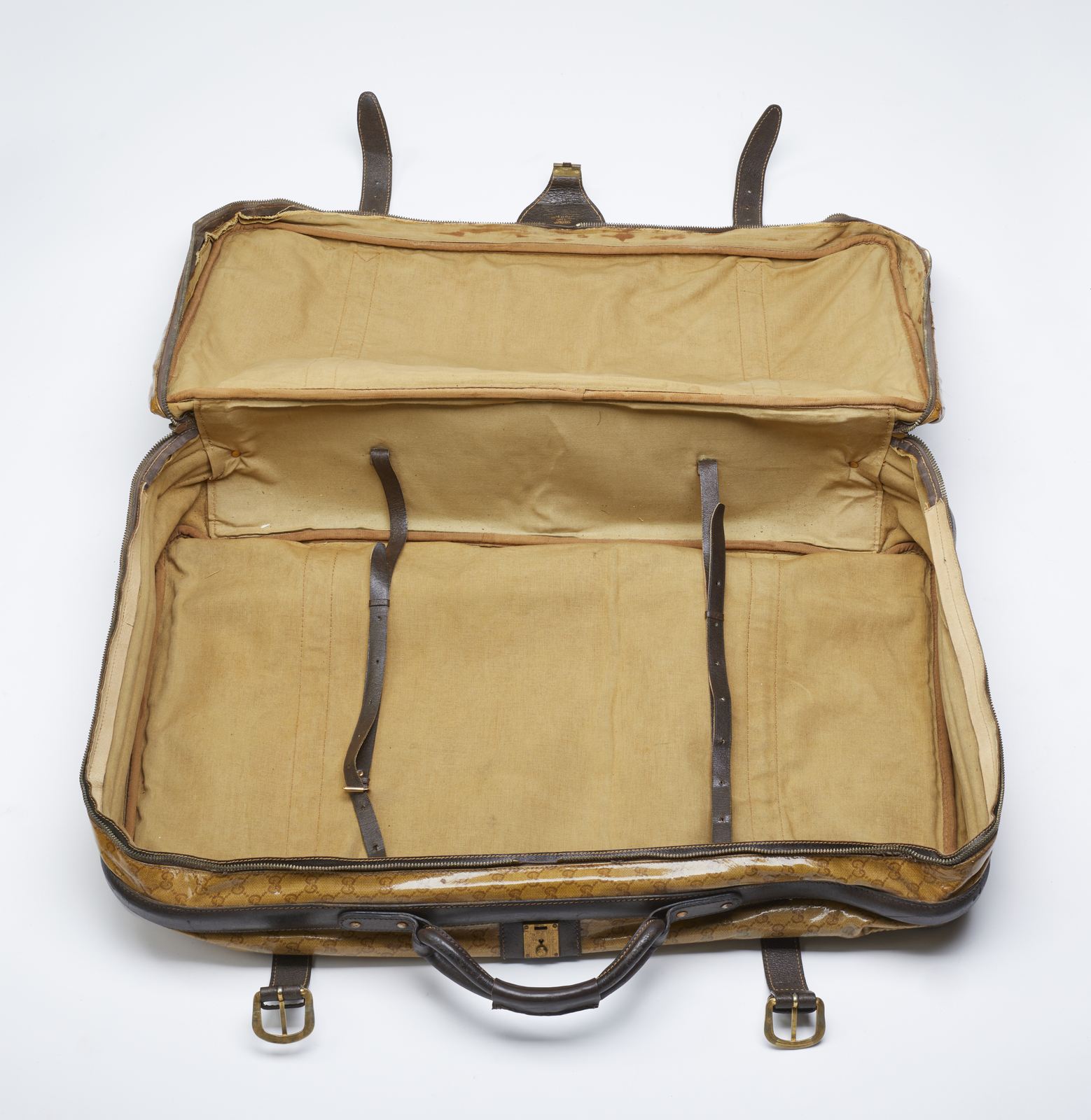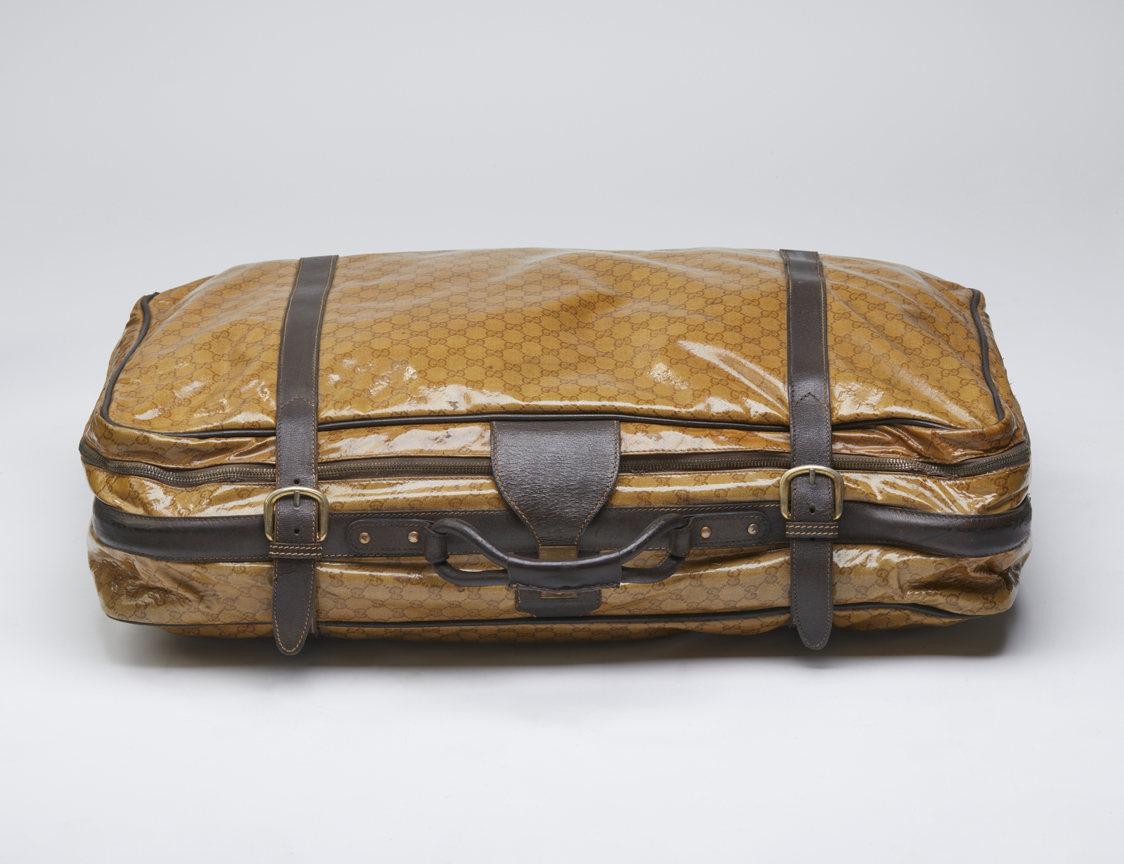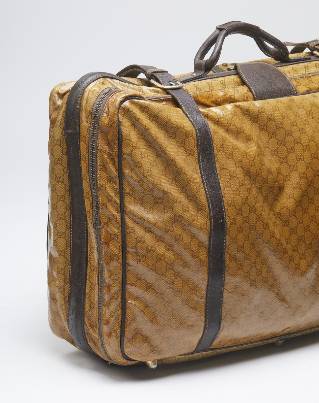 GUCCI Valigia. Tessuto e pelle. Cm 76,00 x 54,00 x 20,00. Valigia Gucci vintage in tessuto monogram GG Micro Guccissima lucido con finiture, manico e doppia cinghia in pelle marrone scuro. Chiusura con zip, funzionante. Firma Made in Italy by Gucci all'interno, stampato Gucci sulla chiusura, interni in tessuto ocra. Sei piedini alla base. Lievi segni del tempo, patina, piccole scuciture sulla parte superiore vicino alla zip.