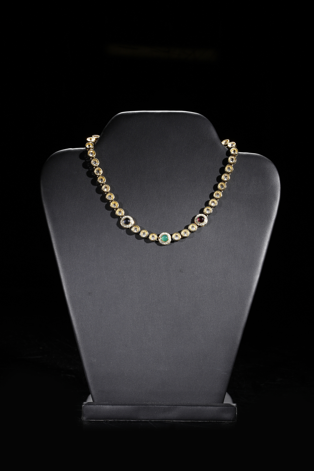 VOGUE BIJOUX Girocollo tennis con strass. Metallo dorato e materiale plastico.. Cm 18,00 x 18,00. Girocollo modello tennis con strass a montatura "cipollina", strass colorati cabochon effetto zaffiro, smeraldo, rubino. Metallo dorato della montatura, etichetta presente.