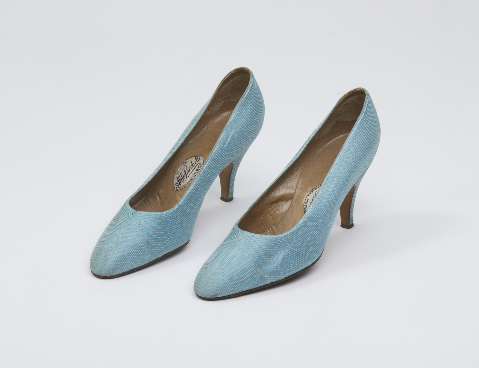 SACCHETTI ALDO Scarpe décolleté azzurre. Raso di seta. Cm 8,00 x 14,00 x 25,00. Eleganti décolleté fatte a mano, etichetta Aldo Sacchetti all'interno, tacco 7 cm, in raso azzurro completamente impunturato di filo bianco. Taglia 36 circa.