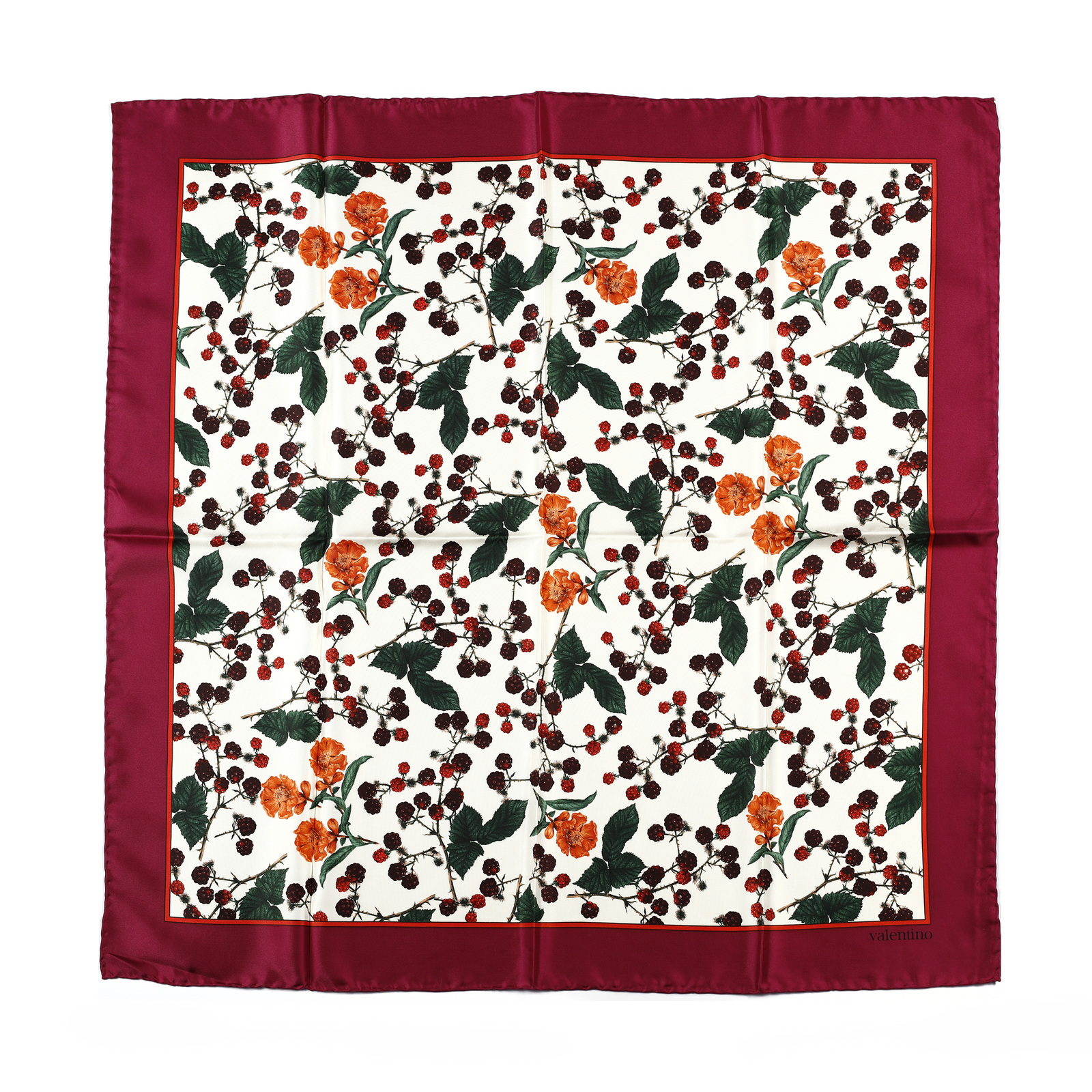 VALENTINO Foulard con stampa di more. Seta. Cm 84,00 x 84,00. Foulard decorato con fantasia di more su fondo bianco, bordi color porpora, firma su un angolo.