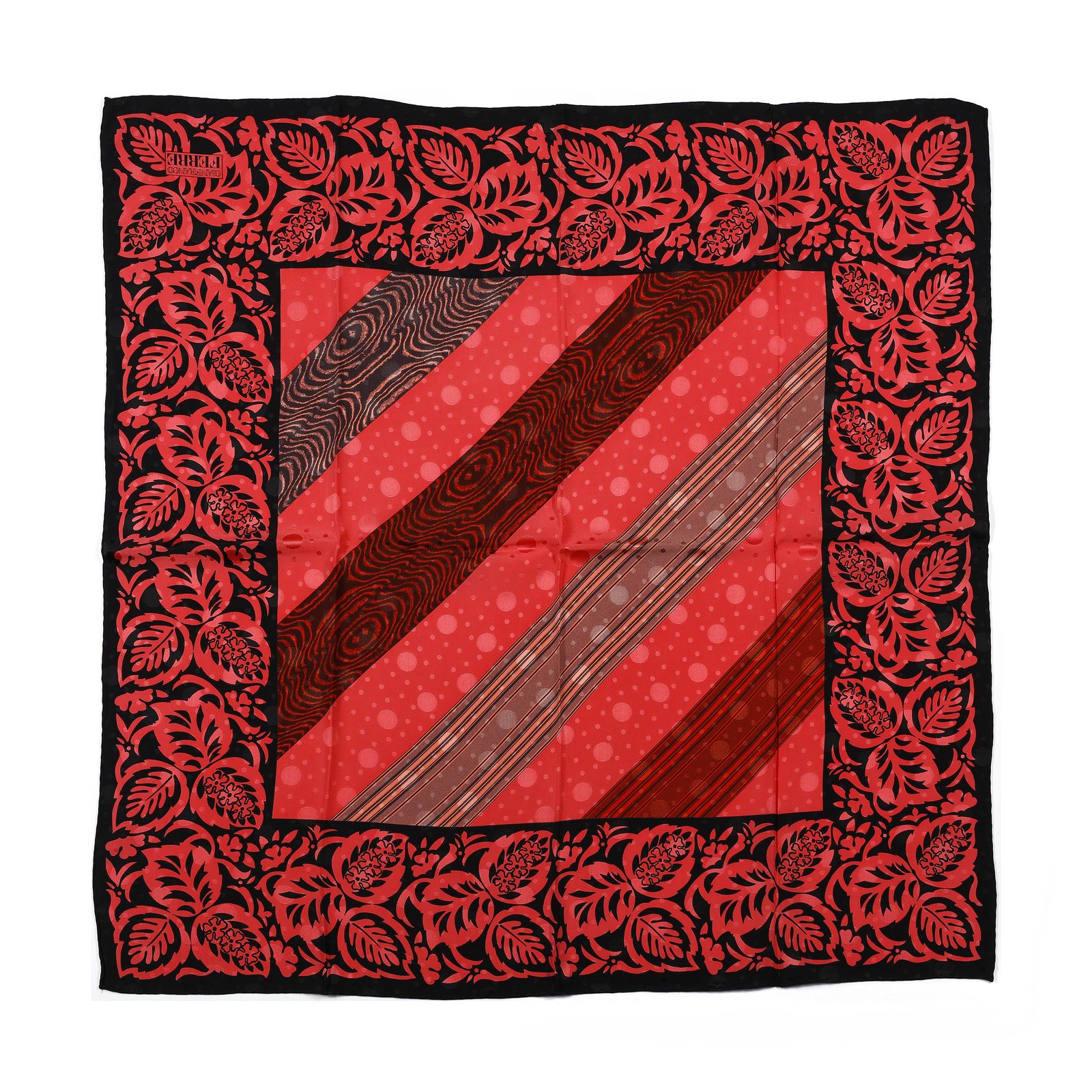 FERRE' GIANFRANCO Foulard nero e magenta. Seta. Cm 80,00 x 80,00. Decoro floreale nei toni del nero e del magenta. Firmato Gianfranco Ferré in un angolo.