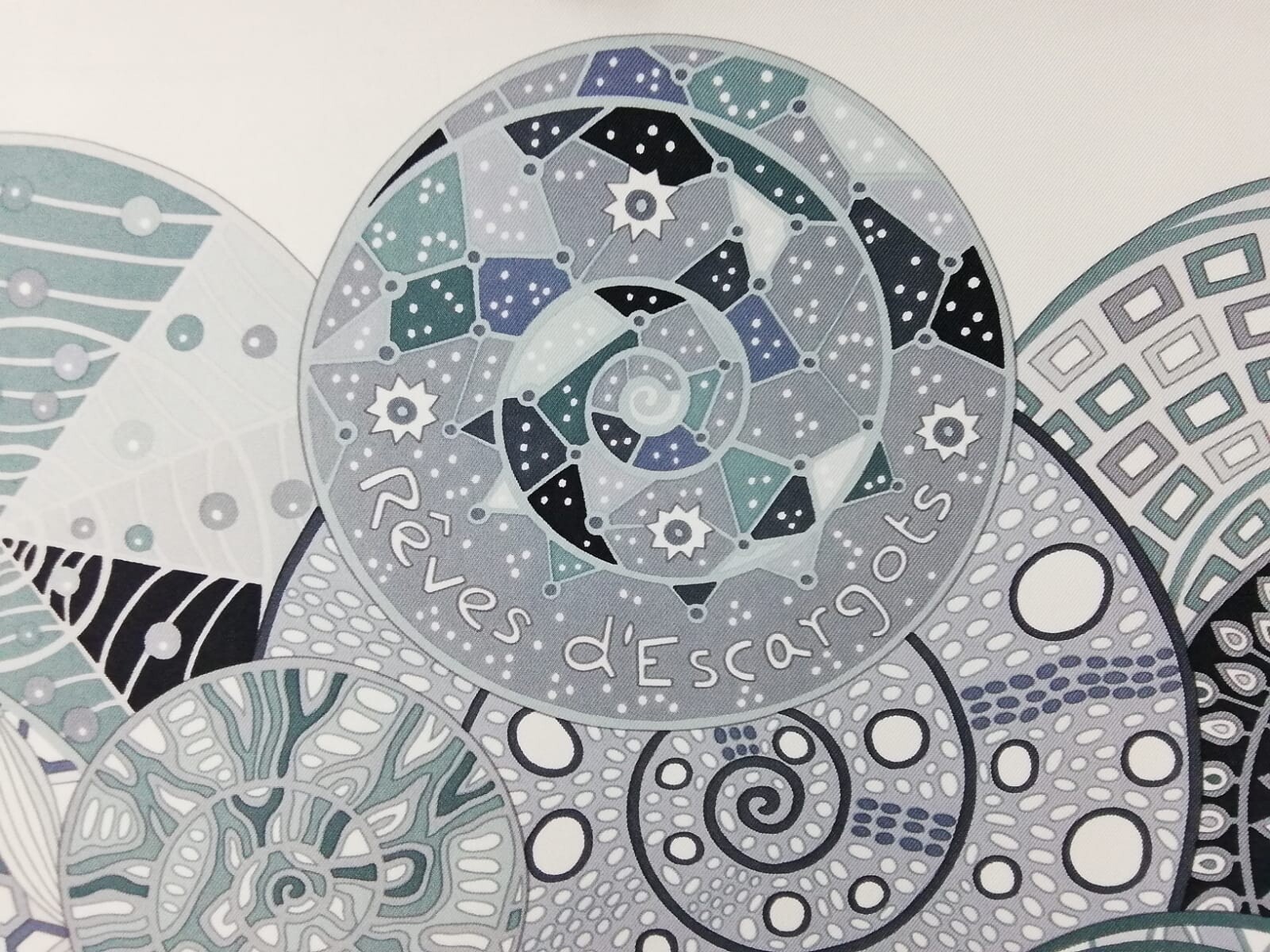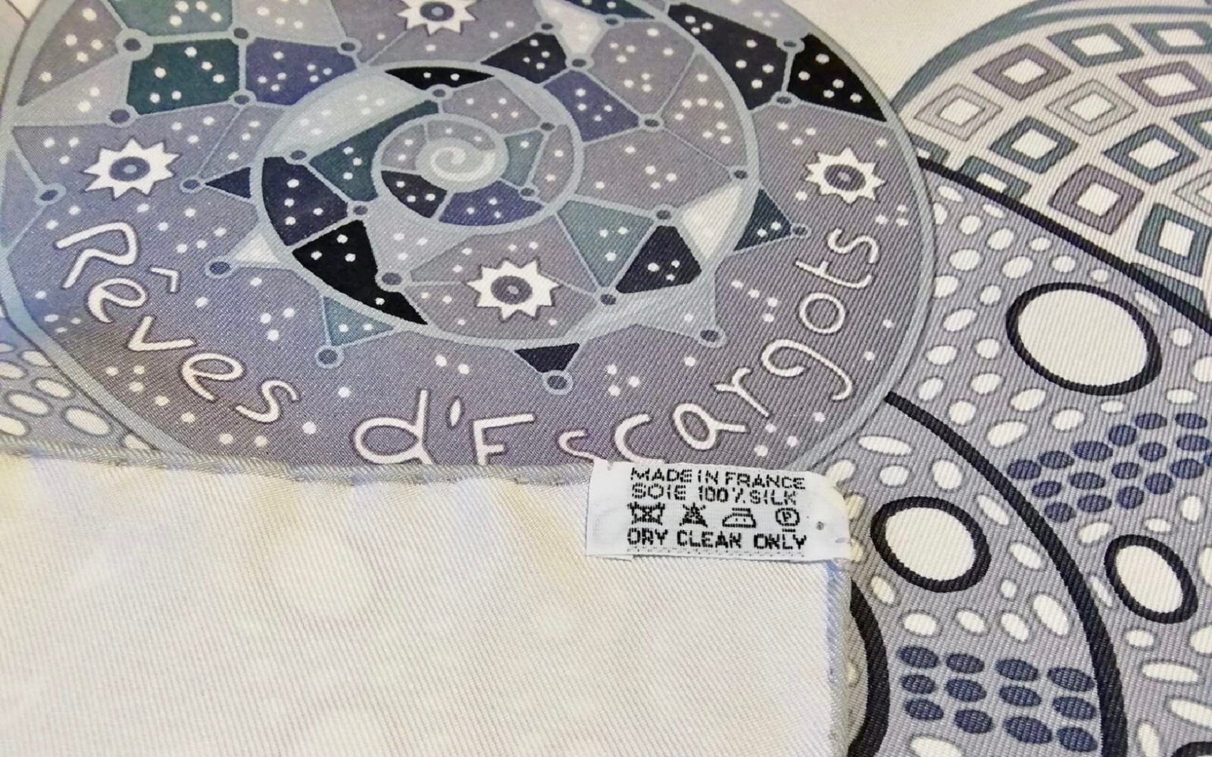 HERMES Foulard carré in seta "Reve d'escargots". 2012. Seta. Cm 90,00 x 90,00. Foulard in seta 100% nei colori del bianco, nero grigio. Disegnato da Christine Henry nel 2012. Firmato. Con etichetta. Copyright. Made in France. Orlo arrotolato a mano. Condizioni eccellenti.