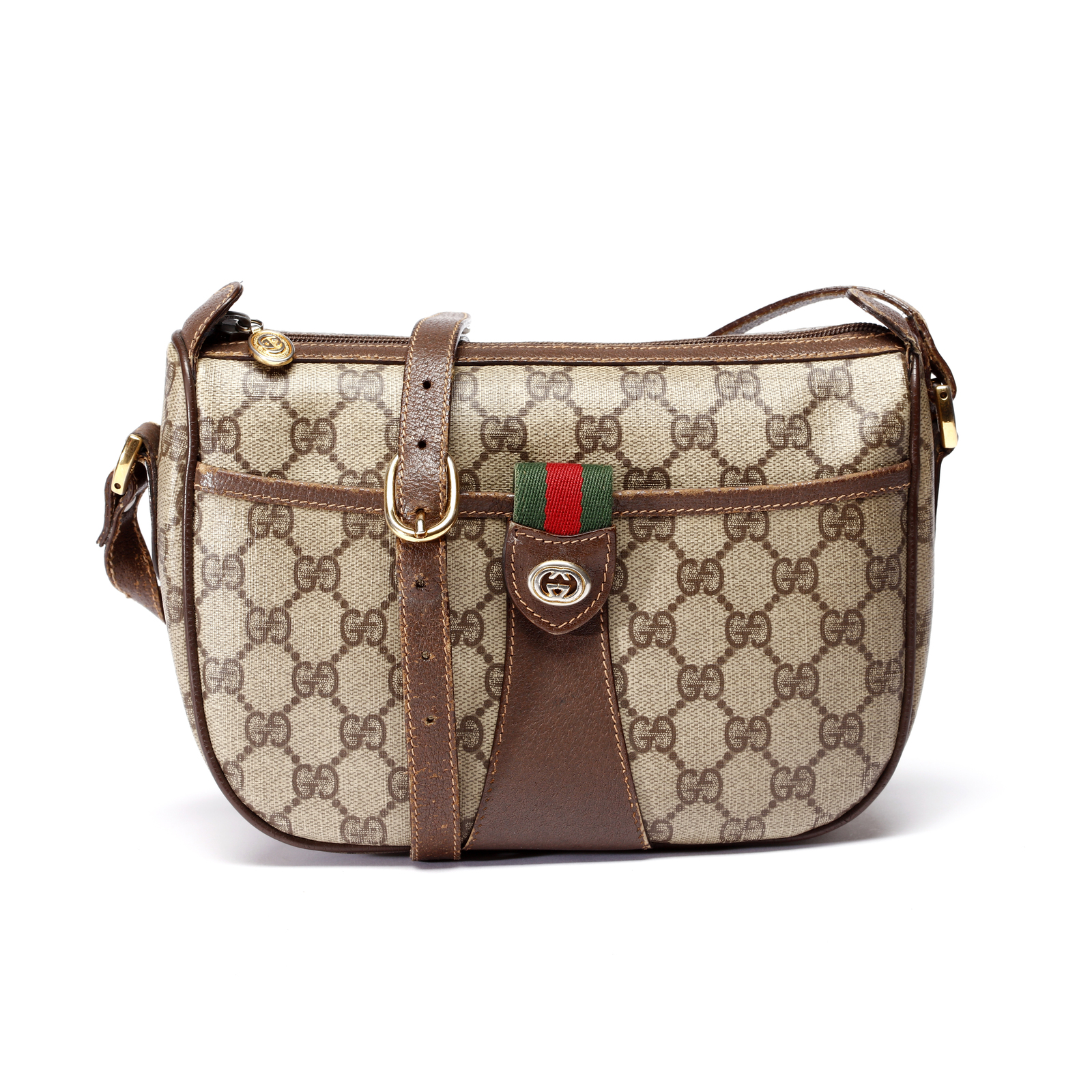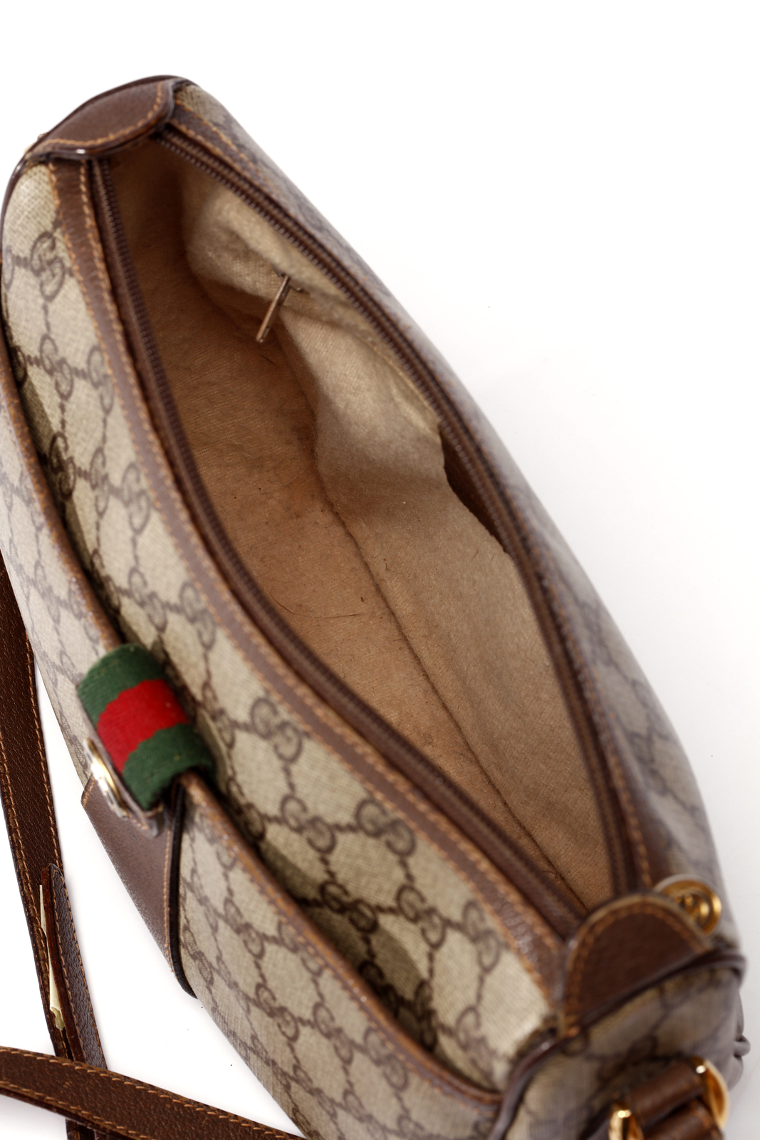 GUCCI Borsa. Tessuto e pelle. Cm 18,00 x 25,00 x 10,00. Borsa monogram GG Guccissima in canvas con profili e tracolla regolabile in pelle. Chiusura a zip, Logo Gucci frontale e sulla chiusura, dettagli in metallo colore dorato, tasca interna con chiusura a zip, Codice articolo 89.02.032. Metà anni 80. Segni del tempo.