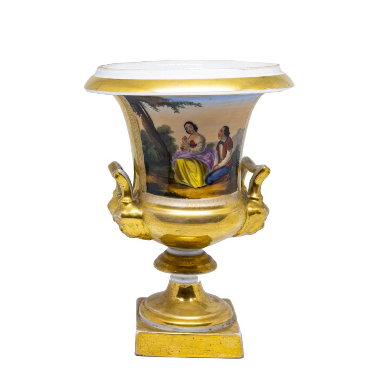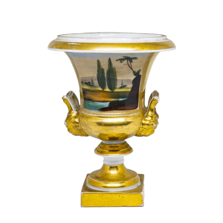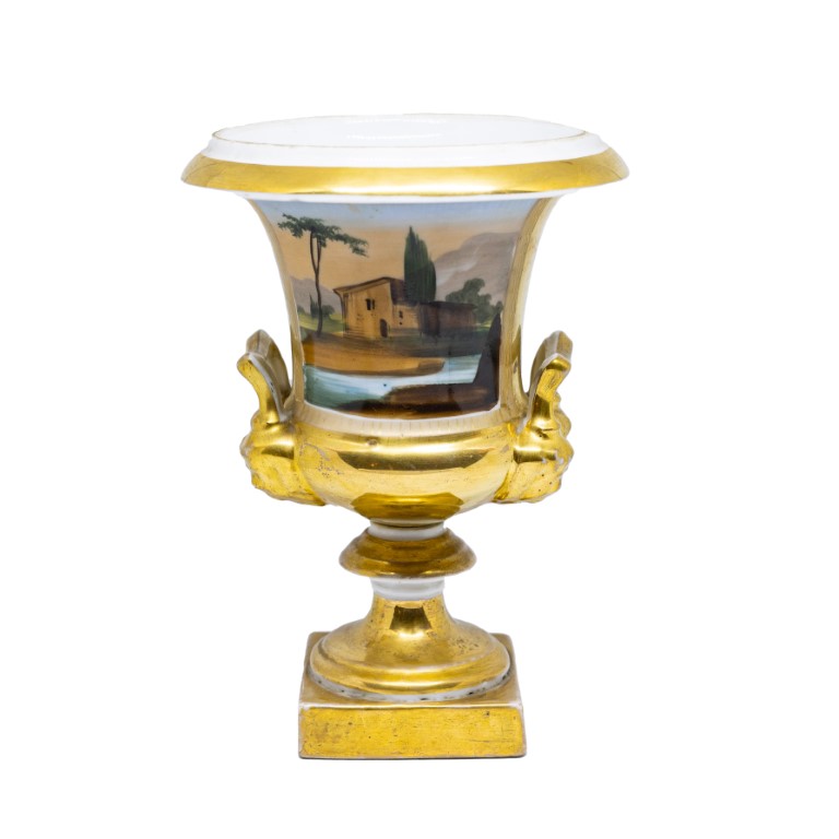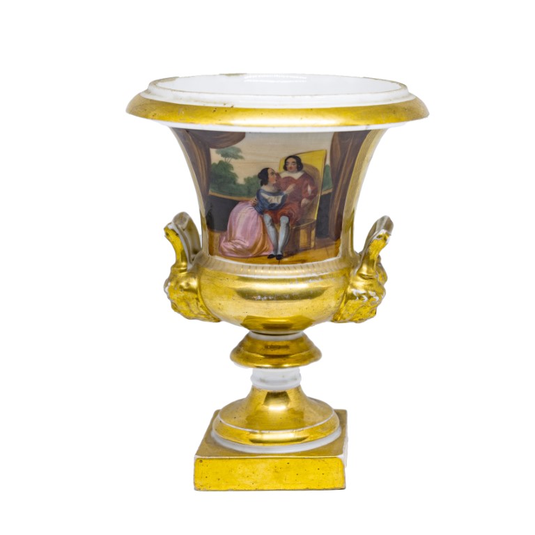 modellati ad anfora con anse a cigno, dorati e dipinti con scene cortesi e paesaggi
