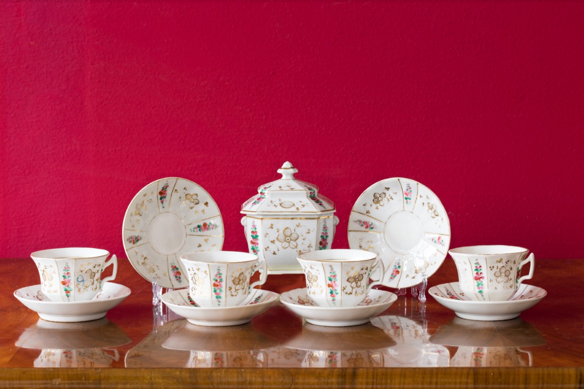 dipinto a motivi floreali, composto da 10 tazze con piattino, con zuccheriera en suite