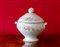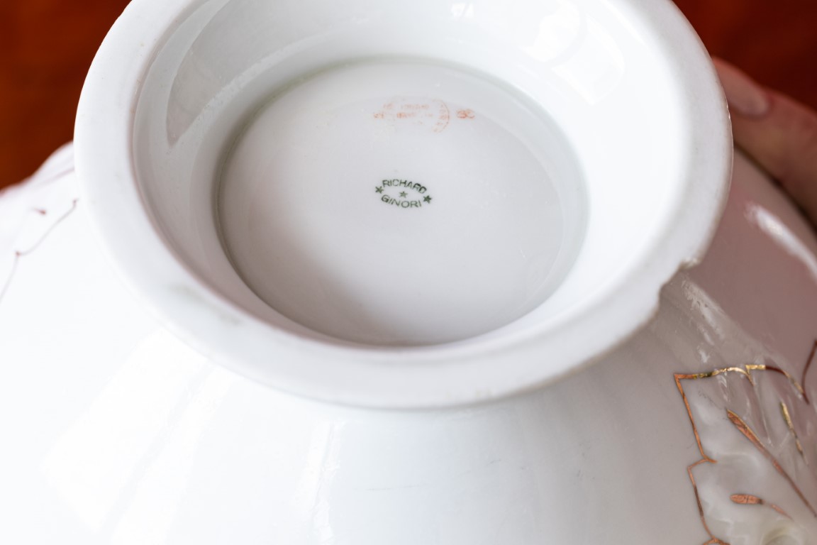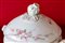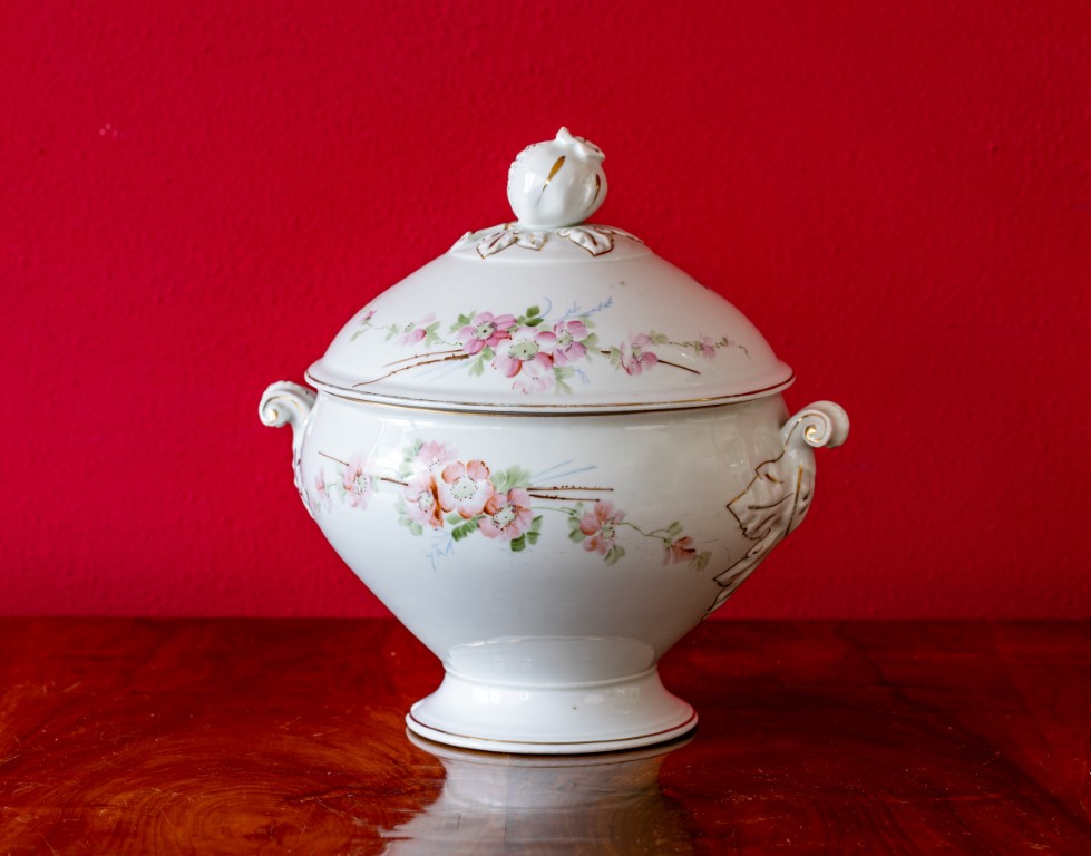 decorata a motivi floreali, coperchio con presa a melograna, bordi e profili con filo oro